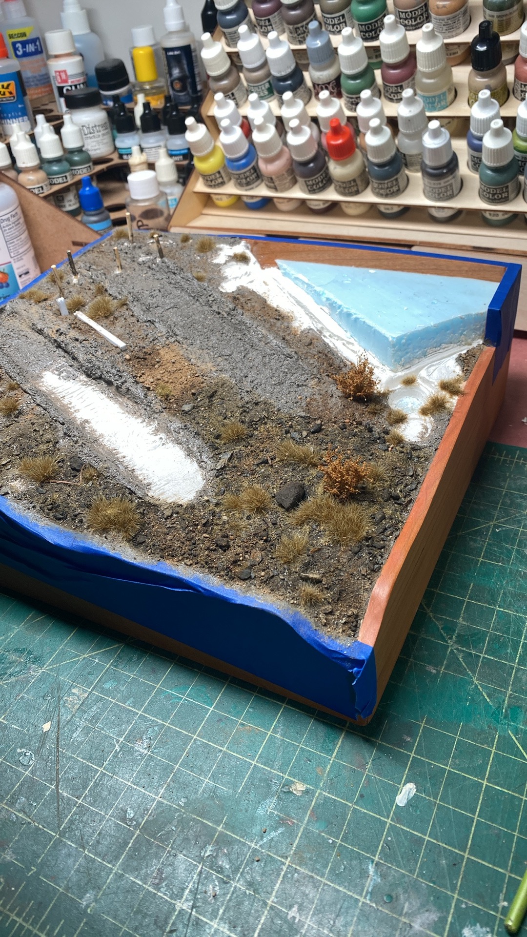 I thought it might be snowy. This is cool as well!So no cracking and minimal shrinking at the edges. I have coated with AK turned earth gritty acrylic paste then a mixture of garden soil, small stones, sand, static grass and small roots chopped up with the hobby knife. I have also added silflor tufts and polak bushes. This will all get painted to unify things.