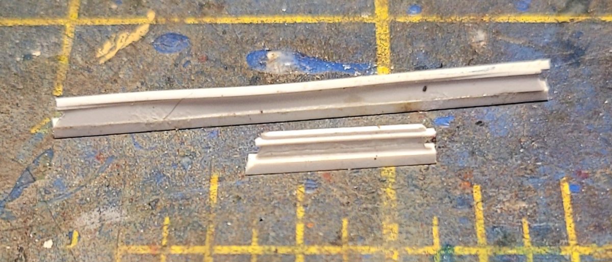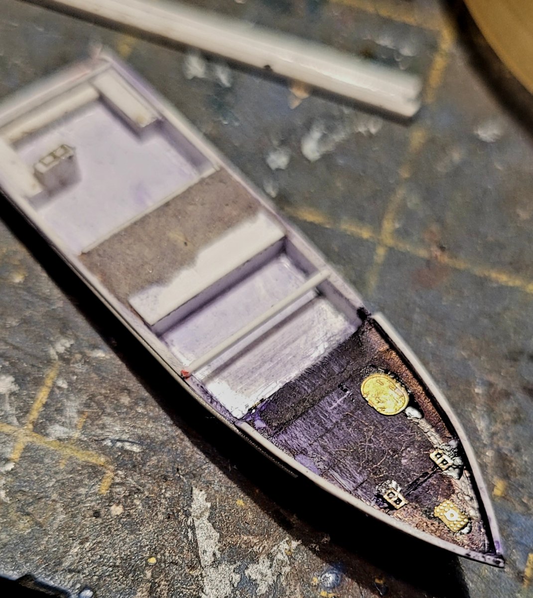There are beams that run form side to side, dividing the cargo areas and strengthening the sides of the boat. I womped up some T-beam from .010 X .020 plastic strip to to mold to make the 60-footer as accurate as possible.
