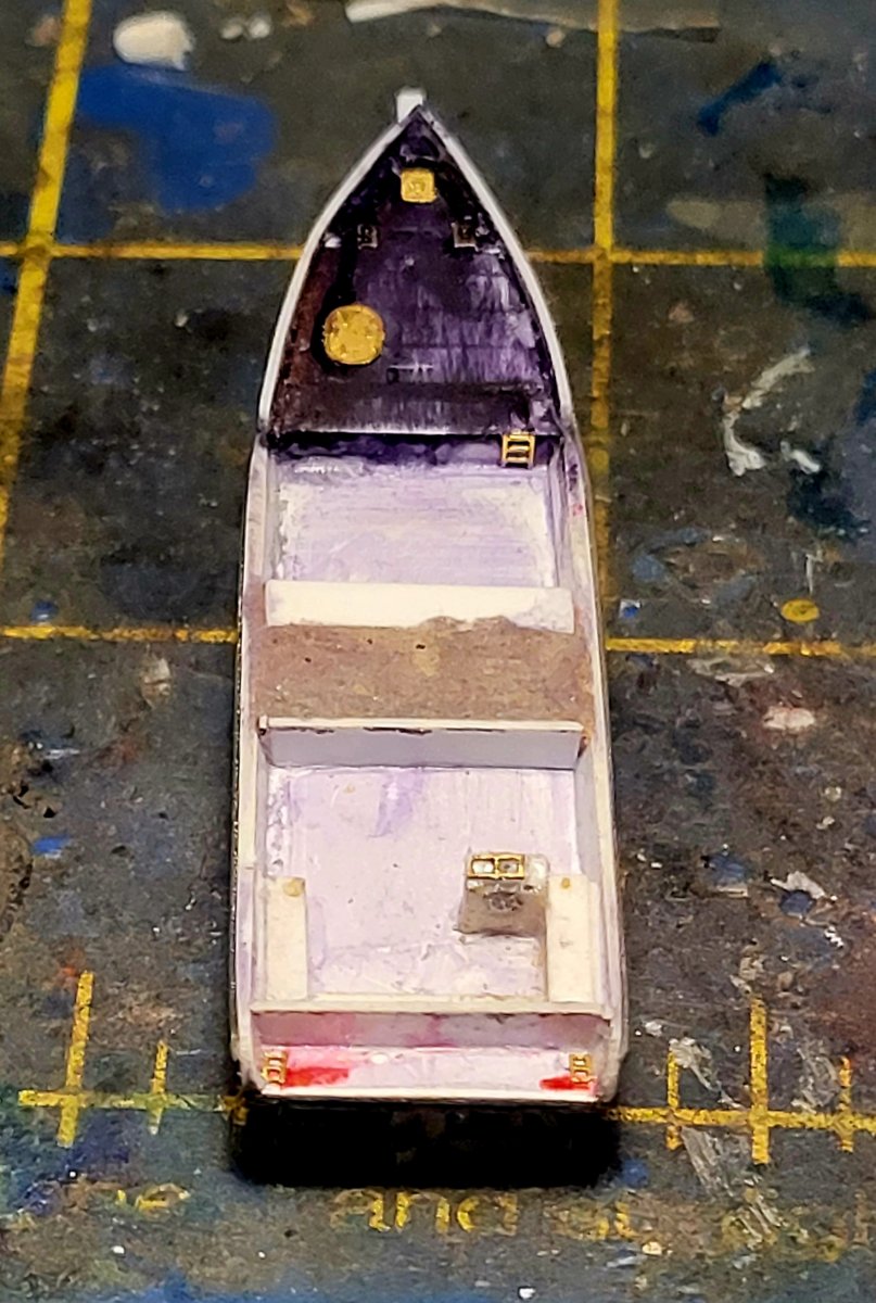 The 1/350 Master is done. MFD, chart plotter and wheel on the helm with room for a RH throttle. I considered fore and aft towing bitts, but decided that was "too Coast Guard" for a Cartel drug runner. I expect to mount 5 200 hp outboards on the stern. It would take a very plucky USGC OTH boat to catch this monster!