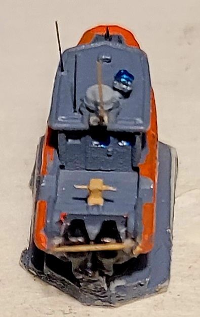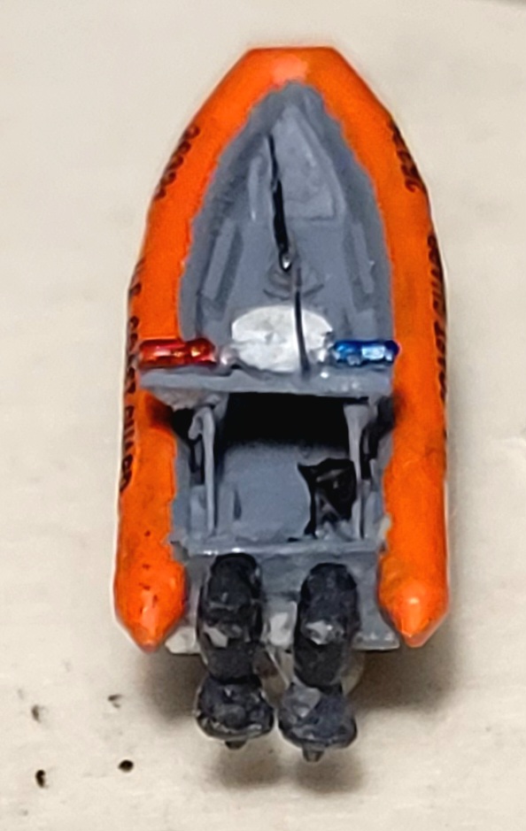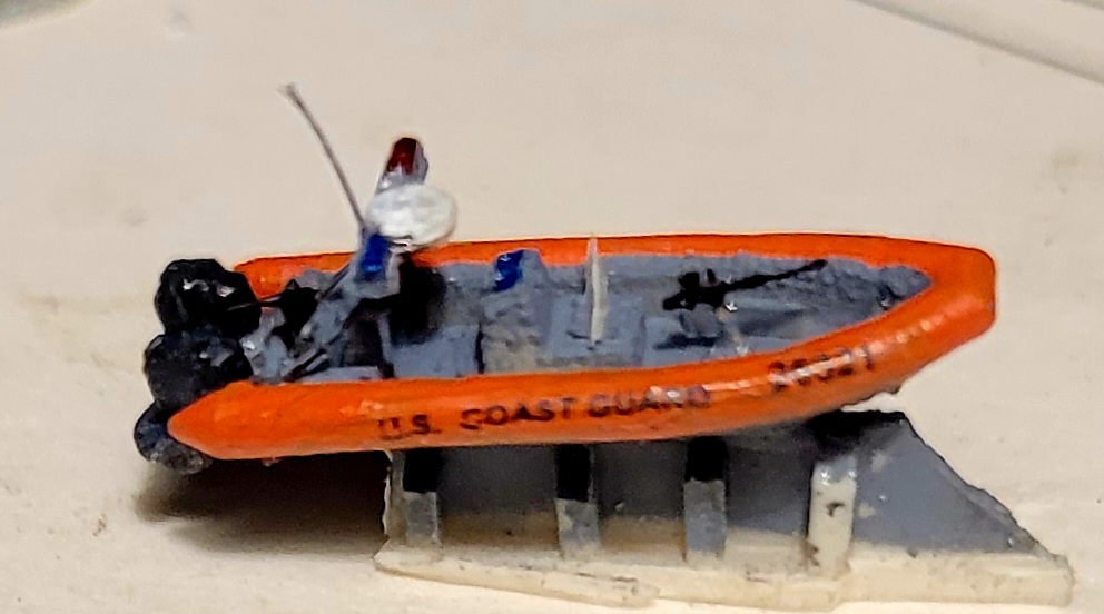 USCG Port Security Unit boats come in a variety of configurations. This example is an RHI, powered by 2 225 hp. outboards, like her Defender class cousin. I found 1/700 p/e 13mm guns make passable M240's in this scale. Adding a bit of plastic strip ammo box to the LH side of the guns helps sell it.