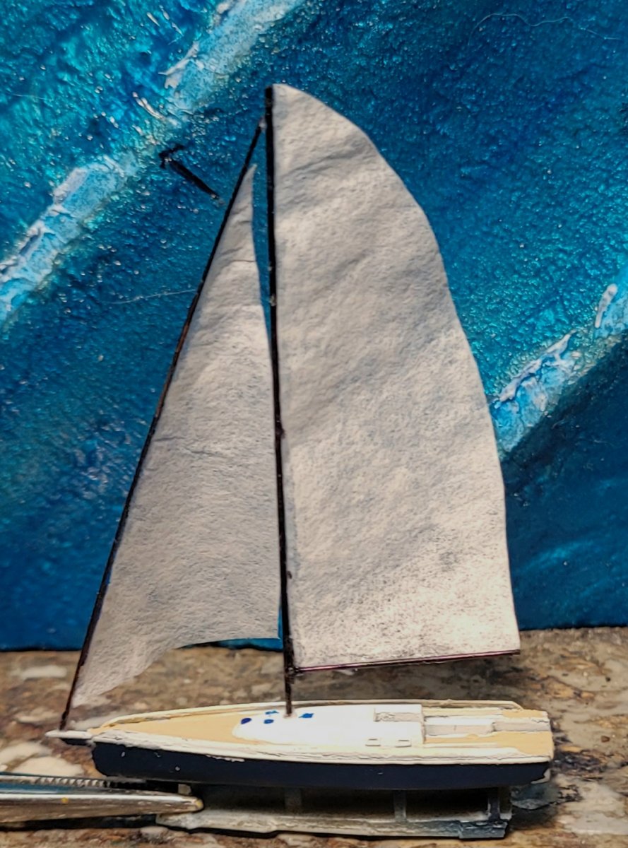 Ongoing progress on the 1/350 J/45. The headsail (front sail) is a shade too short, but may suffice for box artwork. She lacks the handrails and powered winch drums of the real thing. As usual, the kit contents are constructed for instructional purposes.