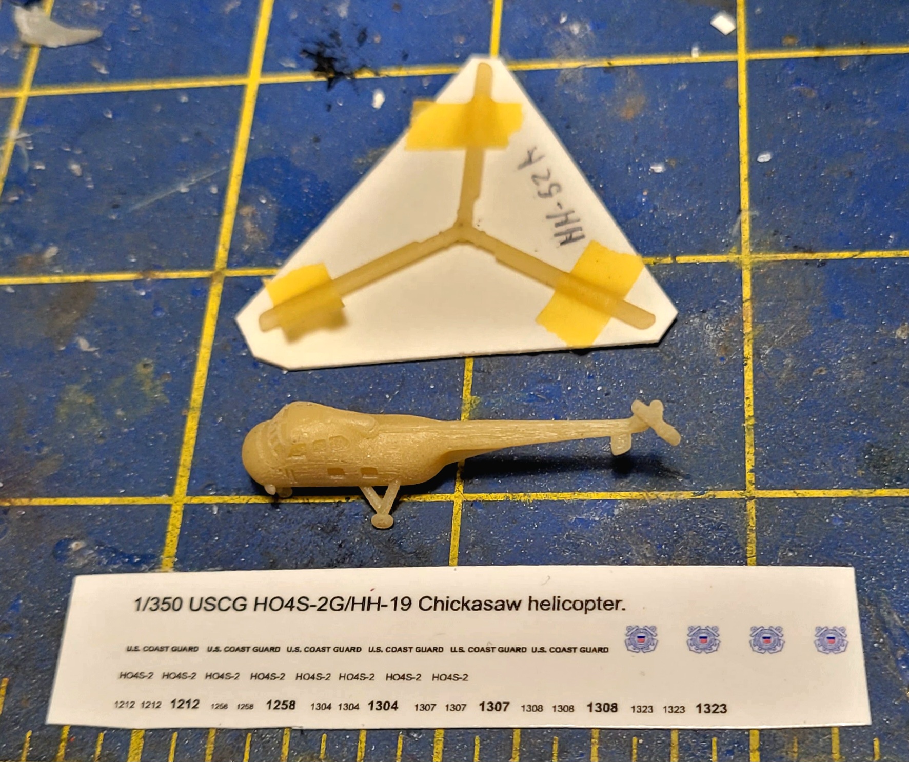 Markings for 6 different Coast Guard Chickasaw Helicopters from 1951 to 1960! (The paint job changed in 1960) This 3D print has window, windscreen and engine vents in relief to ease detail painting and make very believable 1/350 egg-beater! Yes m'boy, the decal script is slightly overscale, so you can apply the decals without using a friggin' microscope AND so you can show them off to your fellows and say "Since Rhiner can do it, so can I! Nuthin' to it!" Rescue hoist not included. That you add yourself.