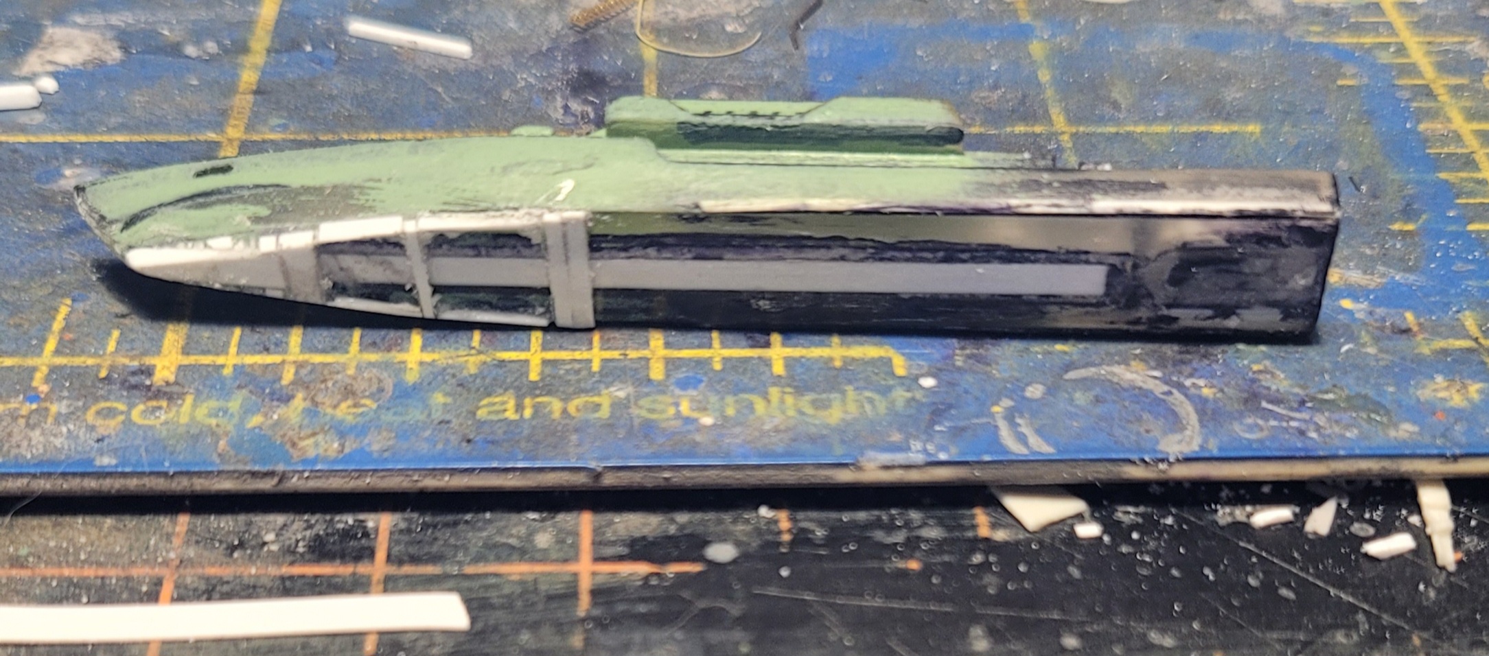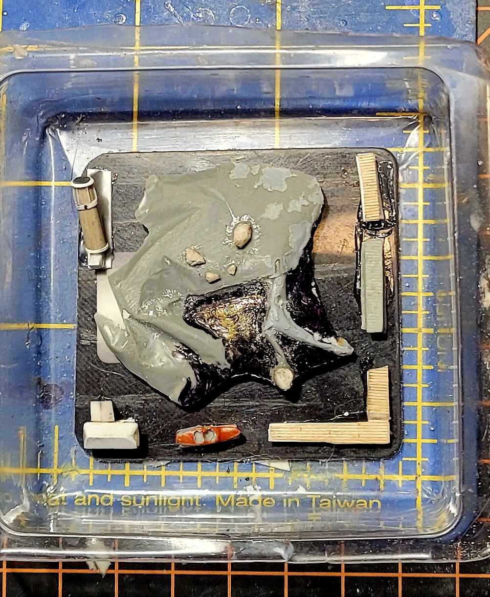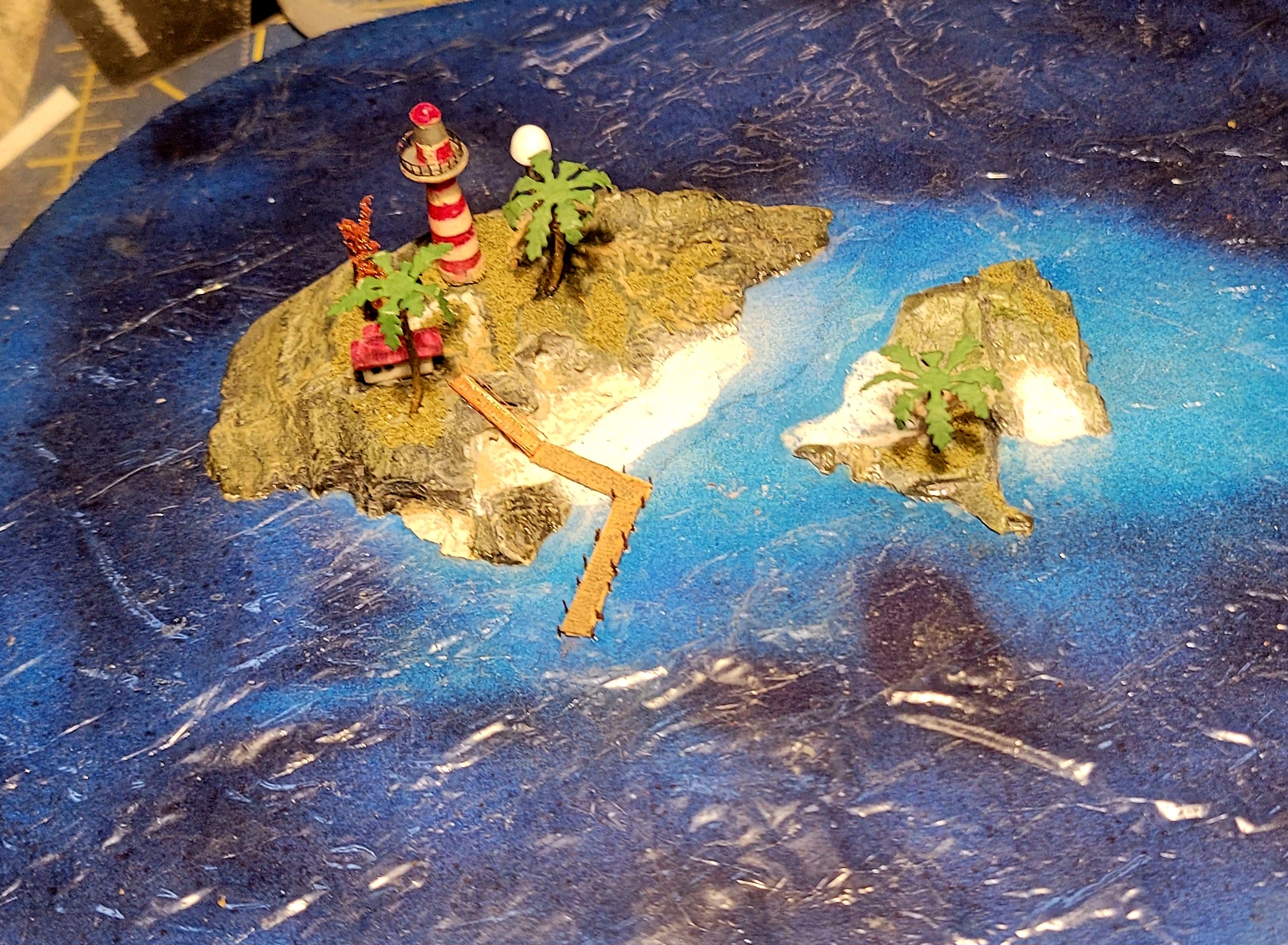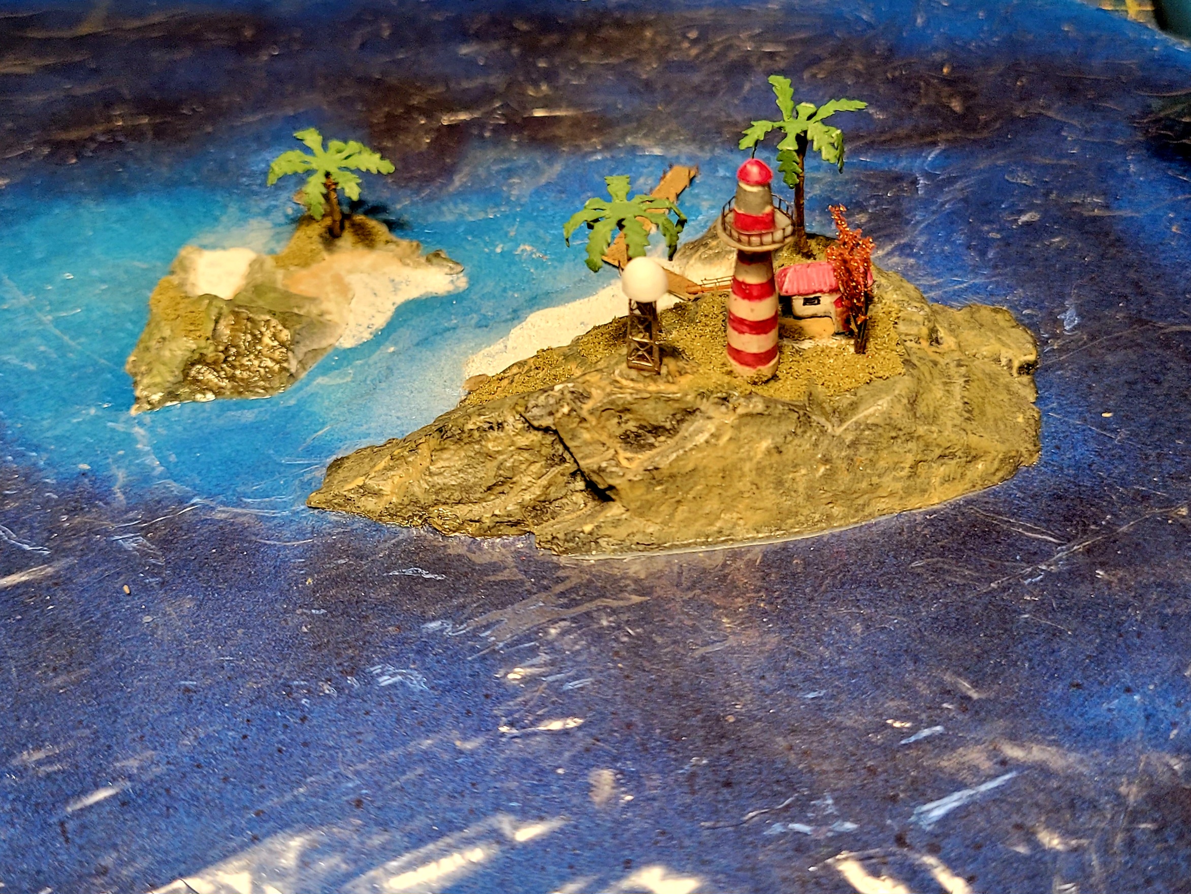 Proper pilings for the dock. Short bits of .008 wire sunk into the "sea bed". I've also prepared a weather radar (?!?) tower to go along with the meteorological duties a lighthouse keeper be responsible for. Some vegetation and few palm trees may also be included to make the islands look less nekkid. Oh! The beaches are tile grout stuck to Future.