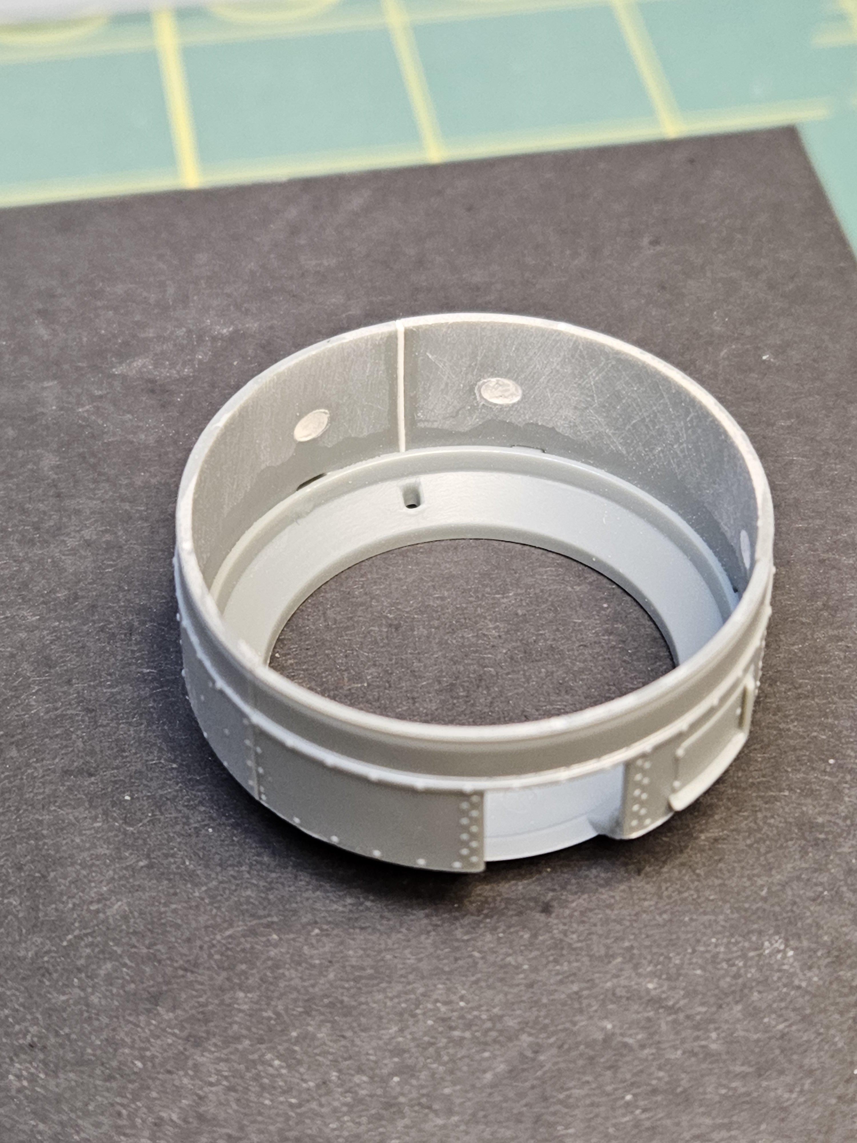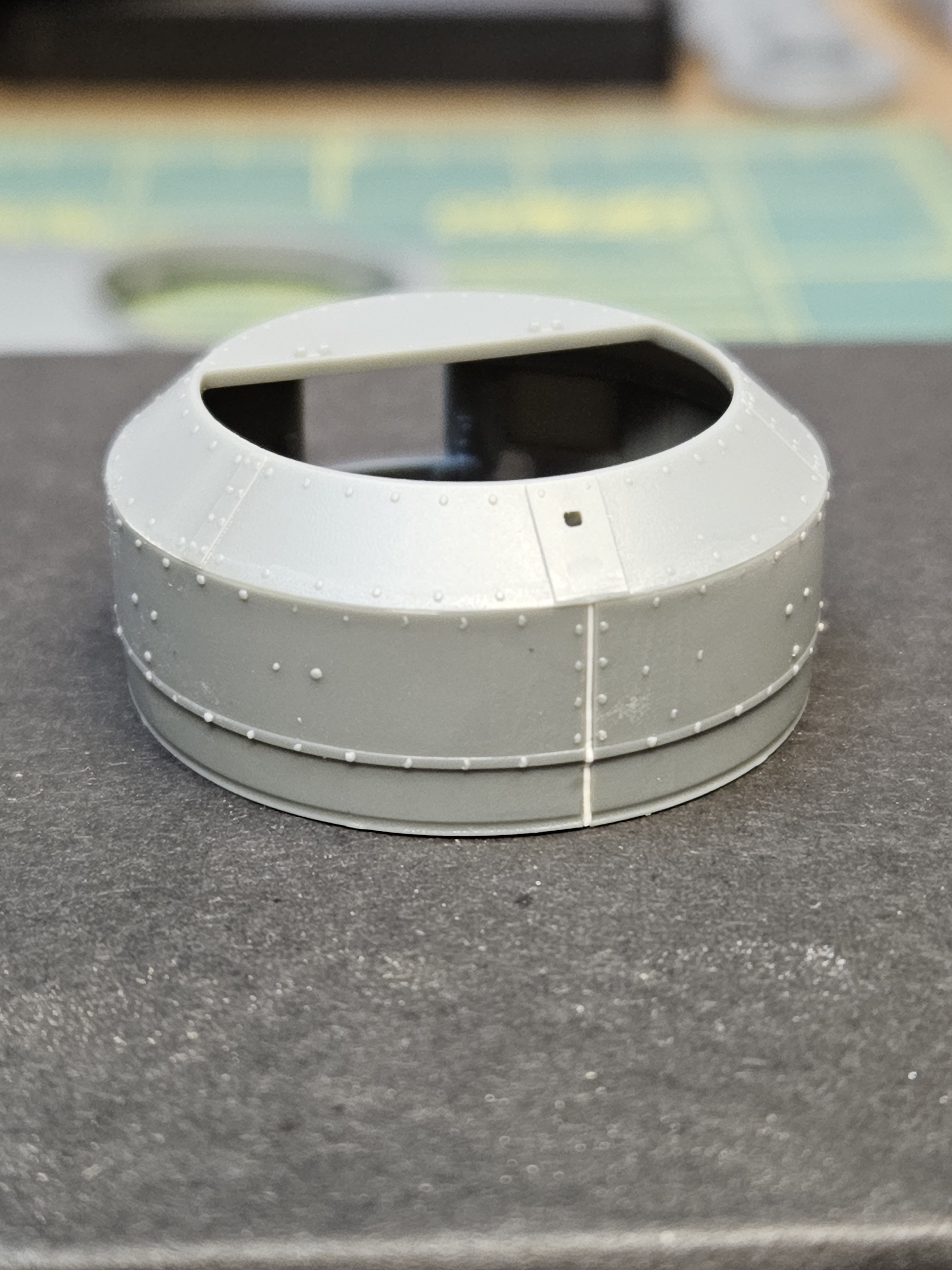 The next issue I encountered was the turret. It's made up of three parts that when glued up make the vertical sides of the turret. Problem is they didn't meet up all the way, leaving a slight gap. I was able to put in a strip of styrene that filled the gap, without losing any rivet detail. View attachment 158410View attachment 158411