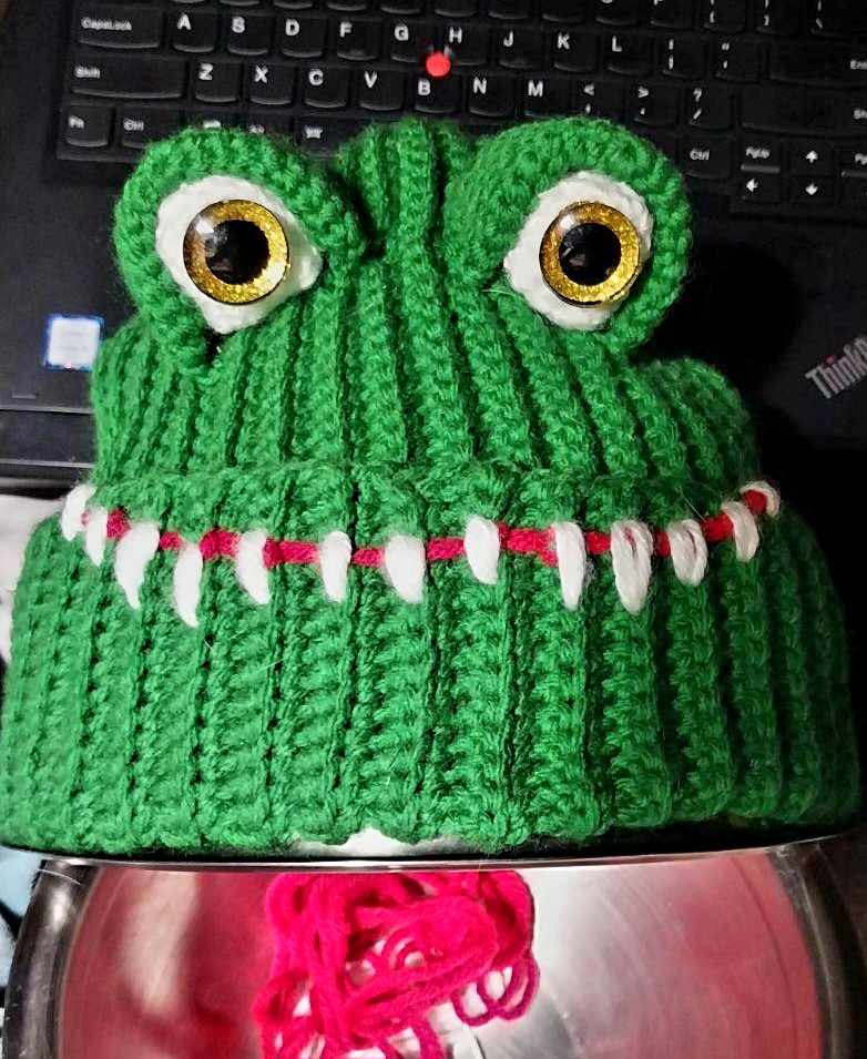 We were watching Rudolf the Red-Nosed Reindeer on the Blu-Ray the other night, and I realized my apprentice is, in fact, the Bumble Snow Monster of the North. In a few hours, she produced a warm, soft Bumble Snow Monster beanie for Big Tim Clark.