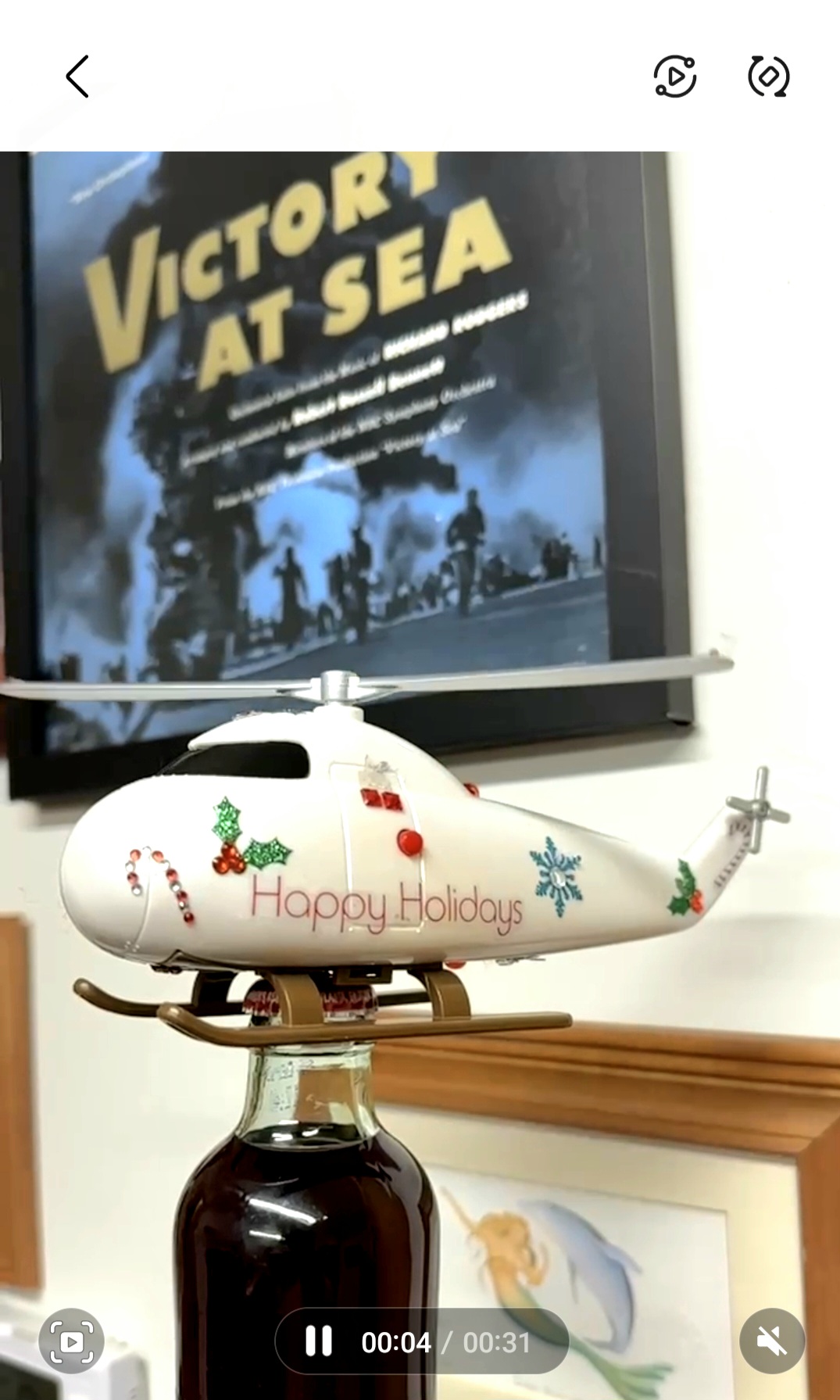 I wondered if the markings were Israeli Snowflake/ Happy Holidays. Mark said it wasn't intentional. This was an mp4 video, it shows the main rotor spinning, but so far the helo has been unable to lift the bottle of Christmas "spirits". I watched his video 4 times, and still nuthin'.