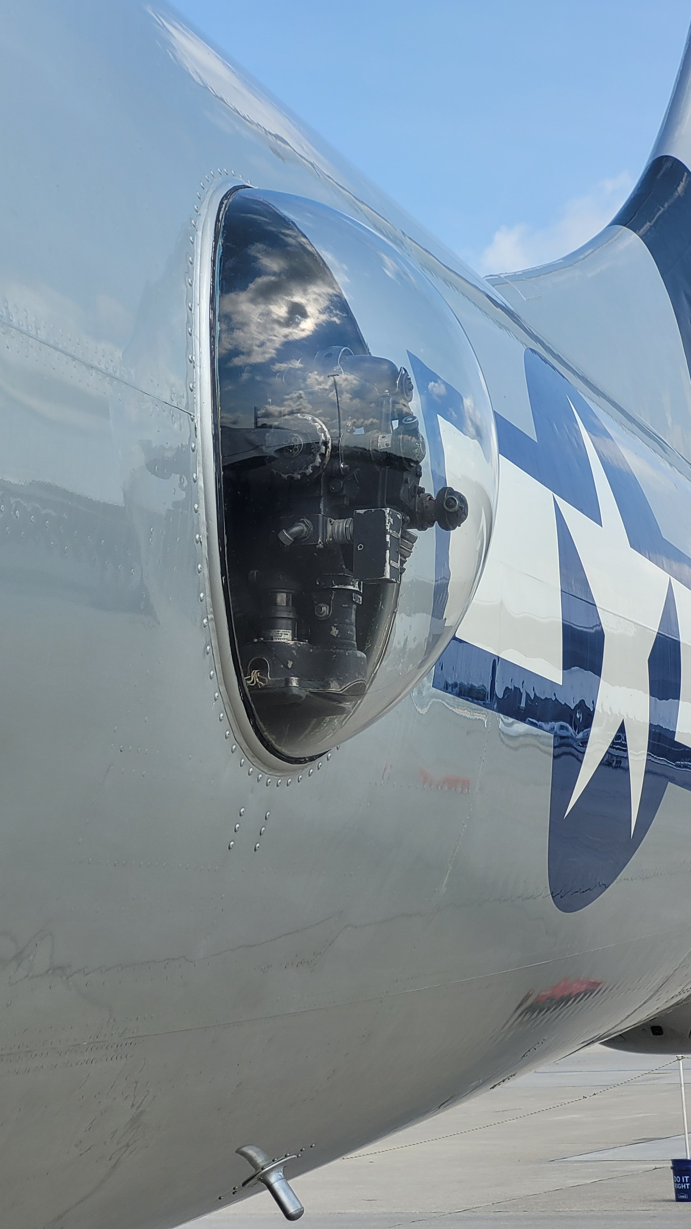 Waiting in line to tour FiFi . I never had a tour before! Too cool! You are met by FiFi's Crew chief, a grizzled USAF vet from Arizona. I asked how he came to join the crew of the longest serving B-29 in the United States and he told us. I should have taken some notes! You may notice, Goofy left his gloves in the forward bomb bay. FiFi is painted silver except for areas that are exposed to heat. These are natural metal and cleaned regularly.