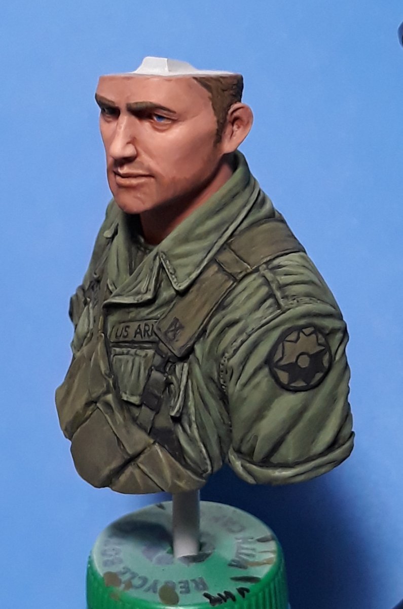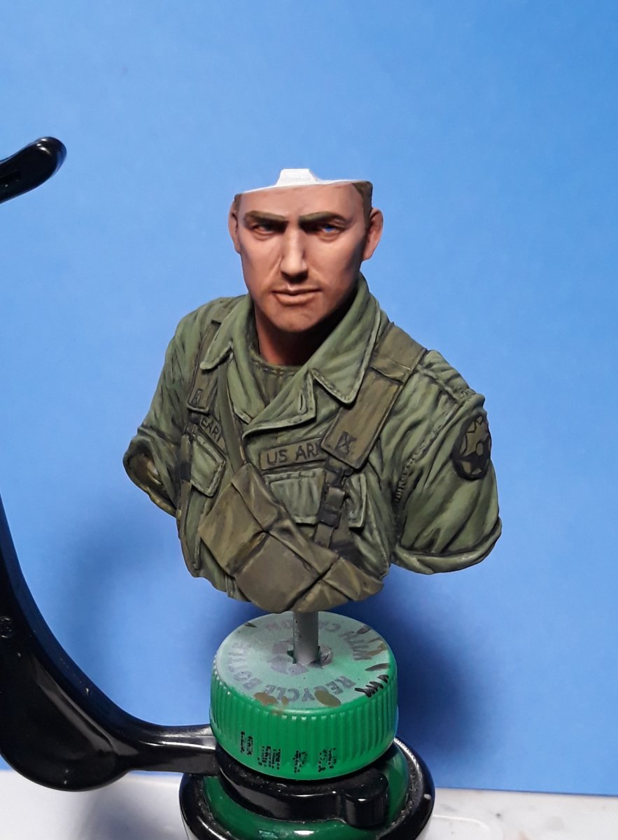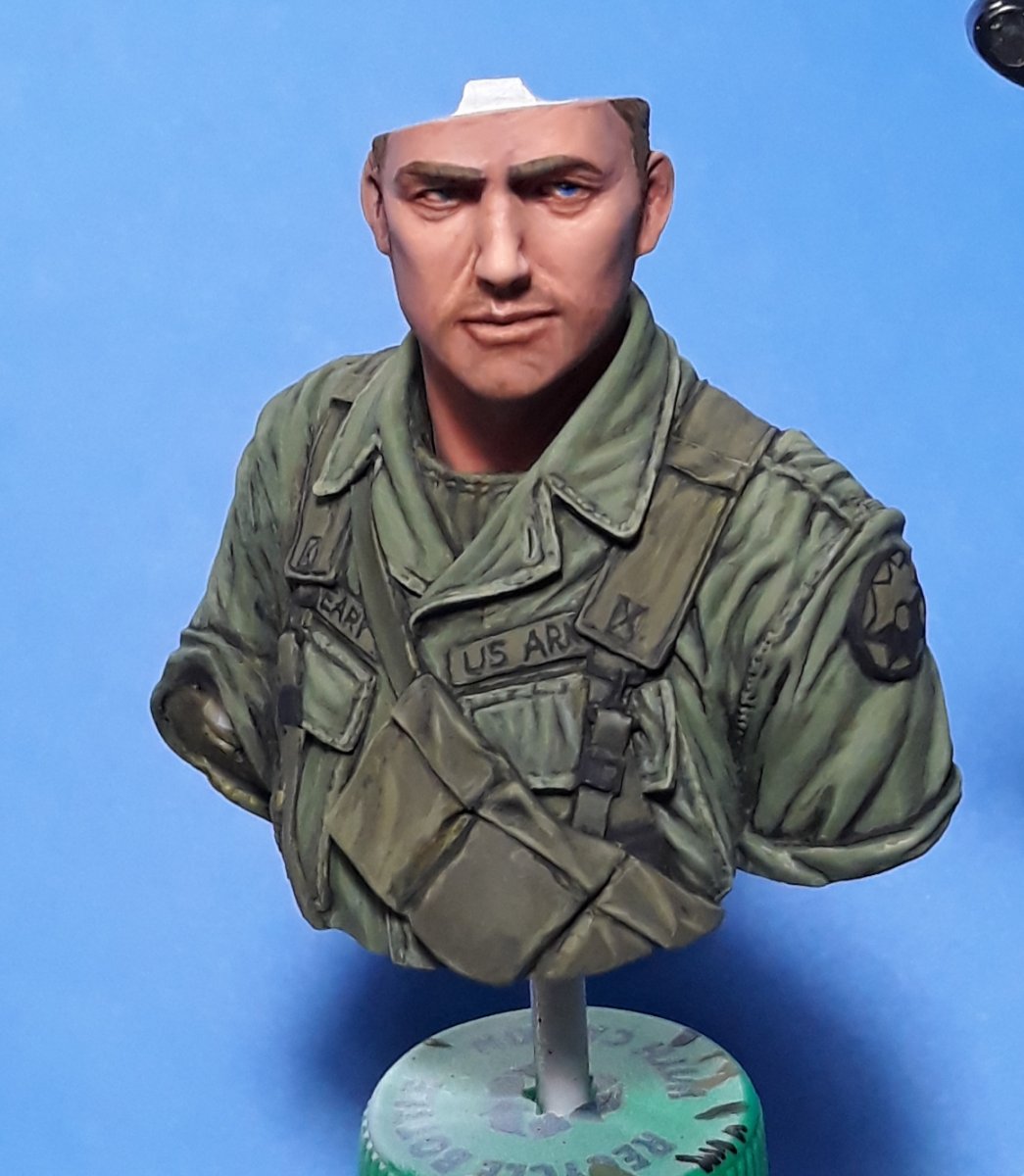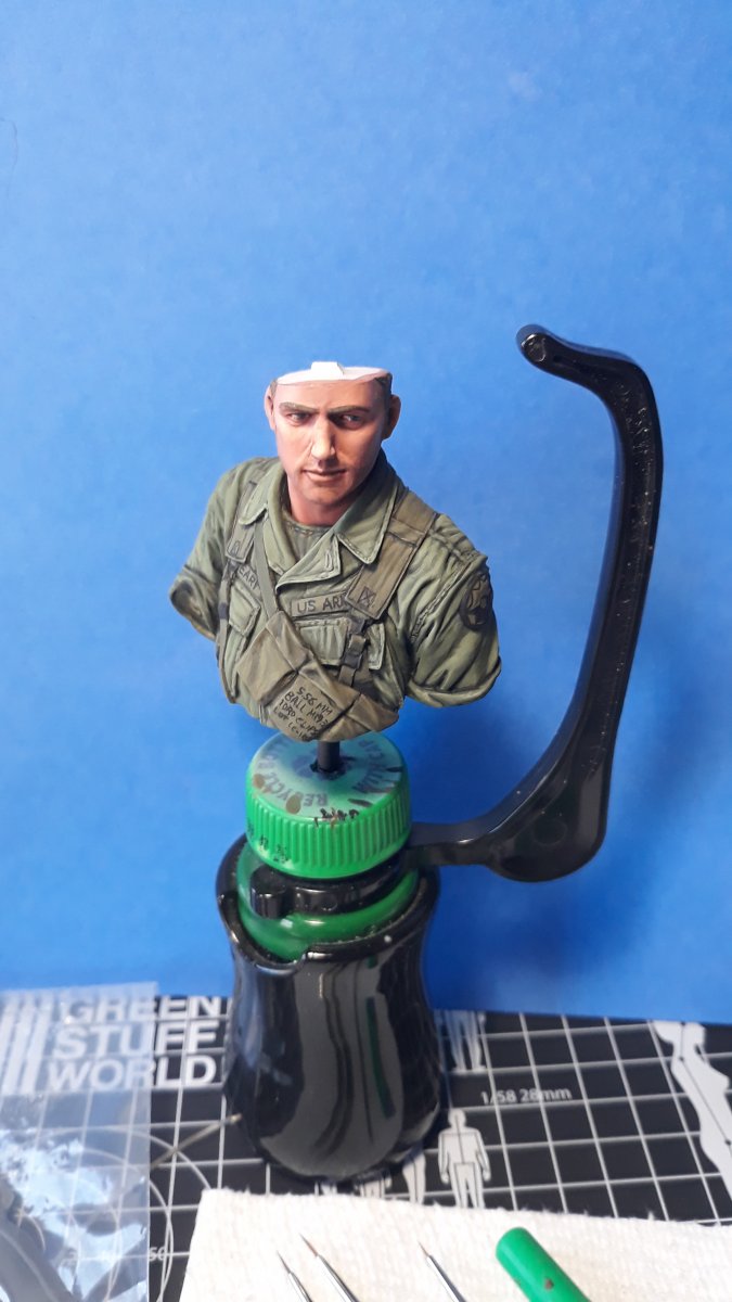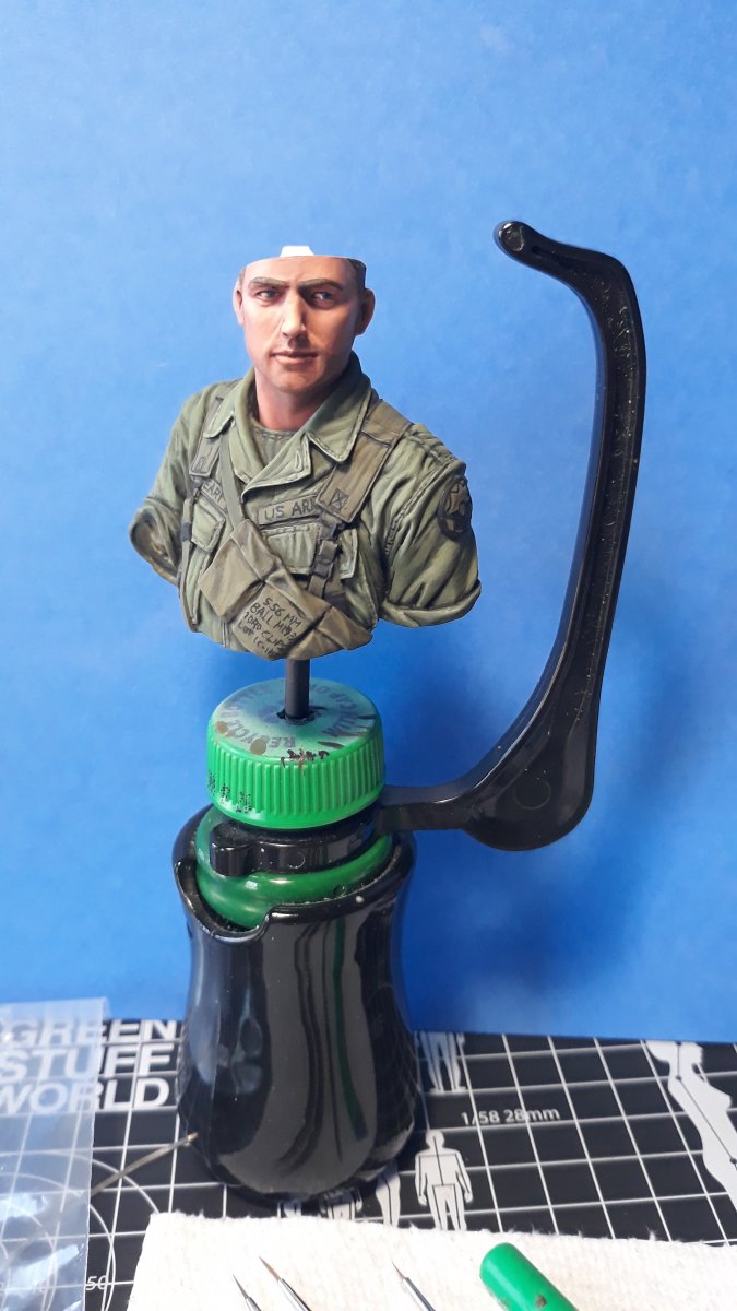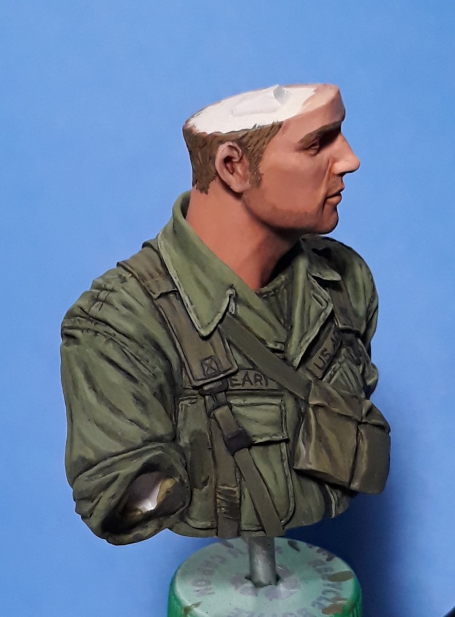 I decided to try out some of Calvin Tan's new face painting techniques that use AK Interactive's QuickGEN and GEN 3 paints. To do so, I am going to slightly convert and paint this bust from Young Miniatures. Instead of him being from the 1st CAV, I am scraping away the 1st CAV patch and will replace it with the 9th Infantry Division patch. I am also replacing the M16 with the M203 grenade launcher with just an M16. The bust does not have any grenade bandoleers nor a grenadier's vest, just a bulge in one of the pockets of the M16 bandoleer that indicates a 40mm grenade, but that is not how a grenadier would have carried his rounds. I am redoing that particular pocket to eliminate that feature.