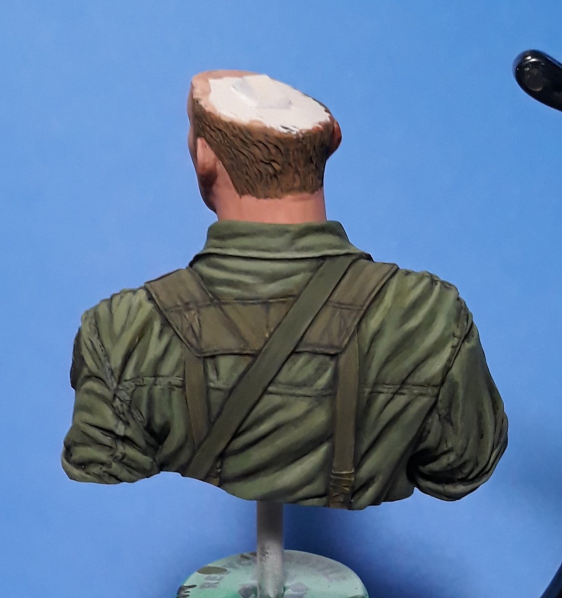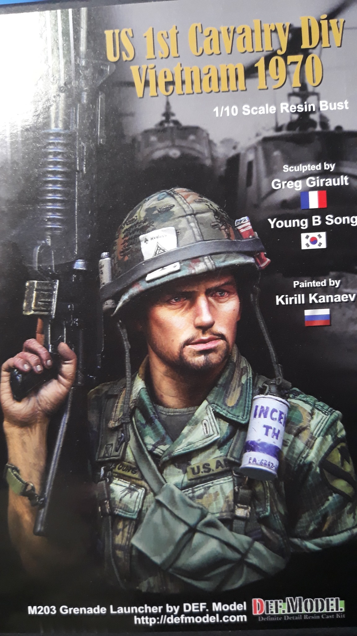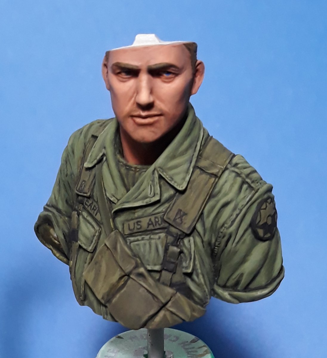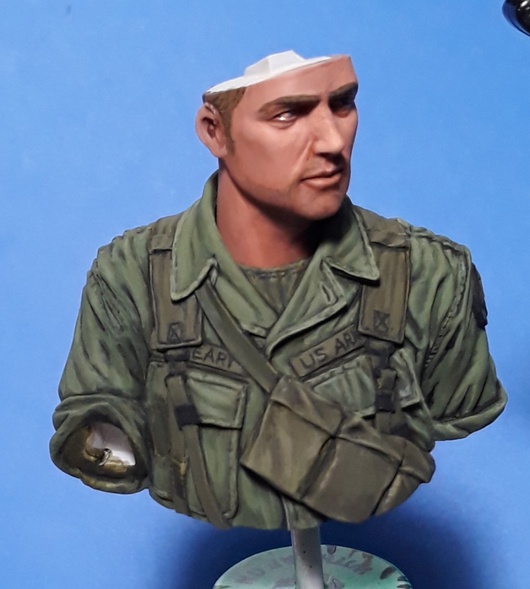 I decided to try out some of Calvin Tan's new face painting techniques that use AK Interactive's QuickGEN and GEN 3 paints. To do so, I am going to slightly convert and paint this bust from Young Miniatures. Instead of him being from the 1st CAV, I am scraping away the 1st CAV patch and will replace it with the 9th Infantry Division patch. I am also replacing the M16 with the M203 grenade launcher with just an M16. The bust does not have any grenade bandoleers nor a grenadier's vest, just a bulge in one of the pockets of the M16 bandoleer that indicates a 40mm grenade, but that is not how a grenadier would have carried his rounds. I am redoing that particular pocket to eliminate that feature.