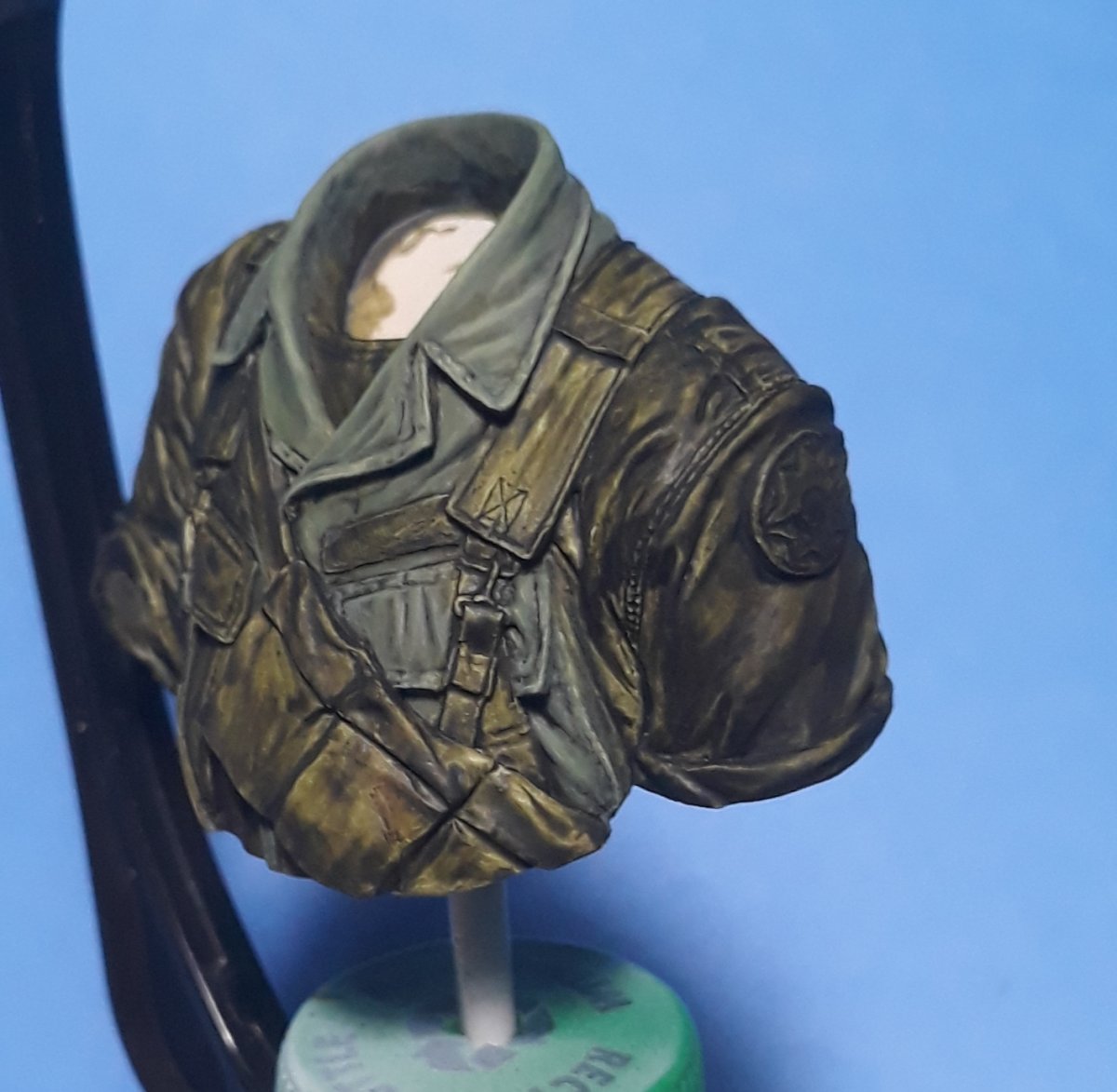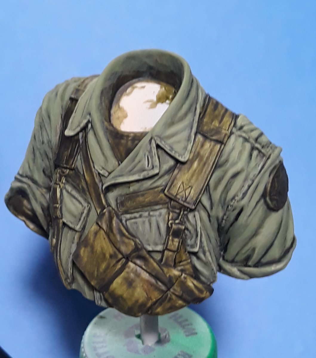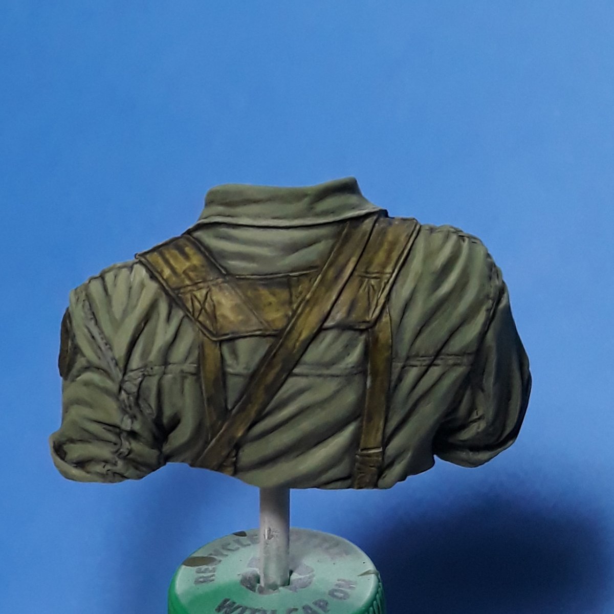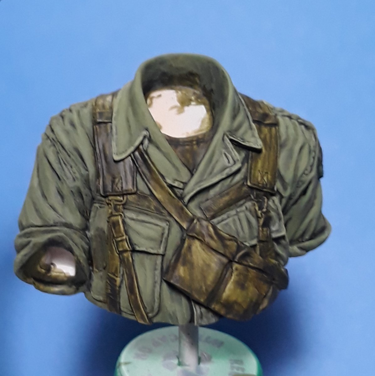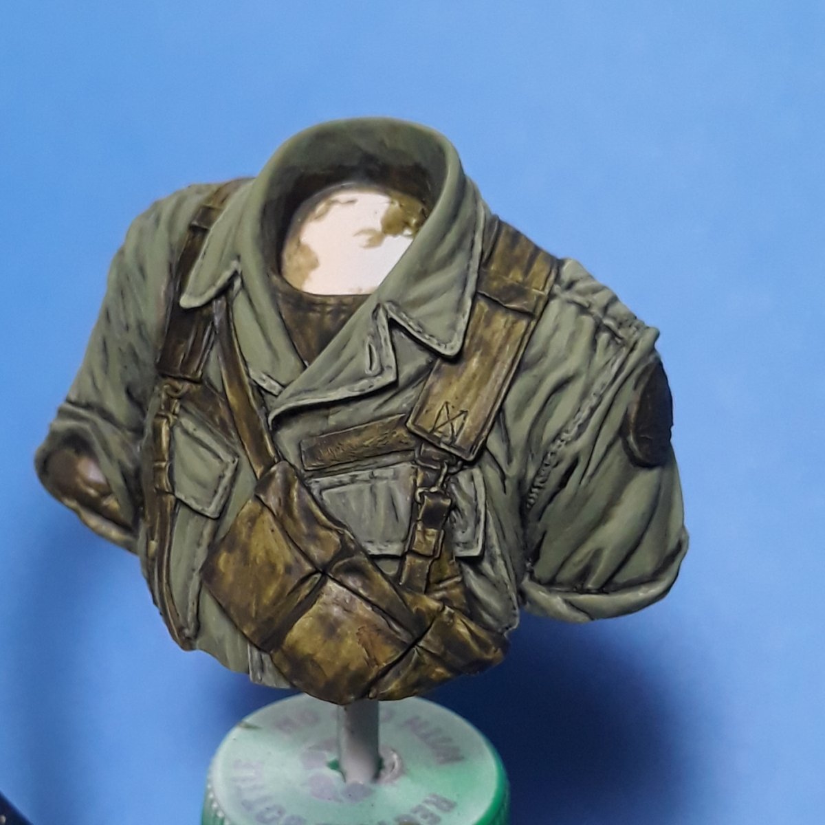 I decided to try out some of Calvin Tan's new face painting techniques that use AK Interactive's QuickGEN and GEN 3 paints. To do so, I am going to slightly convert and paint this bust from Young Miniatures. Instead of him being from the 1st CAV, I am scraping away the 1st CAV patch and will replace it with the 9th Infantry Division patch. I am also replacing the M16 with the M203 grenade launcher with just an M16. The bust does not have any grenade bandoleers nor a grenadier's vest, just a bulge in one of the pockets of the M16 bandoleer that indicates a 40mm grenade, but that is not how a grenadier would have carried his rounds. I am redoing that particular pocket to eliminate that feature.
