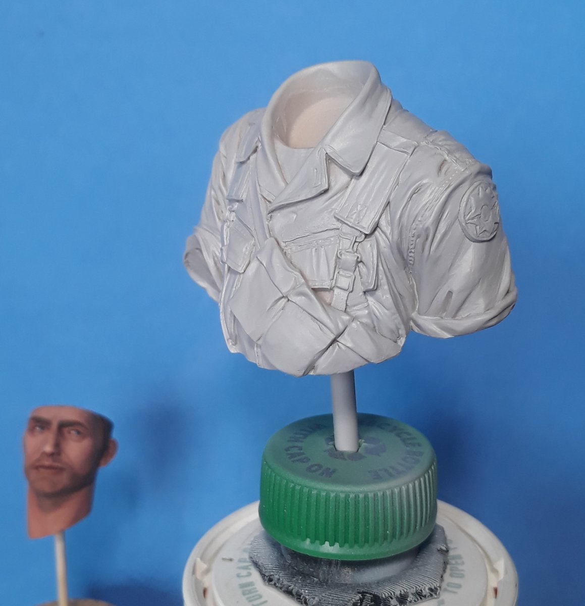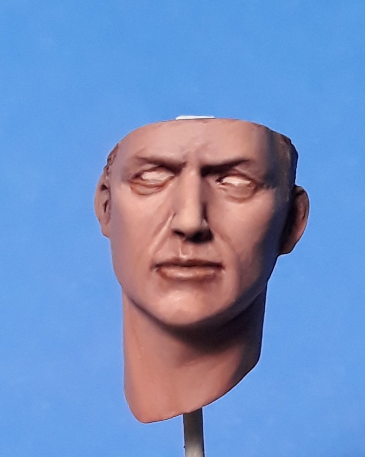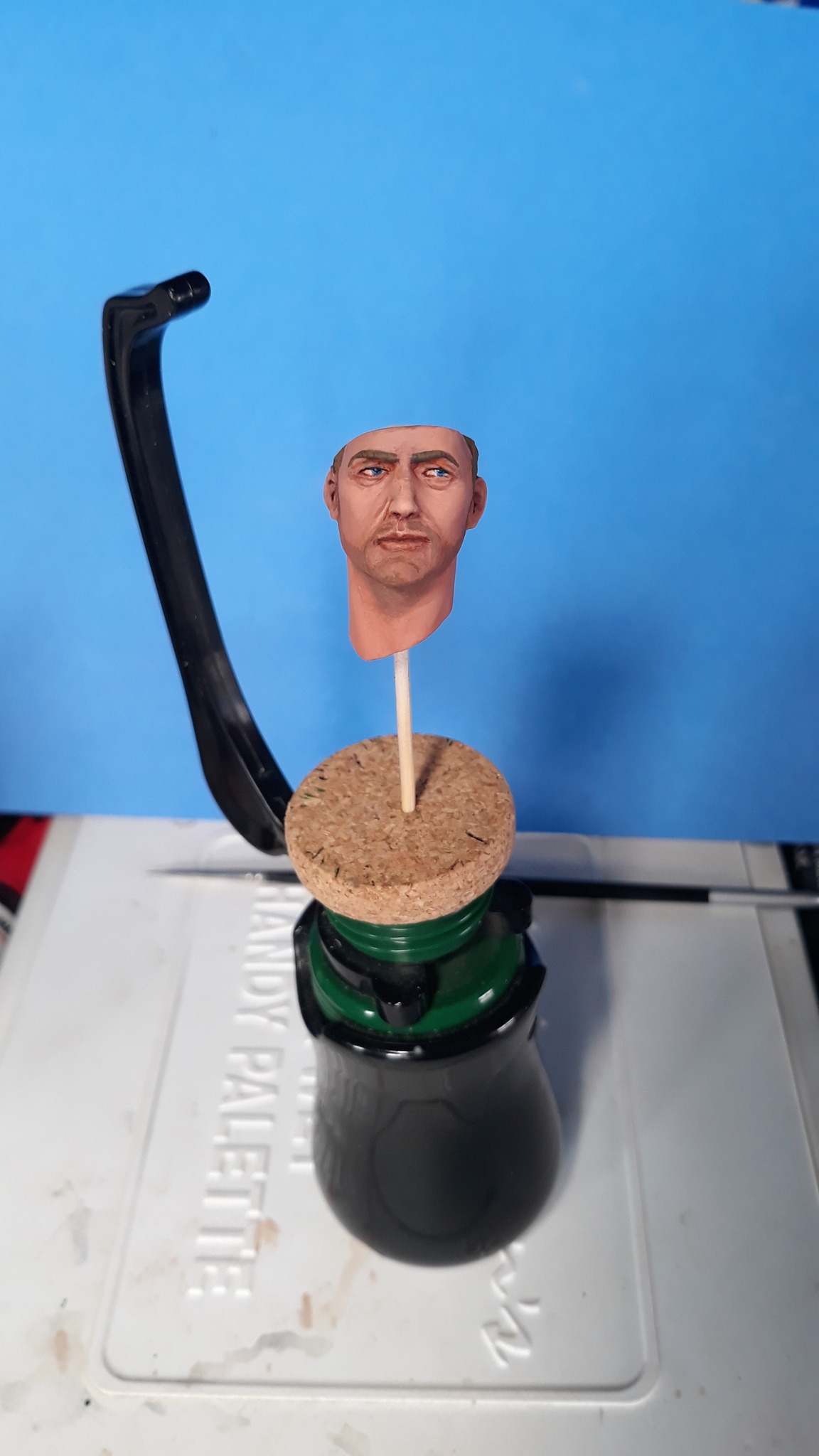 Here is what the face currently looks like. I painted the eyes, hair, and 5 o'clock shadow. There are a couple spots I need to touch up, but I think he is turning out rather well.