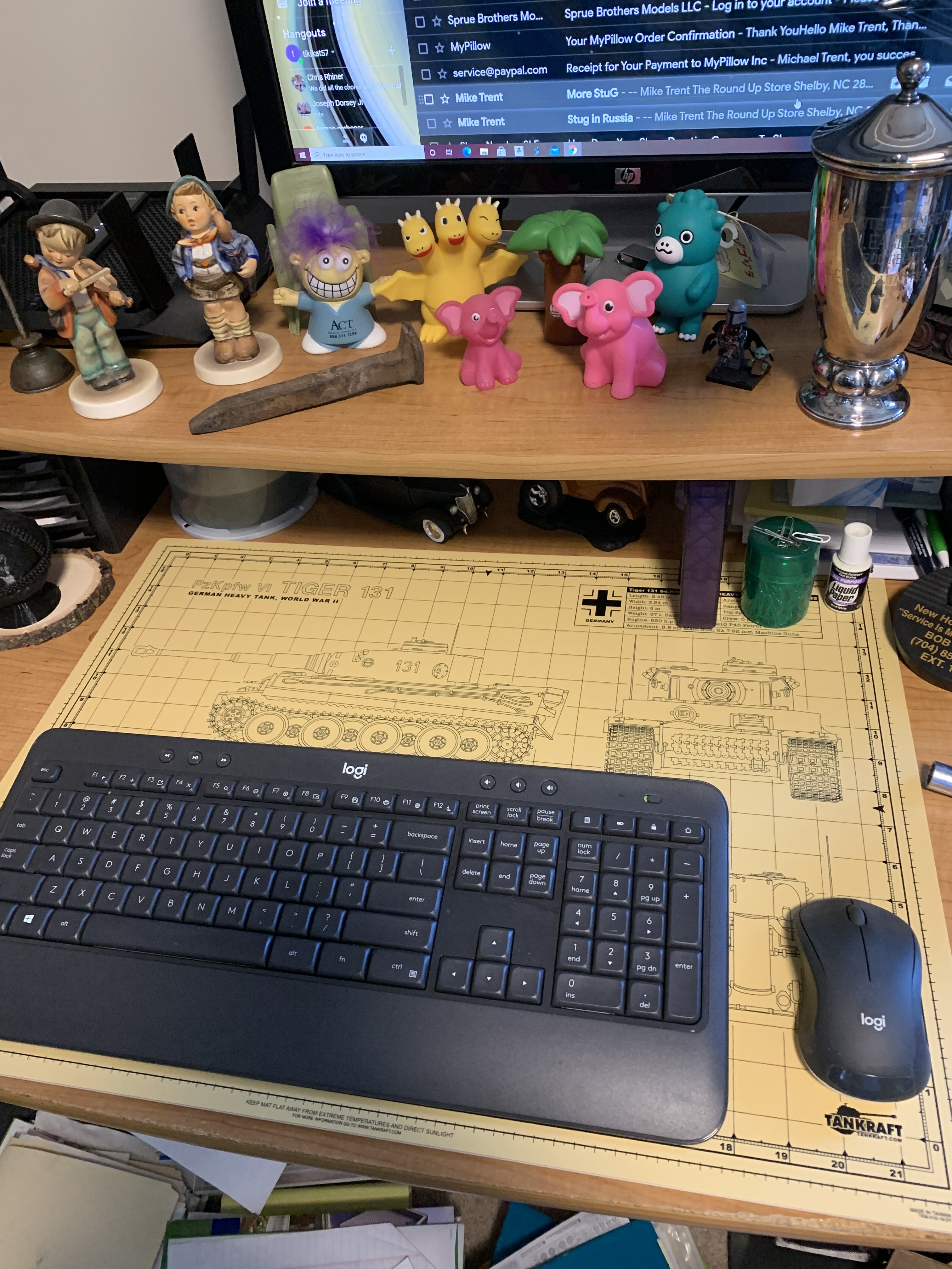 I didn't take progress photos, it didn't look like I was actually making progress until I was almost done. Here's a beta version, there's still stuff to hang on the walls and the lower shelves to organize yet. My friend, Greg Tost brought me the Tankcraft cutting mat direct from the Tank Museum in jolly old England, I couldn't stand the thought of using it to build on. It's just too cool, so I am using it under the keyboard.
