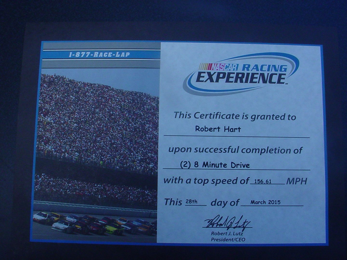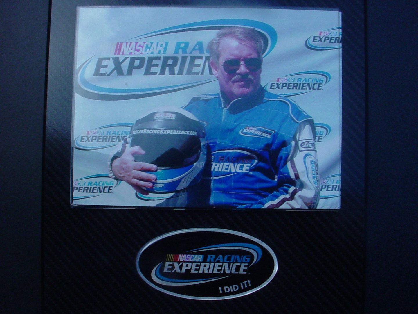 My wife gave me this for Christmas 2014. I'm a big motorsports fan, but I don't have any partcular interest in Nascar. However, despite accompanying me to several Indy Car races, my wife thinks all auto races are Nascar events. The experience was 10-11 laps around Auto Club Speedway in Fontana, CA in a detuned (rev limited to 5000 RPM) Nascar racer. Just getting in the car required physical exertion equal to doing about 50 push ups in one minute and the ensuing drive was hot, noisy, and claustrophobic. The clutch was heavy, The car's suspension was optimised for going around the turns so it did not steer in a straight line by itself, someone was constantly yelling over the radio to push the car as fast as it would go to maintain safe intervals with the other cars on the track, the G forces in the turns were high enough that it was a struggle to keep my hands on the steering wheel while trying to steer through the curves, and I was going fast enough that the car would cover the straights in the blink of an eye giving me no time to rest before being in a turn again. Then, at the end of the drive, I had to exit the car which required even more effort than entering it while being much more fatigued. The photo (posed by the phographer) was taken before the drive. An 'after' photo would have shown a red faced, sweaty, out of breath, and both physically and mentally exhausted middle aged man who was profoundly grateful that he did not drive race cars for a living. Sort of like completing basic training in the Army, I'm glad that I did it, but I will never voluntarily do it again.
