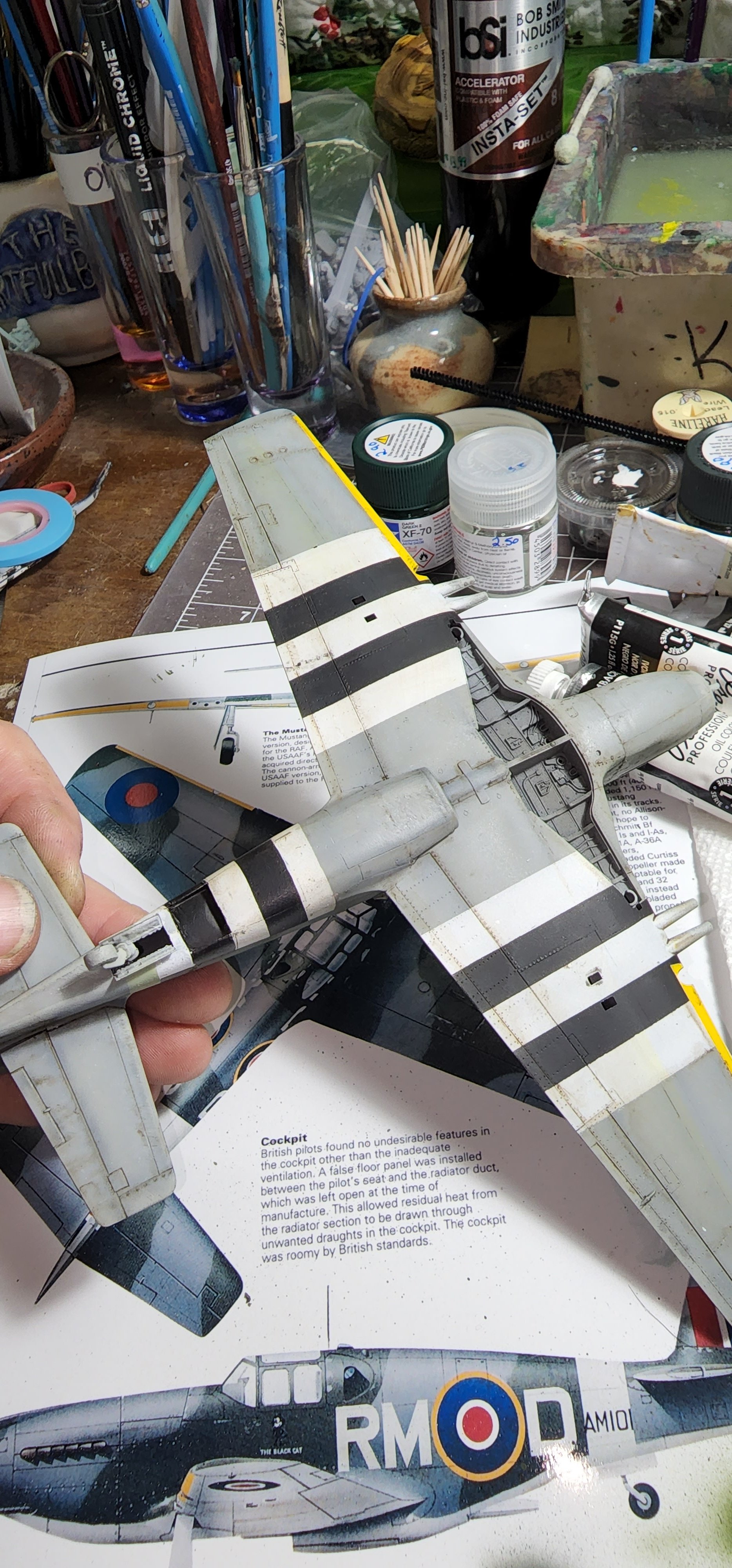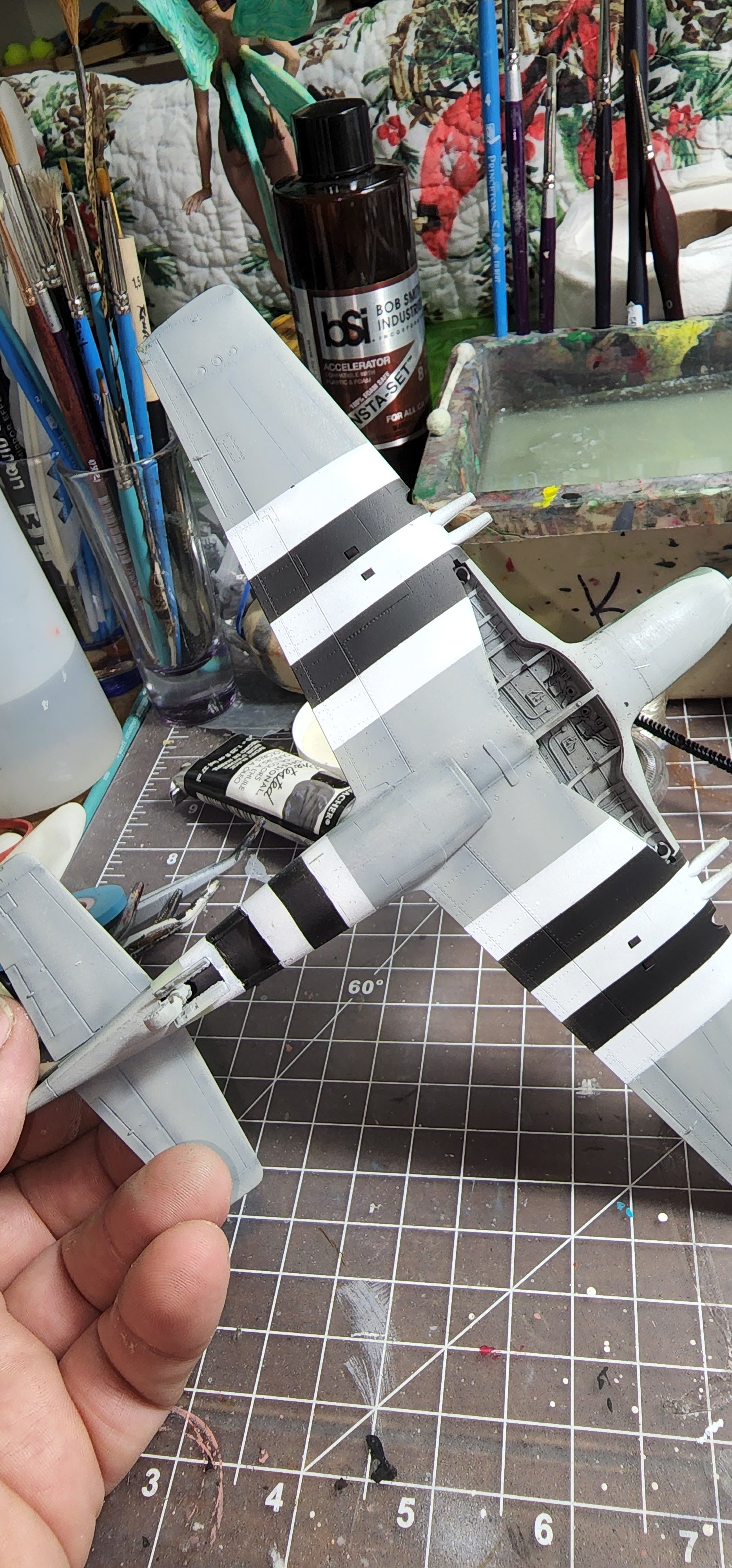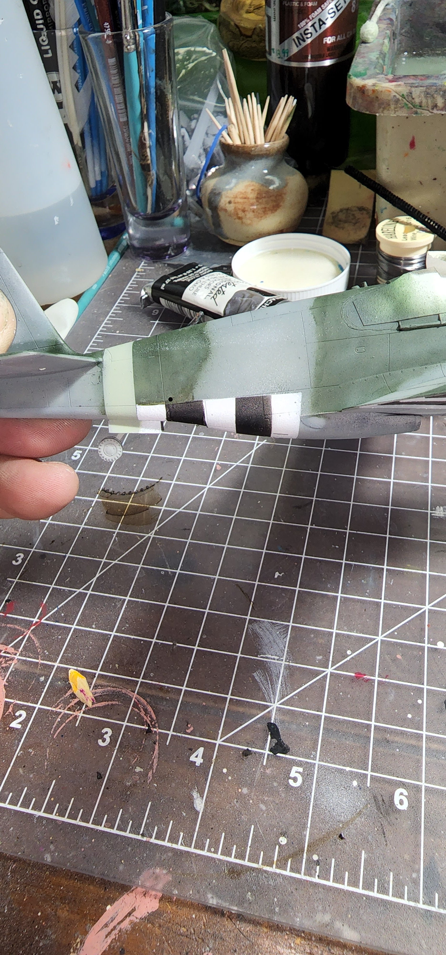 Worked on the airbrush trying to ultra clean and fine tune. I thinned the paint so thin that it was pretty transparent so it took several layers, but I painted over the olive with grey to redo the camo. I took my time and tried to accurately match the camo. That is as good as my skill level is gonna get it. It is dang frustrating to know what you want and can't make it happen. After that dried I opted to paint the stripes rather than use the decals, so I masked off the stripes and airbrushed them white then black. Using Sky I painted the tail stripe. I wanted to see what weathering would look like and as I was doing the right wing I realized I had forgotten the yellow on the wing front. Anyway, I will let this dry and paint the yellow, then continue.