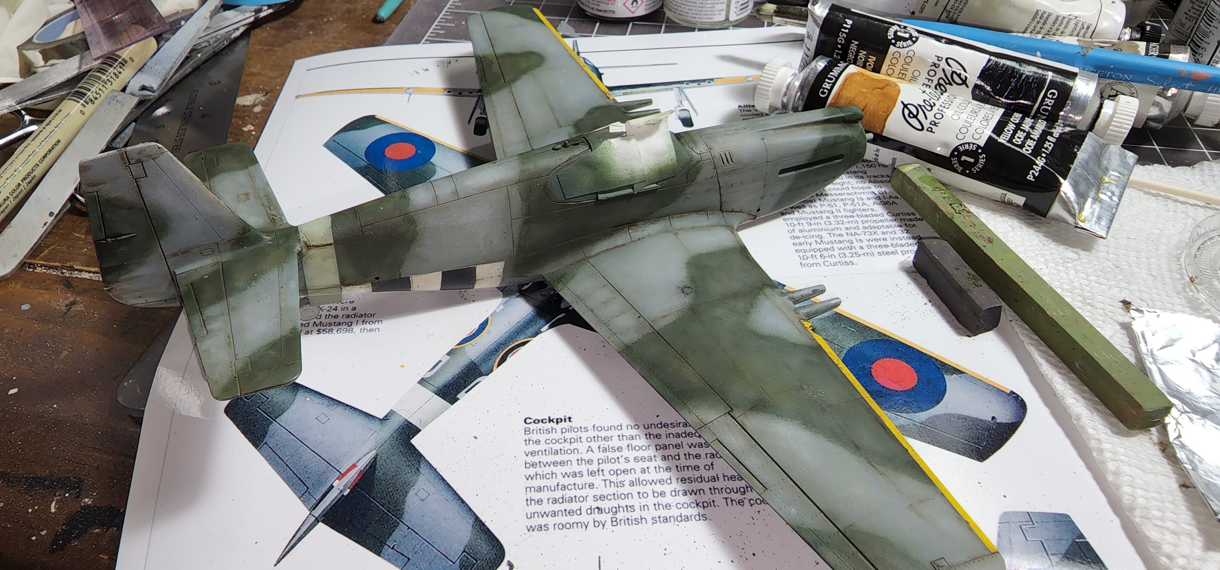 I painted the front edges of the wings yellow. I used raw umber and black oil paint to weather the darks, then white oil paint to highlight the gray panels on top. I have probably over-weathered but I kinda like it. To tone down the blotchiness of the greens I tried to use pastel to dust over and help smooth that out. I will let it rest overnight then gloss coat and decal tomorrow.
