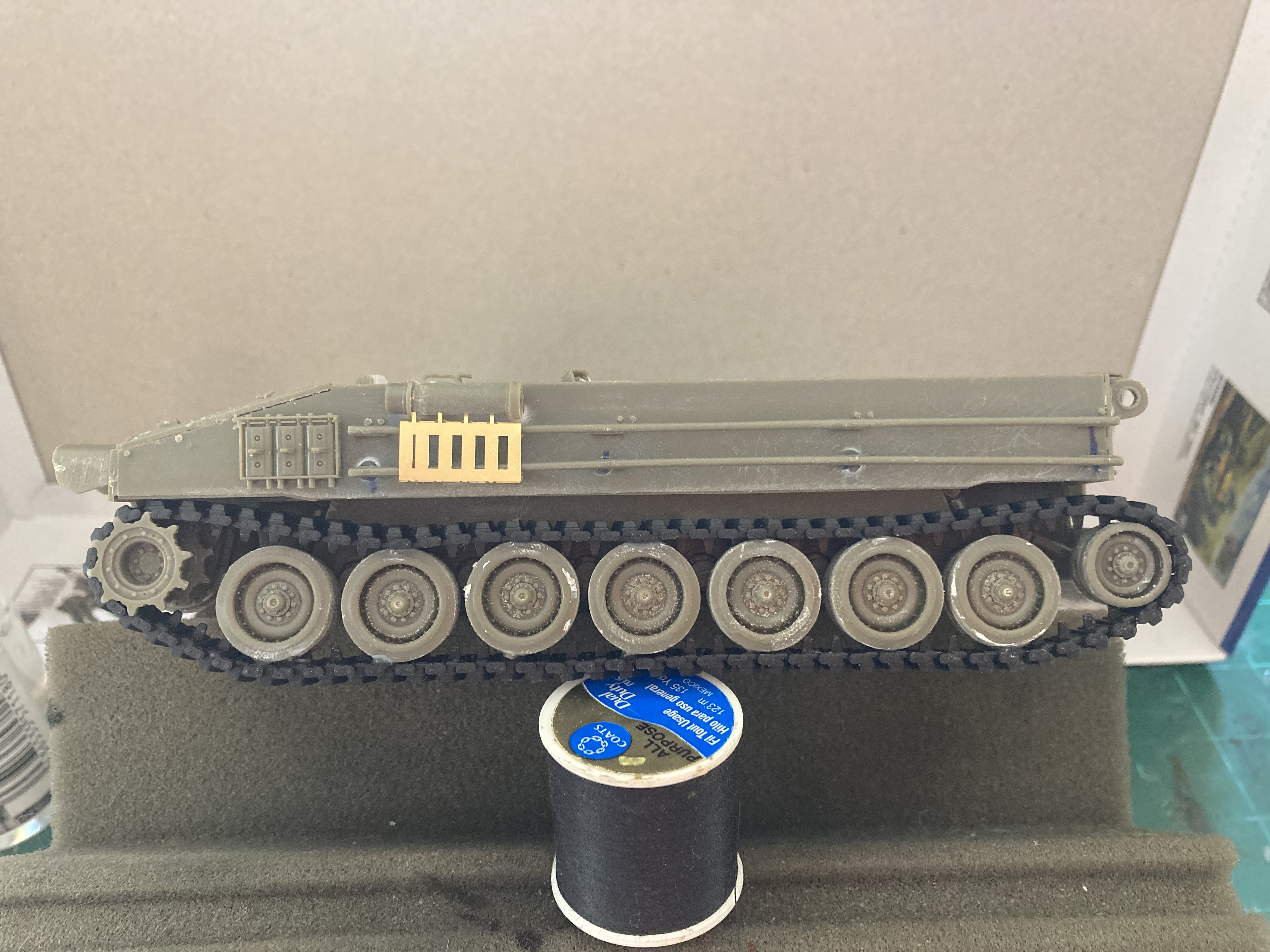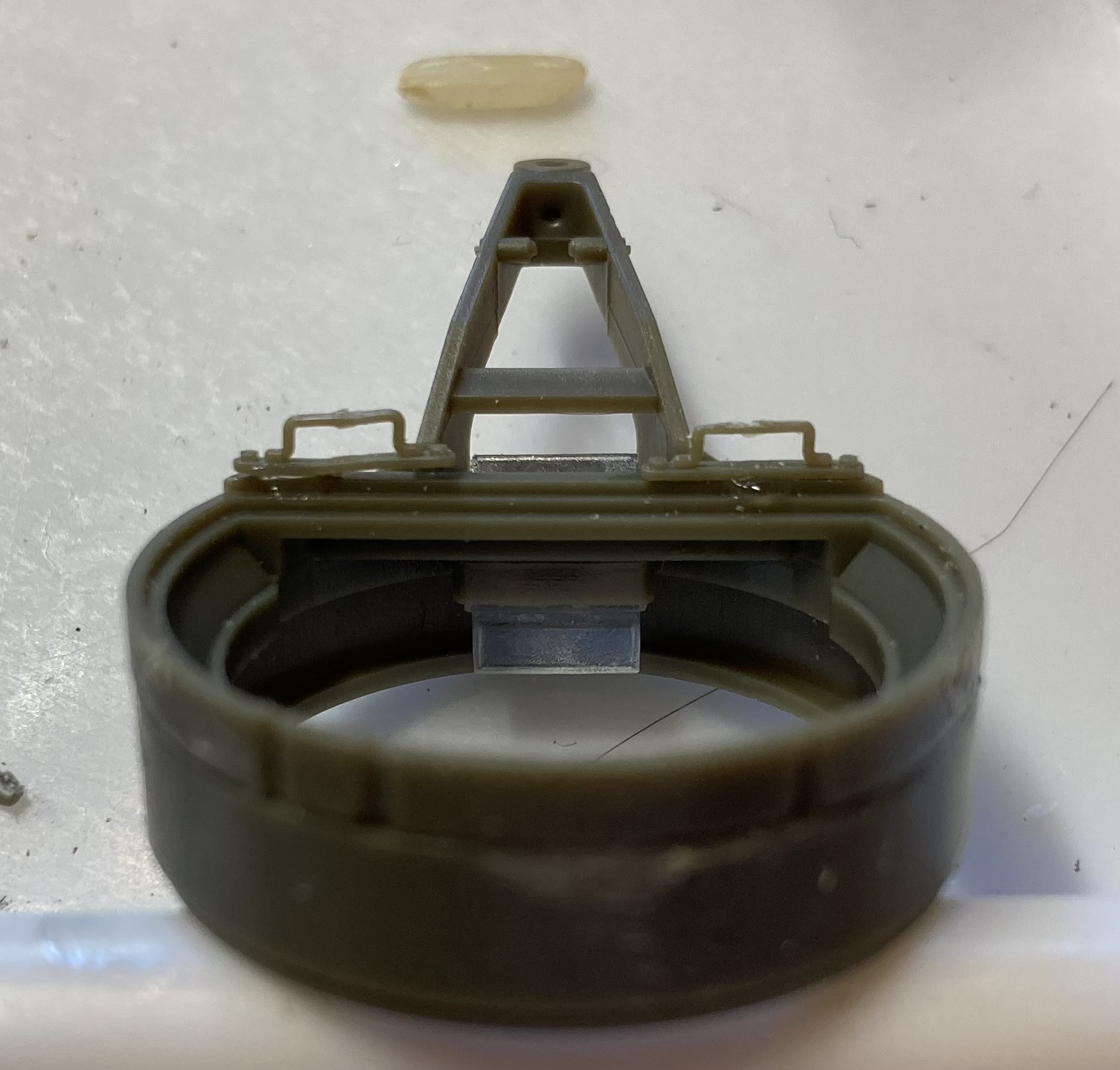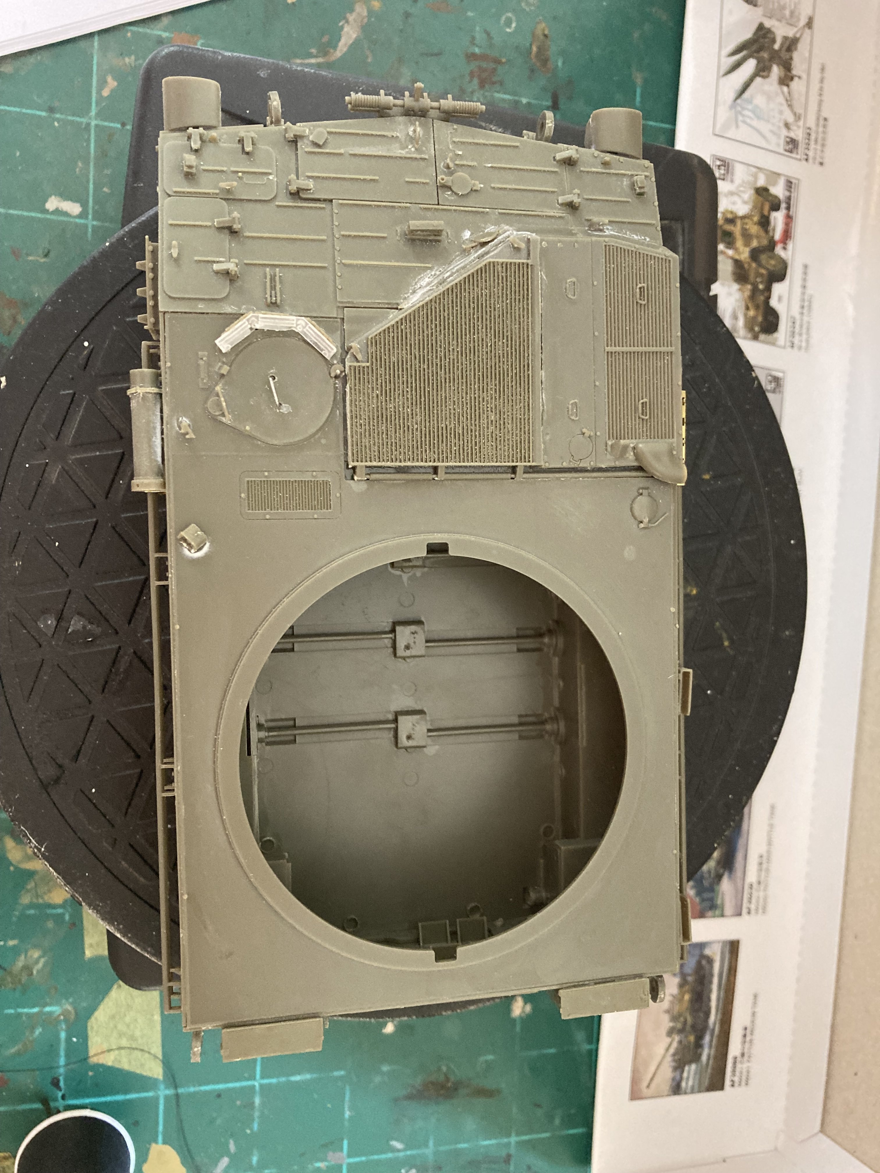 The detail is really there, but WOW does it comes at a price! The bathtub type lower hull & suspension were simple, but the Upper portion of the lower hull? Different story. it was in FIVE different pieces, with only one reference line to line everything up! Really very unnecessarily difficult. All the bits and bobs you see, like hinges, covers, and handles are individual pieces, each smaller than a grain of rice.