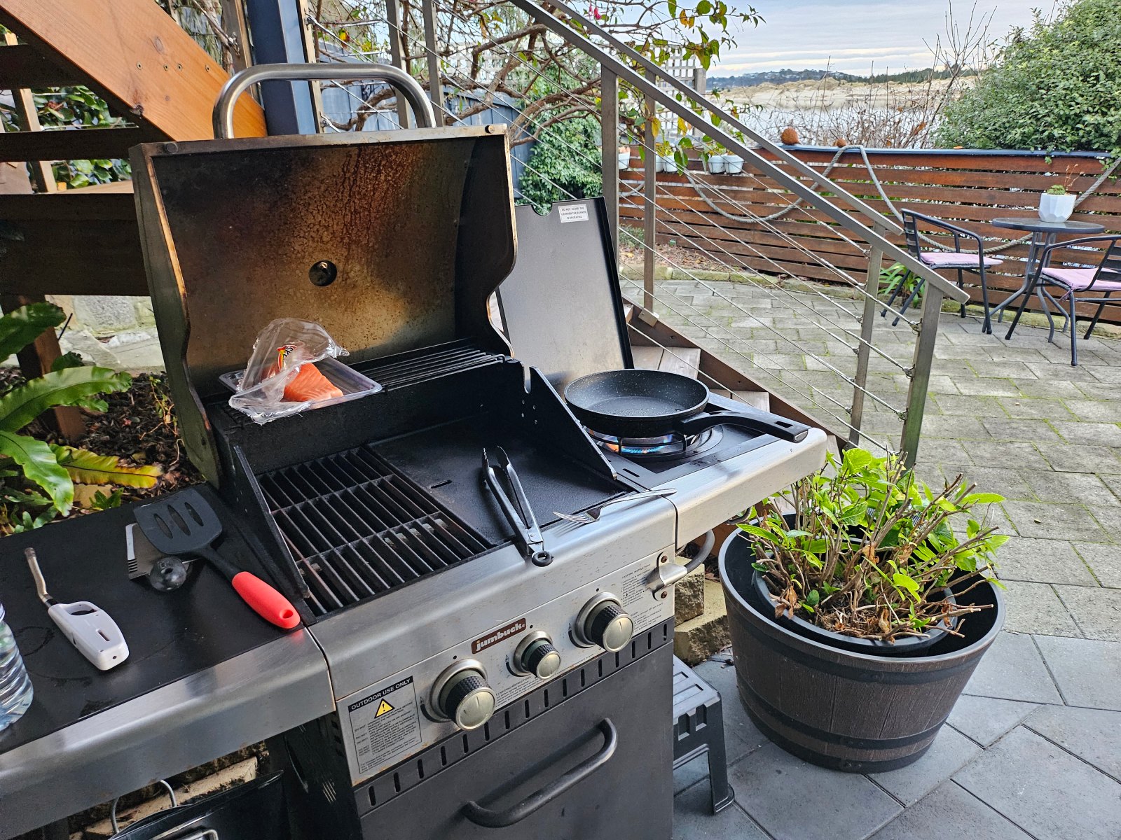 We passed through the hinterland and back down to the south coast and stayed at a small B&B room on the ground floor of a house, right on the inlet just out of Hobart. I cooked up some salmon on the 'Barbi' with a view to die for.......