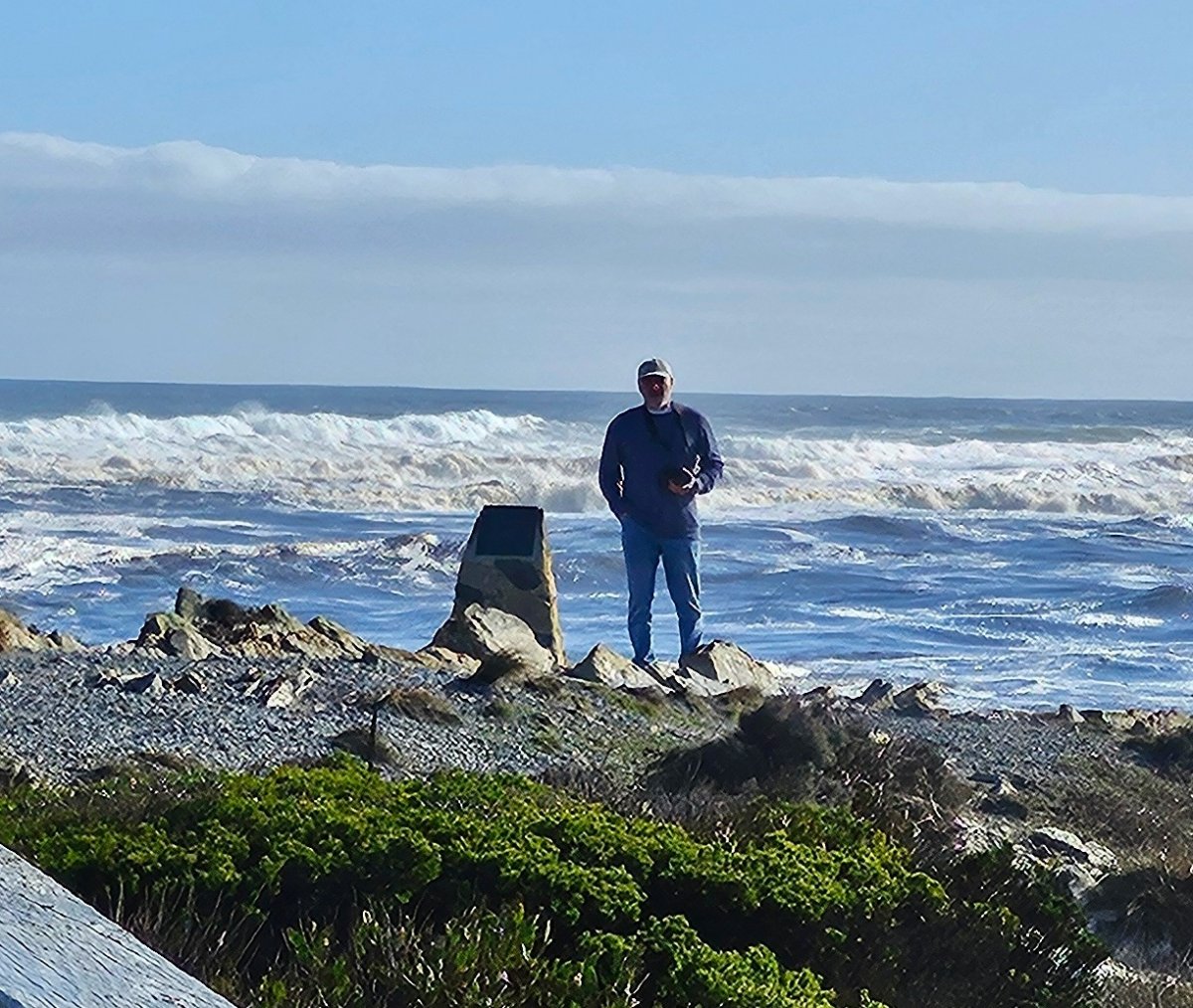 This view was just before coming down to cross the 'neck' to Port Arthur etc. There was a local guy with a coffee van and an open fire (in a drum)with stools on the road off to the left and we sat and drank coffee here admiring the view and staying warm.