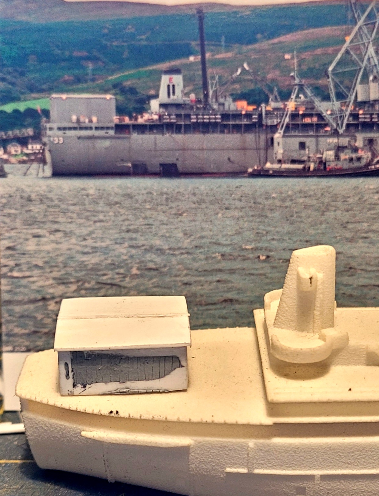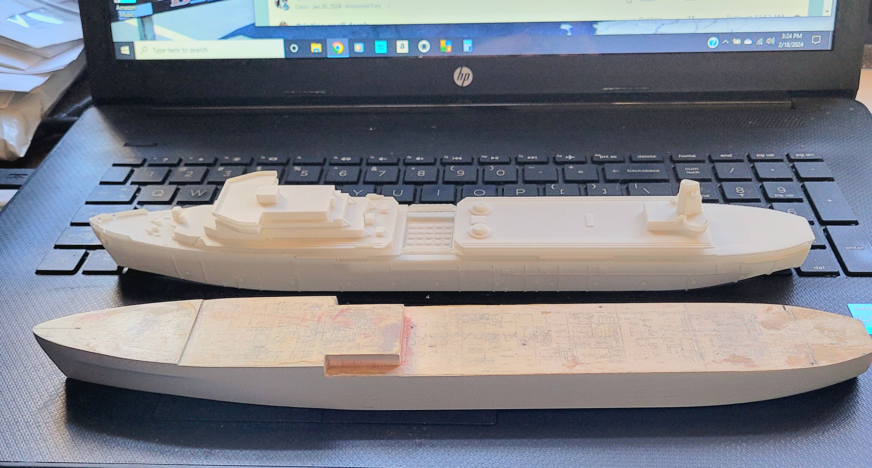 My friend Carl Musselman, proprietor of Back Aft Models in Millard Nebraska and esteemed model ship builder, was working to create a 1/700 diorama of the US Navy submarine servicing vessels at Holy Loch, Scotland. See pictured here, Carl's LPP hull and an awful white versatile plastic 3D print of USS Simon Lake.