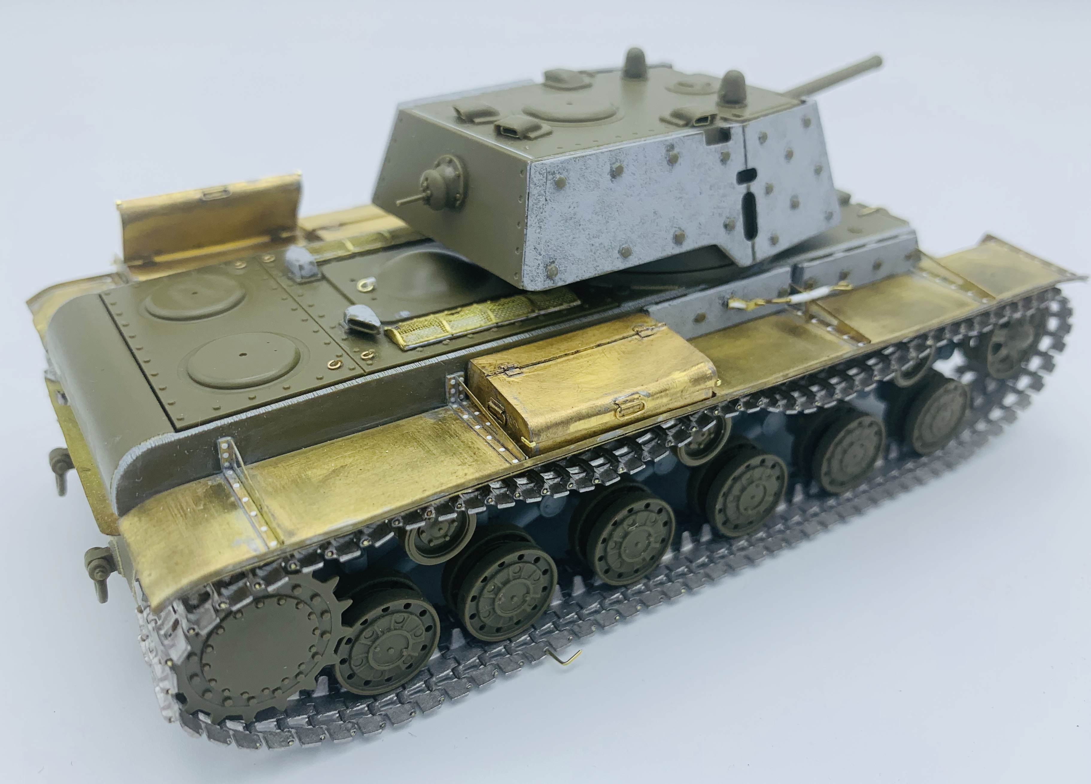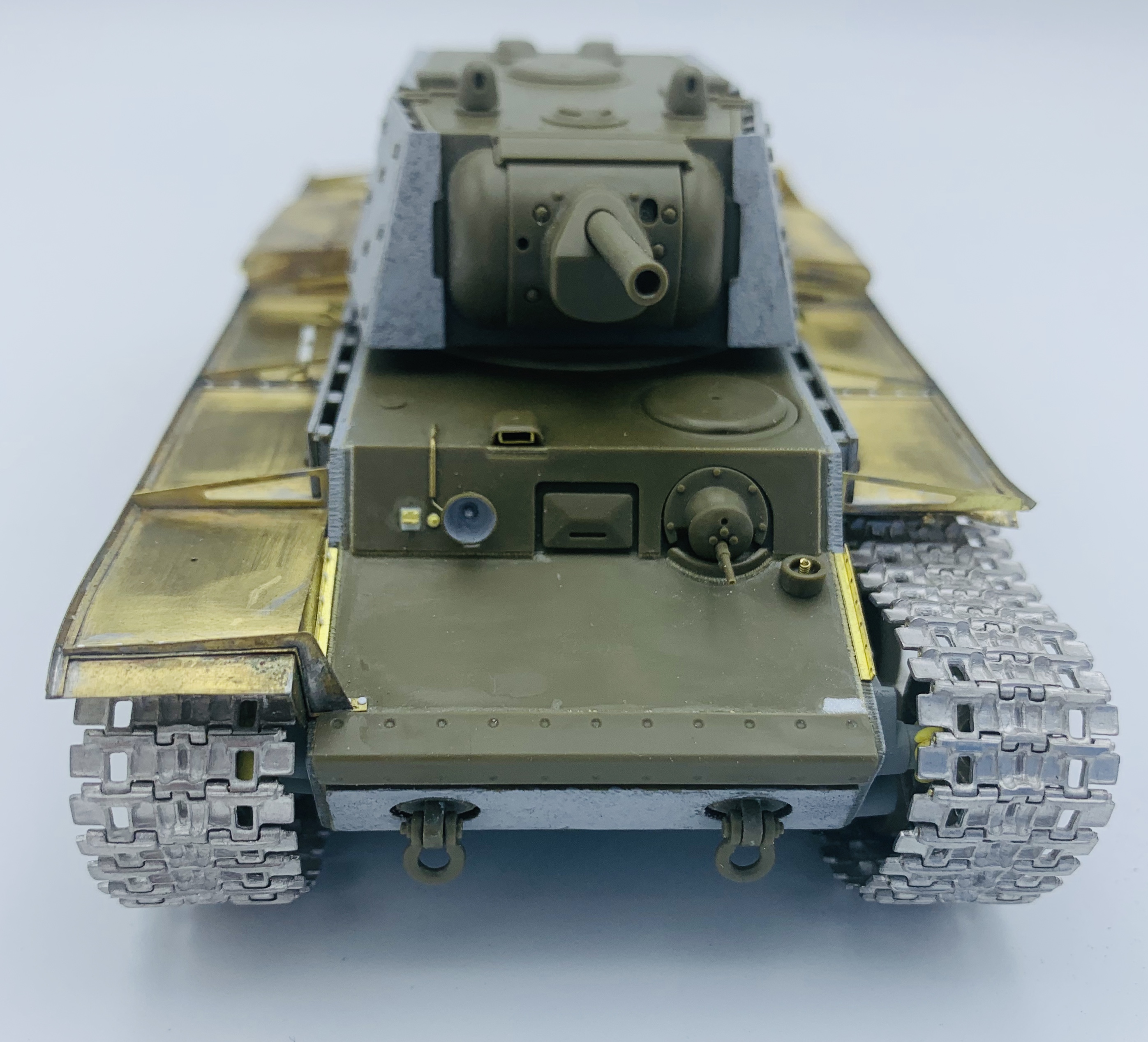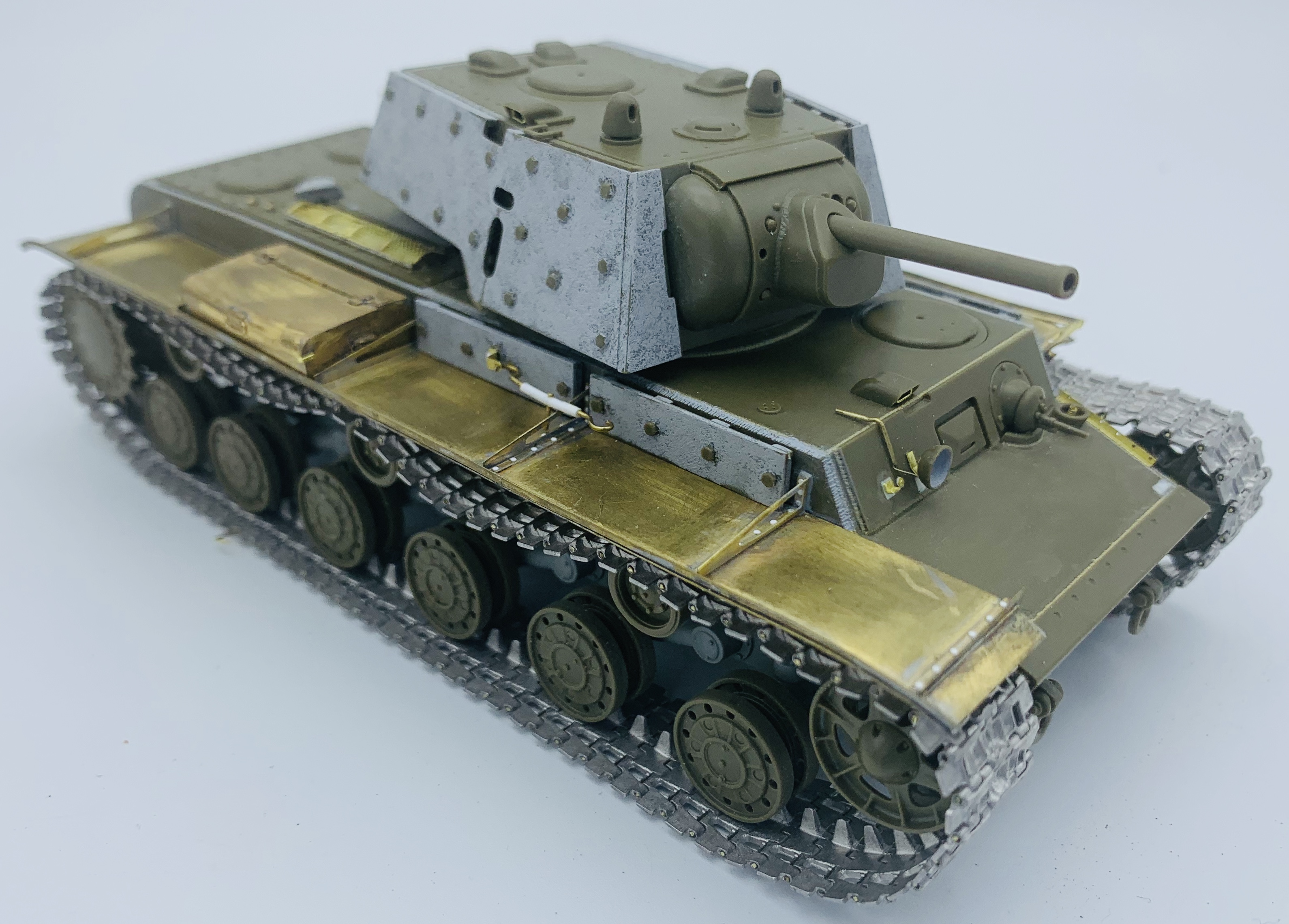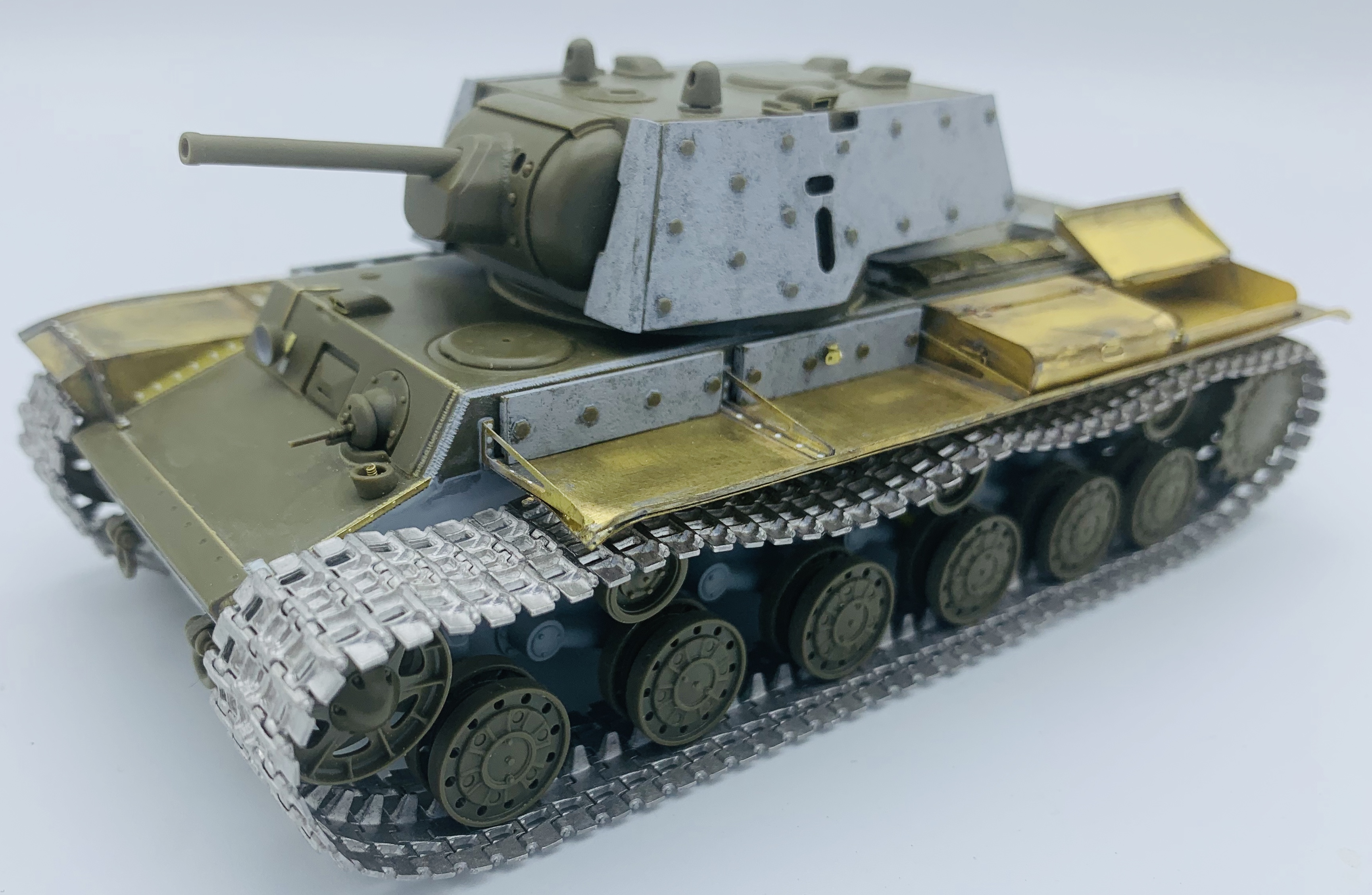 This was a build I finished a couple of months ago. It is Tamiya’s 1/48th scale KV1 with Appliqué Armor. It was a fun project and went surprising well. As with many Tamiya 1/48th scale kits, the detail was very soft on some areas. I added the flame cuts to the whole kit as well as weld beads as they are not represented on the kit. I decided to use stretched sprue to save myself some time. The flame cuts were made using the side of an Xacto blade and blended in with Tamiya extra thin. The armor texture was done using Mr. Surfacer 500, stippled with a brush and sanded down. The fenders, tool boxes, air intakes and other details are from Aber. I was going to use the Aber barrel but it is grossly under scale from what I can see, so I went with the kit barrel. I also added the lifting handles to the rear deck using .32 wire. The bolts on the fenders were done using RP Toolz punch and die set. They are slightly out of scale but look good to me. I made the headlight bulb by melting solder on the soldering iron and allowing it to ball up. I also added the air intake louvers with plastic strip. Lastly I used Fruil Model tracks. Thanks for taking a look and any comments and critiques are appreciated.