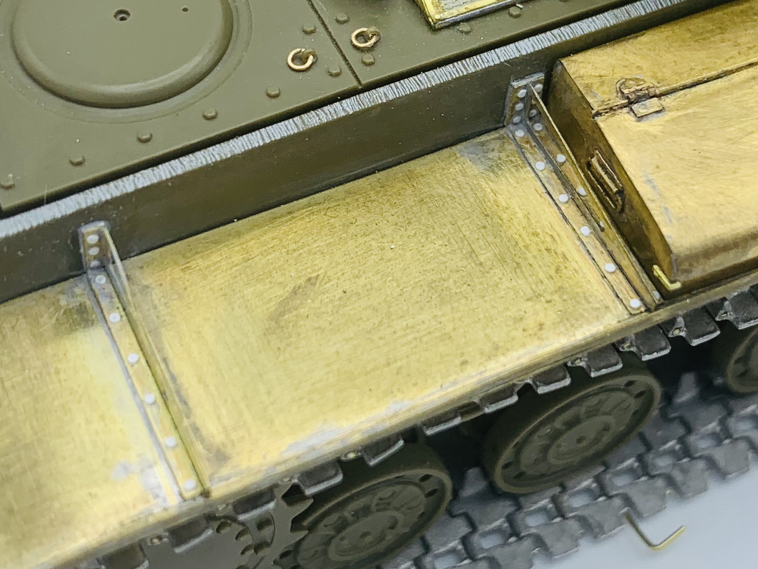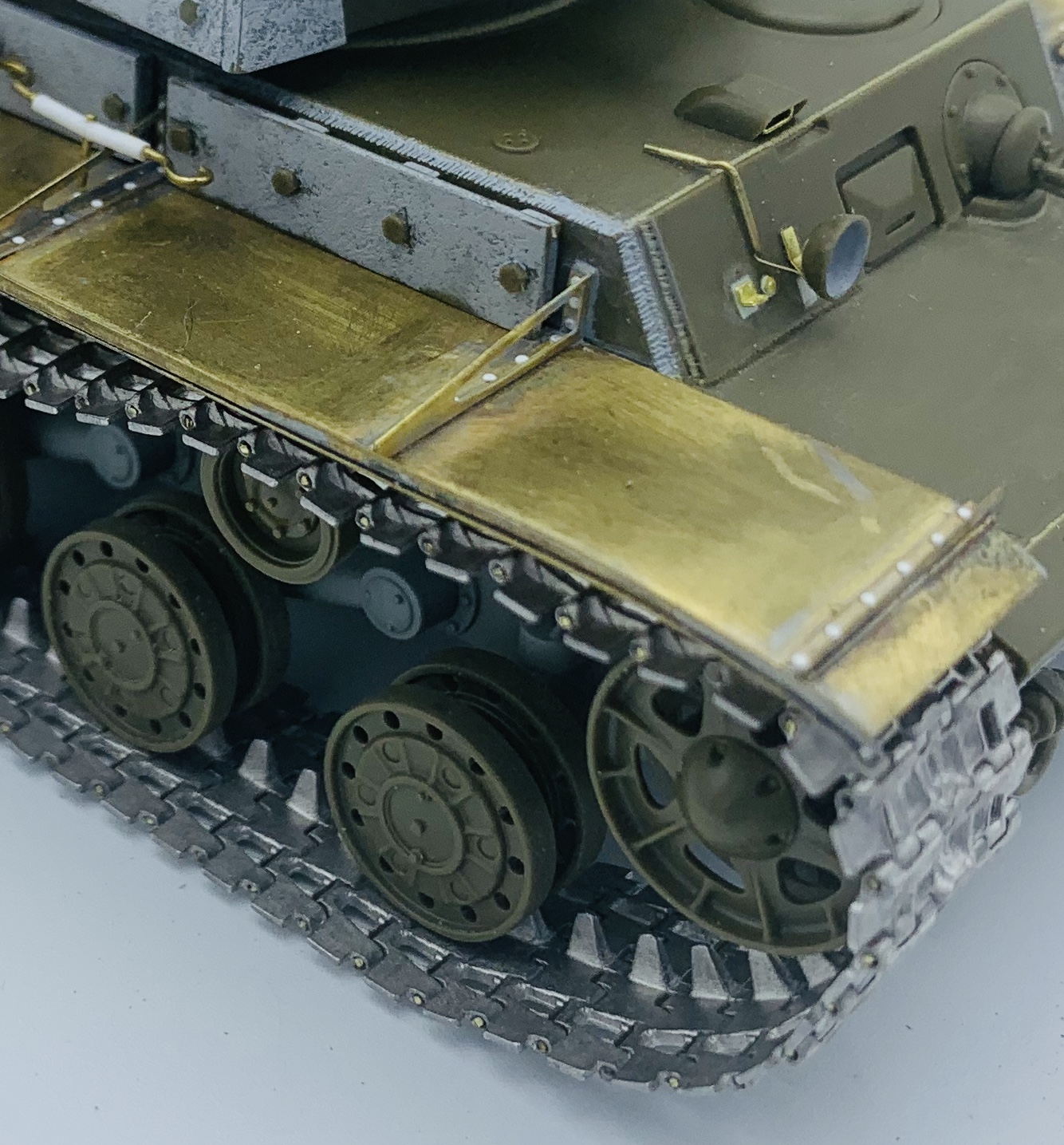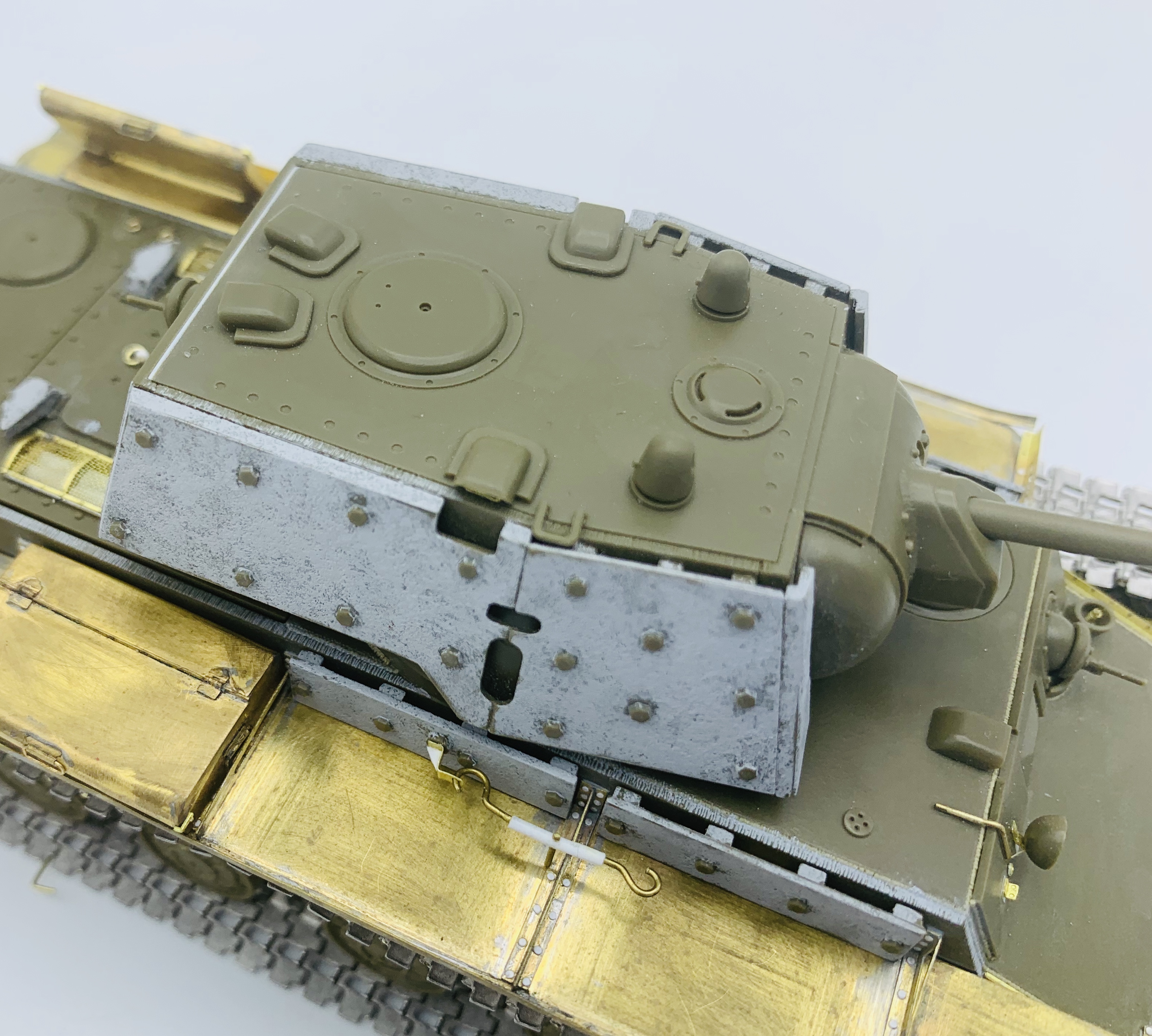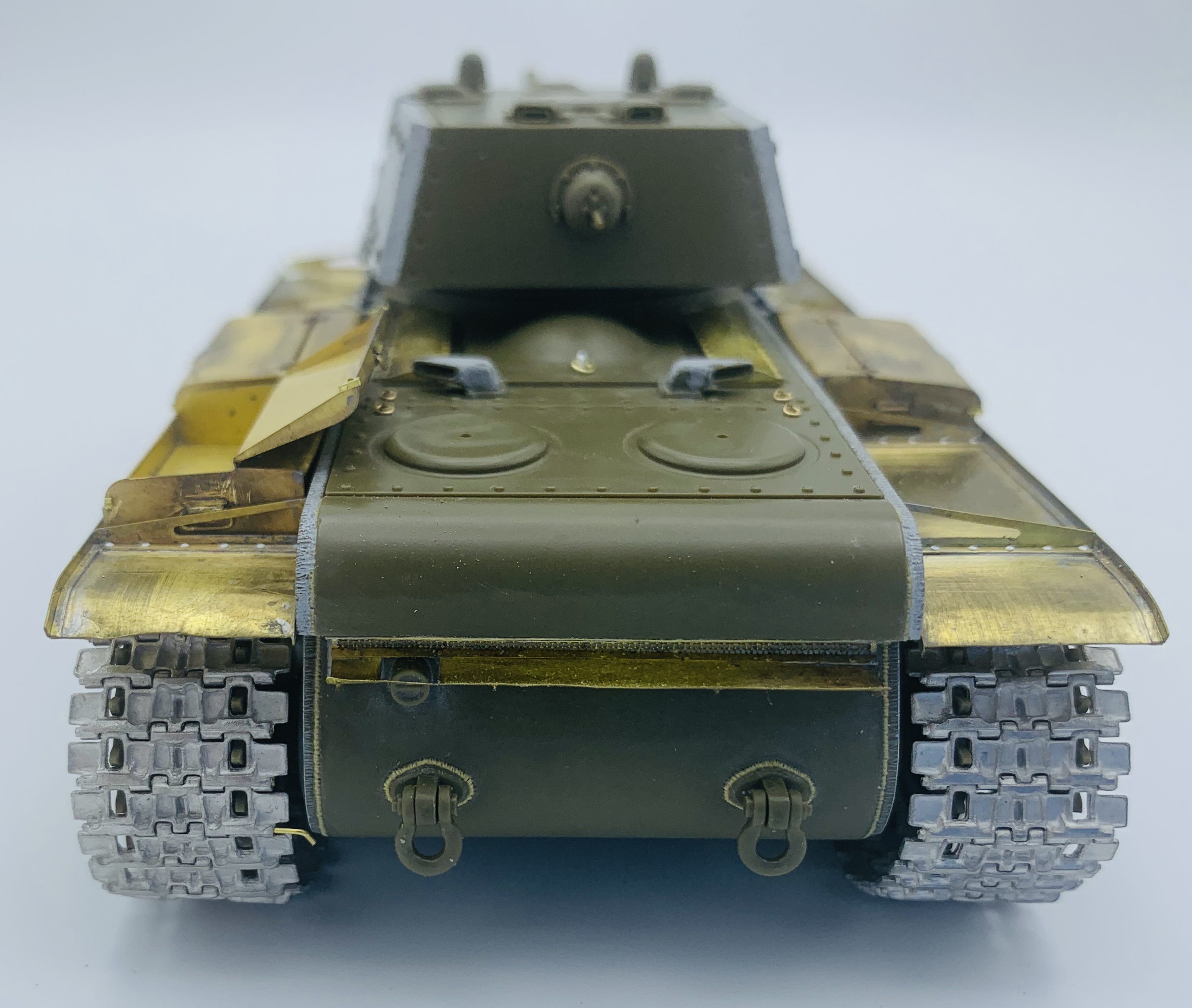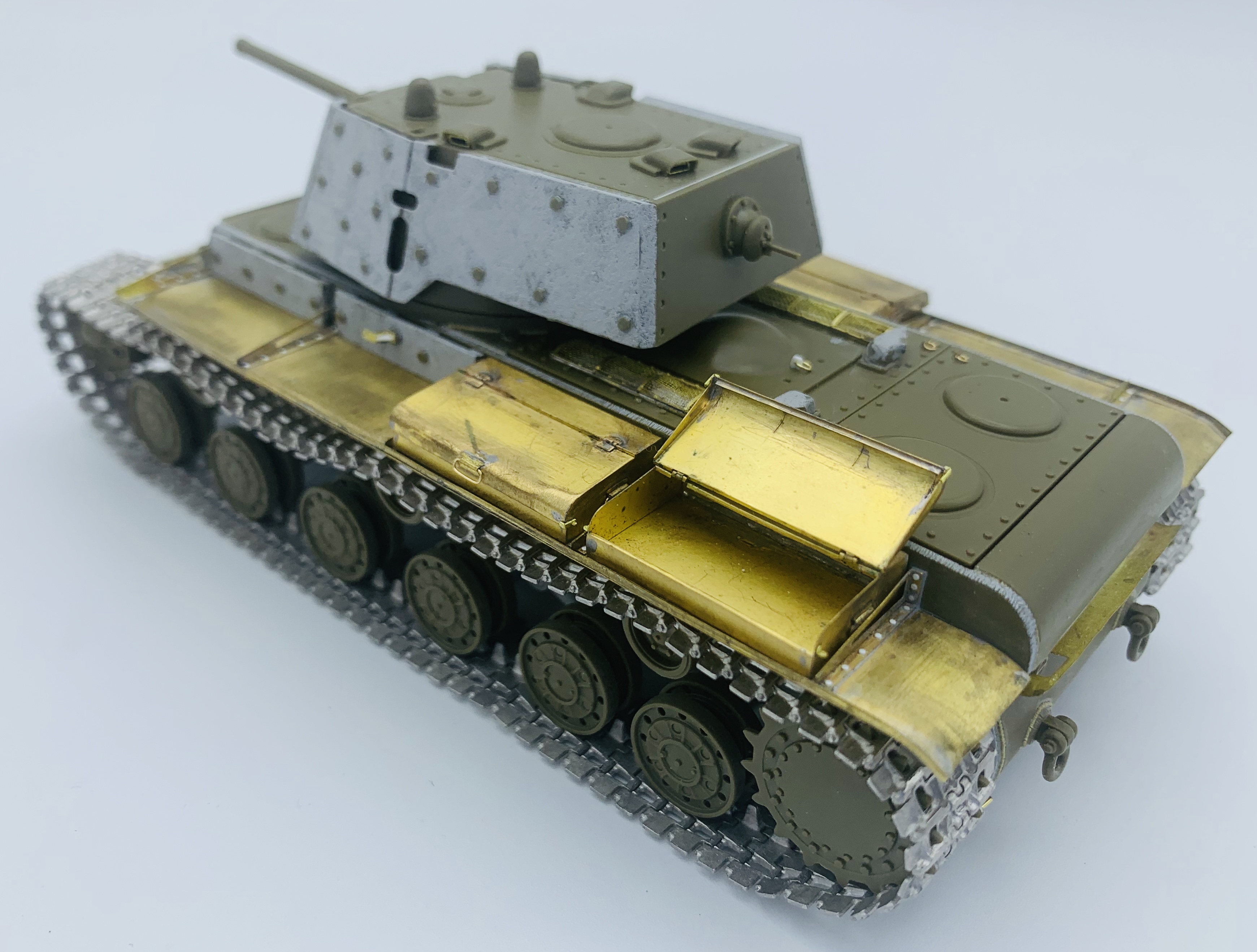 This was a build I finished a couple of months ago. It is Tamiya’s 1/48th scale KV1 with Appliqué Armor. It was a fun project and went surprising well. As with many Tamiya 1/48th scale kits, the detail was very soft on some areas. I added the flame cuts to the whole kit as well as weld beads as they are not represented on the kit. I decided to use stretched sprue to save myself some time. The flame cuts were made using the side of an Xacto blade and blended in with Tamiya extra thin. The armor texture was done using Mr. Surfacer 500, stippled with a brush and sanded down. The fenders, tool boxes, air intakes and other details are from Aber. I was going to use the Aber barrel but it is grossly under scale from what I can see, so I went with the kit barrel. I also added the lifting handles to the rear deck using .32 wire. The bolts on the fenders were done using RP Toolz punch and die set. They are slightly out of scale but look good to me. I made the headlight bulb by melting solder on the soldering iron and allowing it to ball up. I also added the air intake louvers with plastic strip. Lastly I used Fruil Model tracks. Thanks for taking a look and any comments and critiques are appreciated.