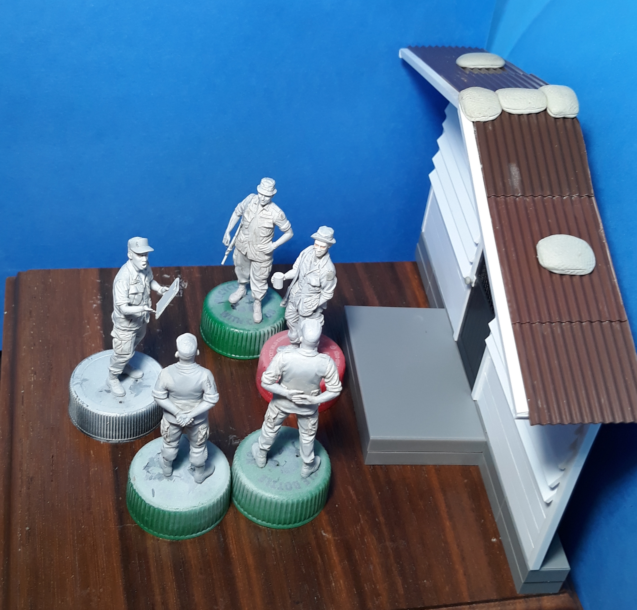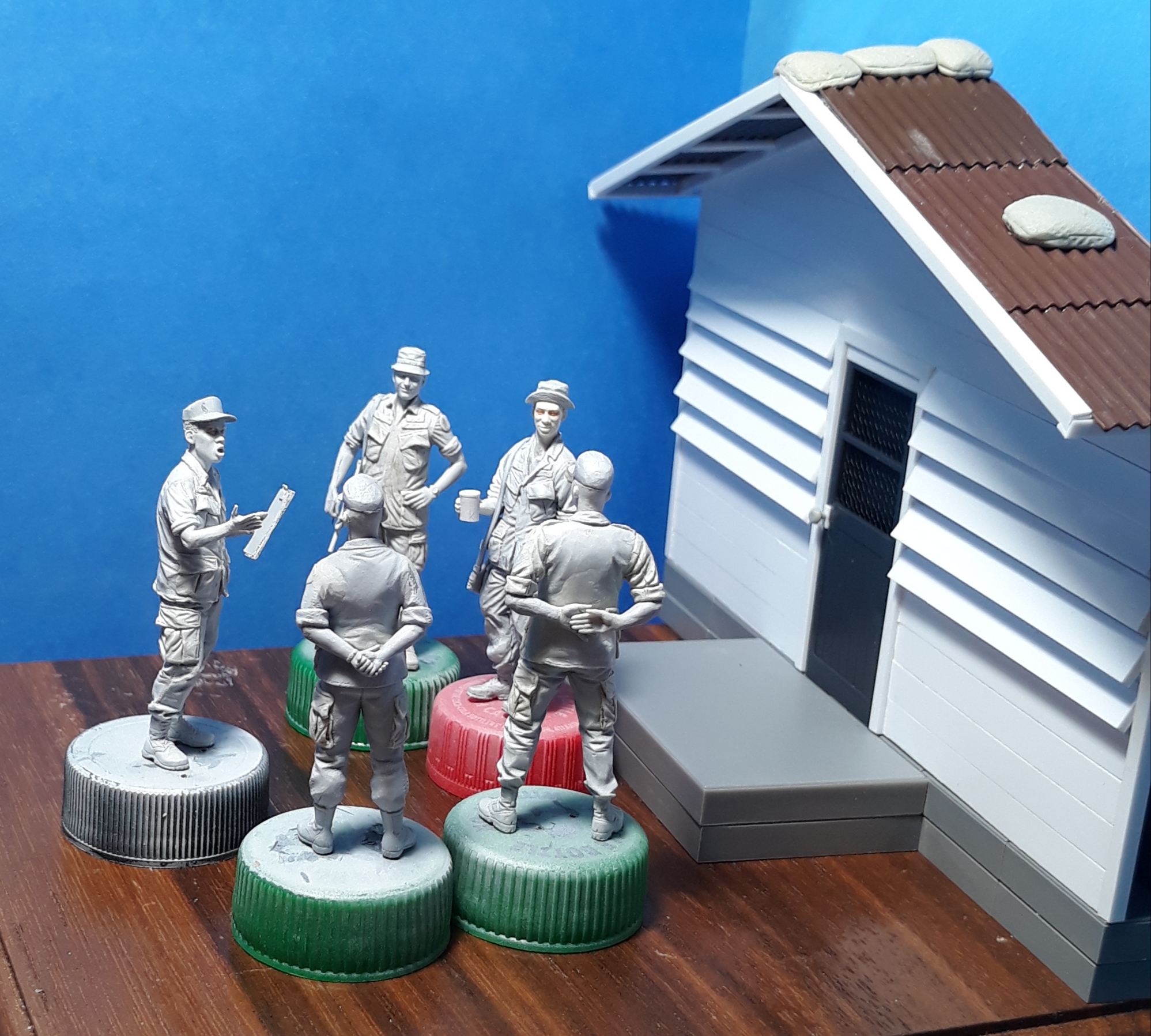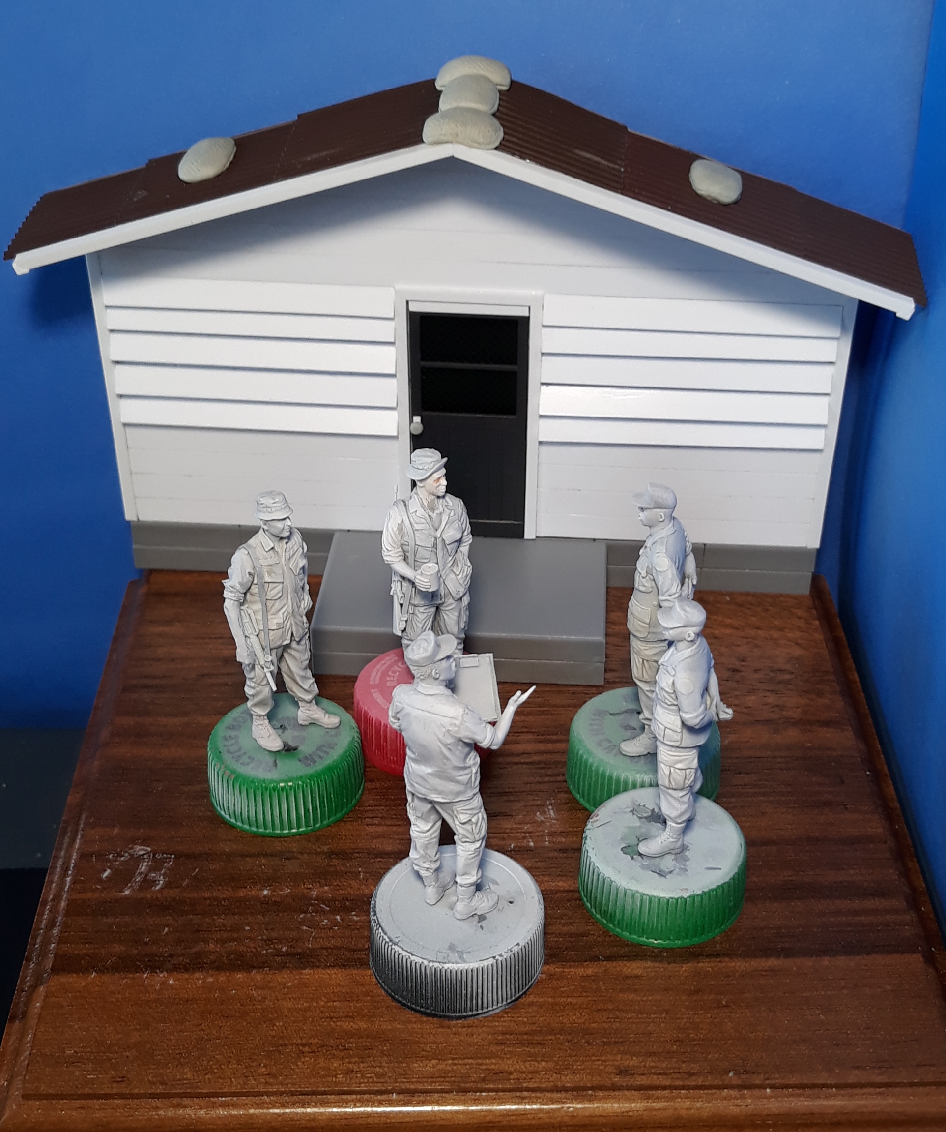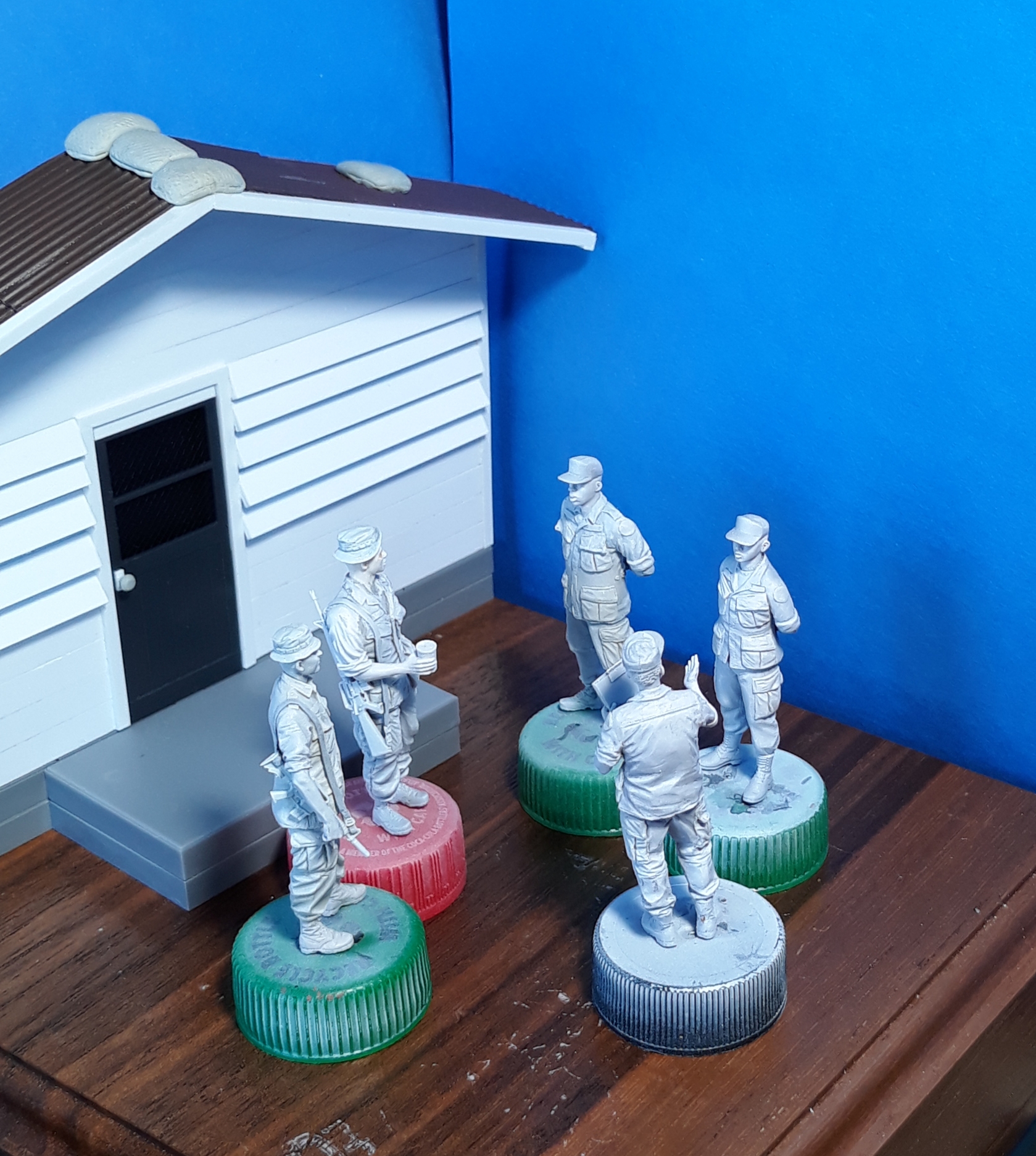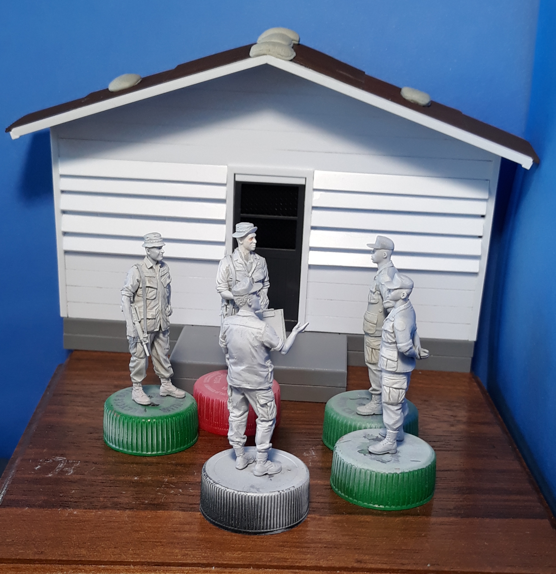 The storyline of this diorama is basically that of two new guys/replacements/FNGs being passed off to their new Squad Leader and Platoon Sergeant by an Admin Clerk. In order to make this a relatively quick project, I decided to use some of my recent conversions altering the one depicting the clerk by changing out the left hand that I originally placed a slingshot into and replacing it with one holding a clipboard. The Platoon Sergeant and Squad Leader figures were originally going to be pulling security for the MEDCAP, so they have weapons slung over their shoulders. I kind of wish I hadn't added the weapons yet as they would have rarely been carried around Camp Bearcat, but it is plausible that they had returned to basecamp for some other reason and were summoned over to S1 to pick up the new guys before they headed back out to the field.