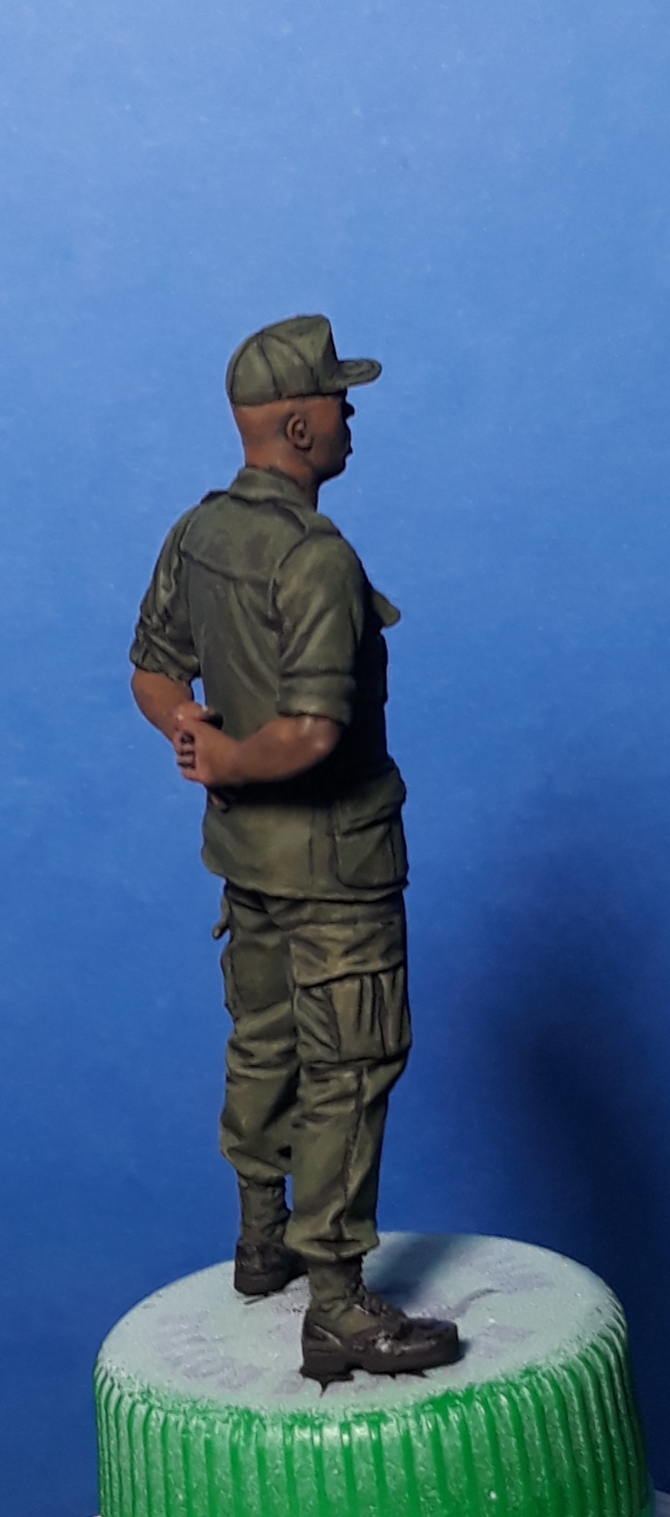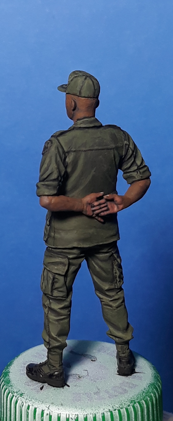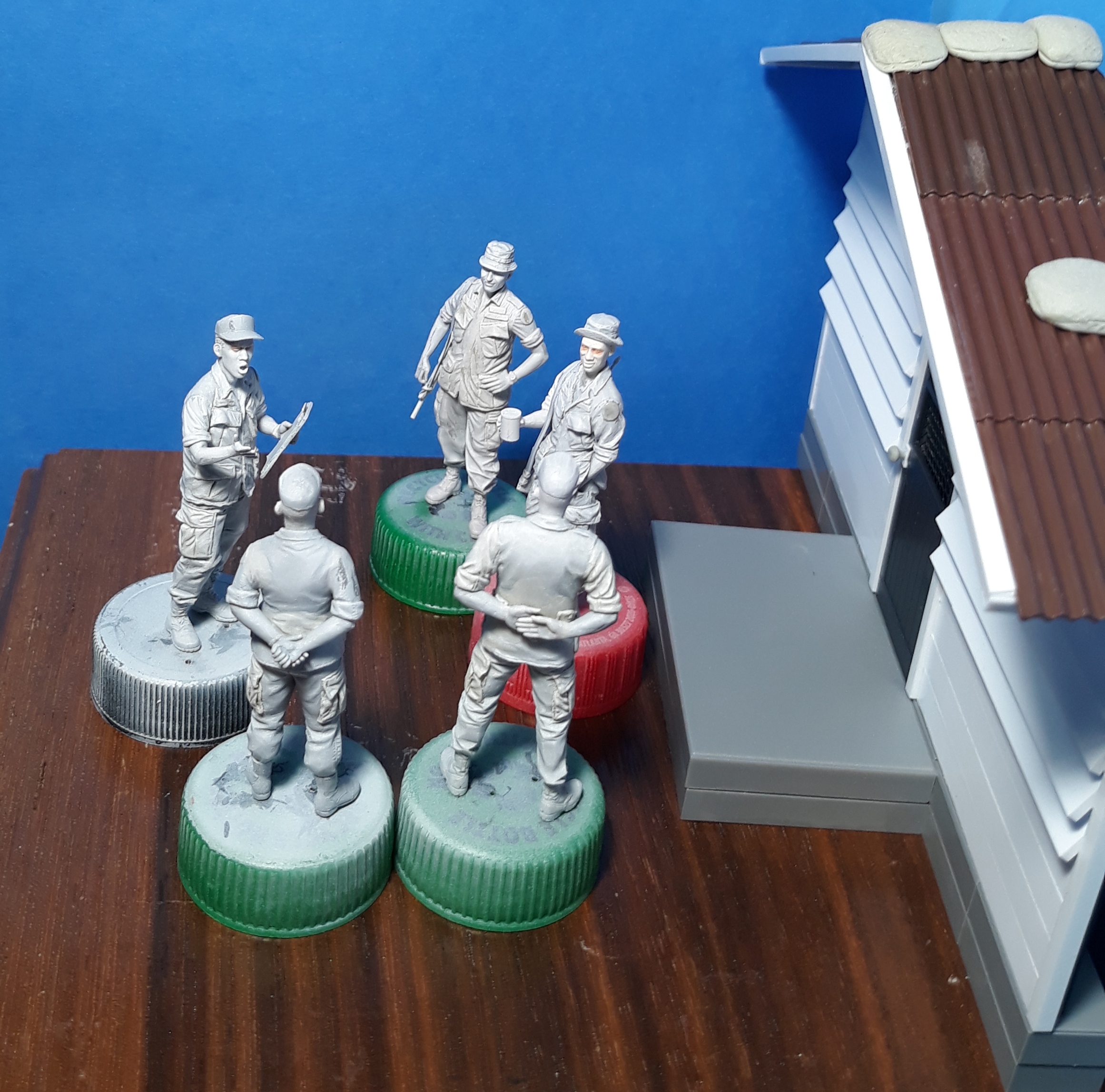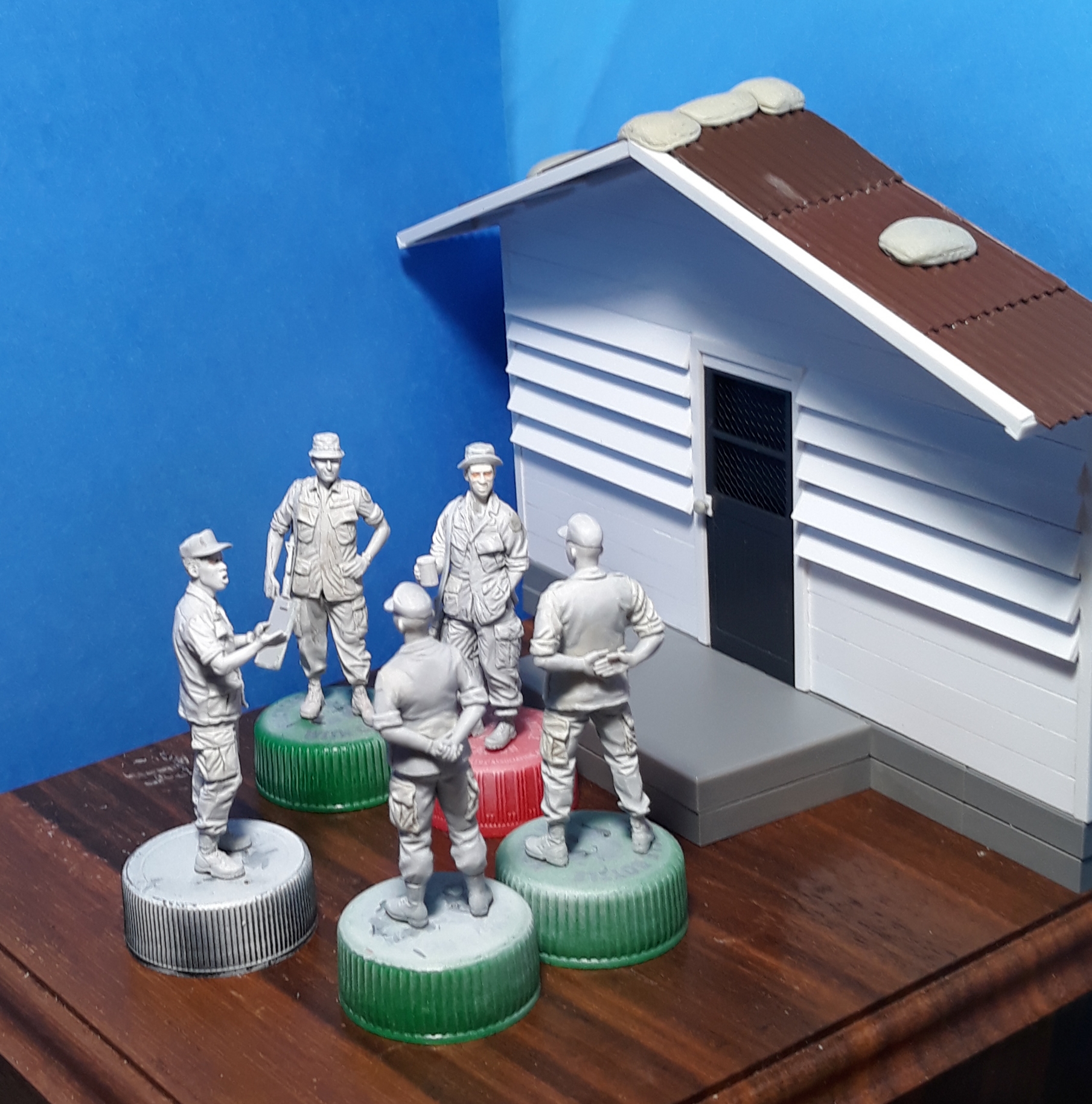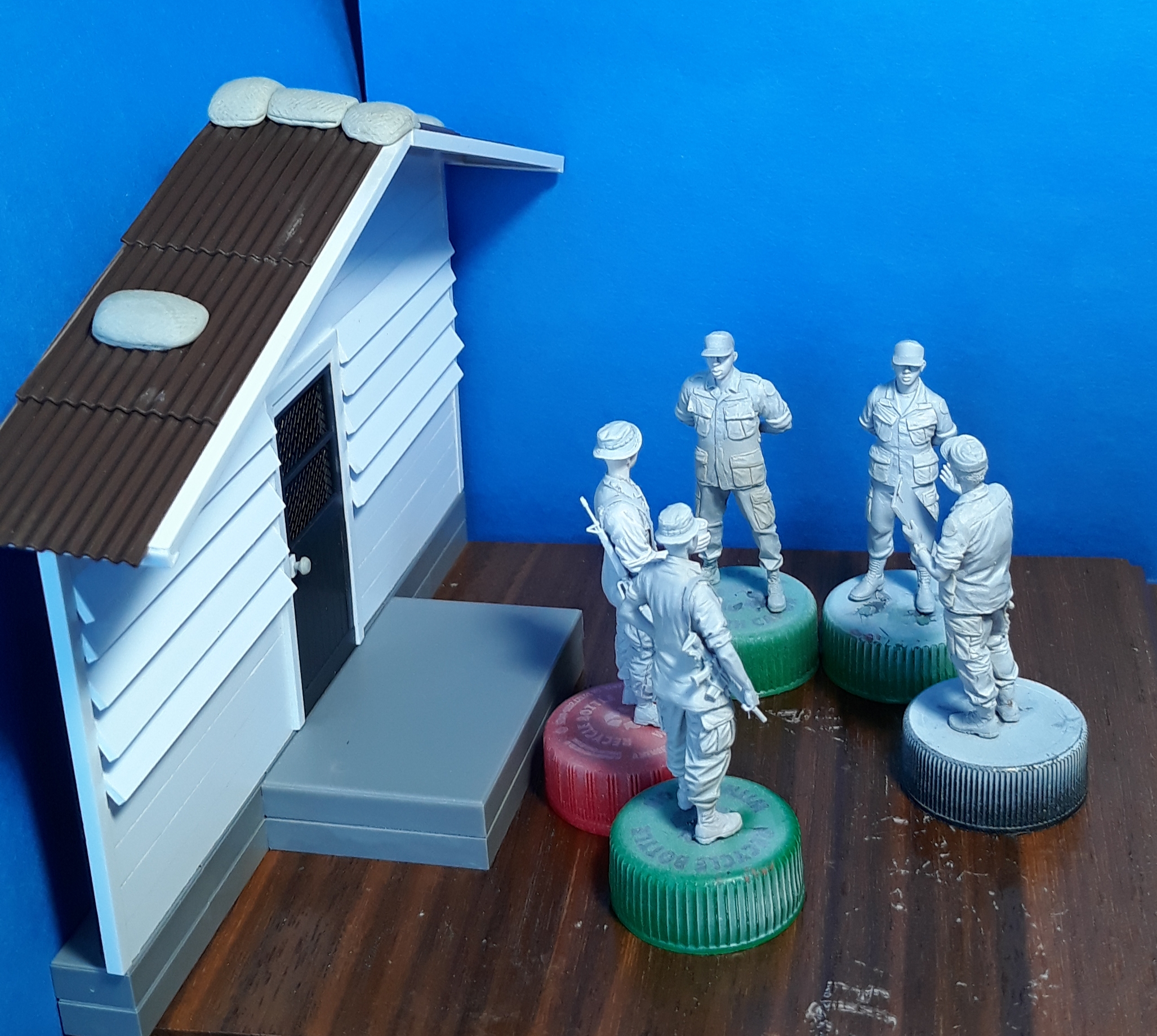 The storyline of this diorama is basically that of two new guys/replacements/FNGs being passed off to their new Squad Leader and Platoon Sergeant by an Admin Clerk. In order to make this a relatively quick project, I decided to use some of my recent conversions altering the one depicting the clerk by changing out the left hand that I originally placed a slingshot into and replacing it with one holding a clipboard. The Platoon Sergeant and Squad Leader figures were originally going to be pulling security for the MEDCAP, so they have weapons slung over their shoulders. I kind of wish I hadn't added the weapons yet as they would have rarely been carried around Camp Bearcat, but it is plausible that they had returned to basecamp for some other reason and were summoned over to S1 to pick up the new guys before they headed back out to the field.