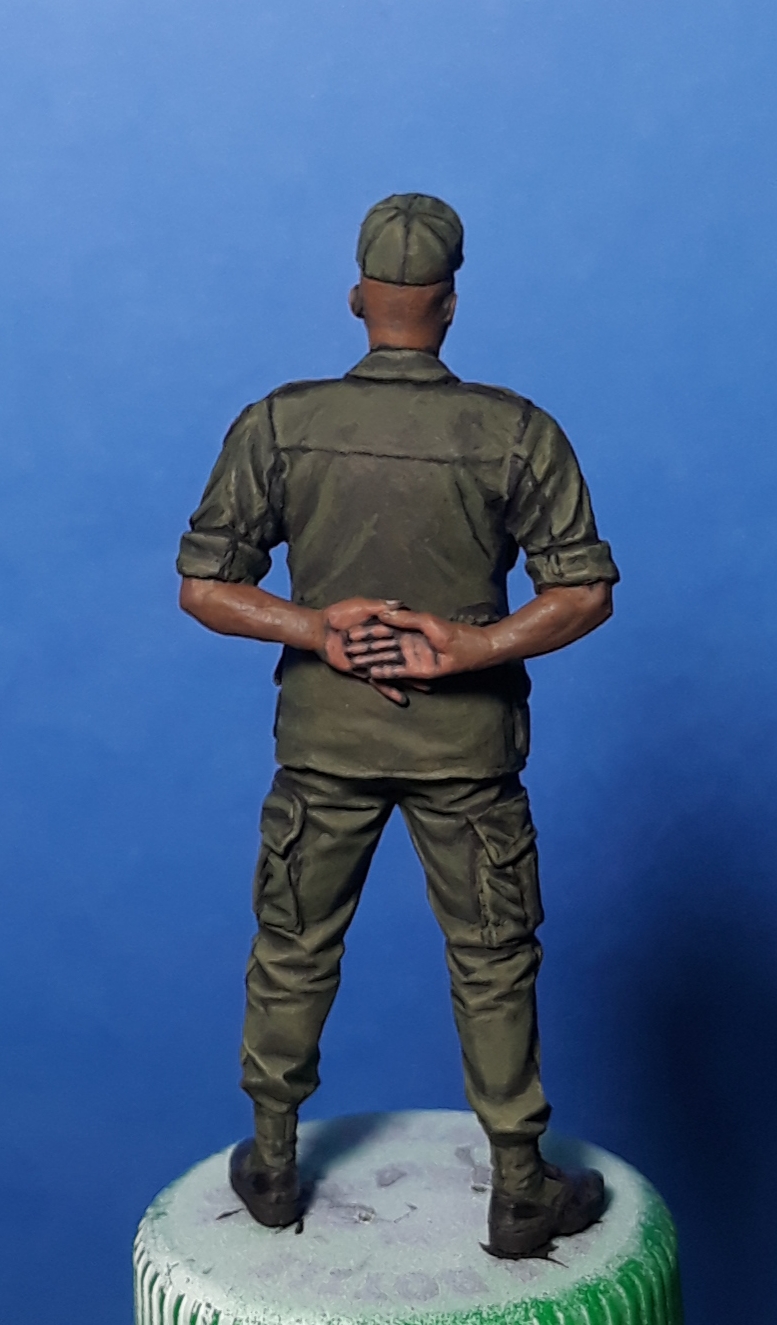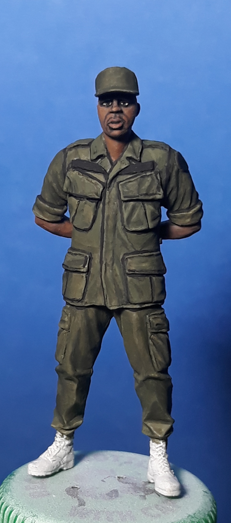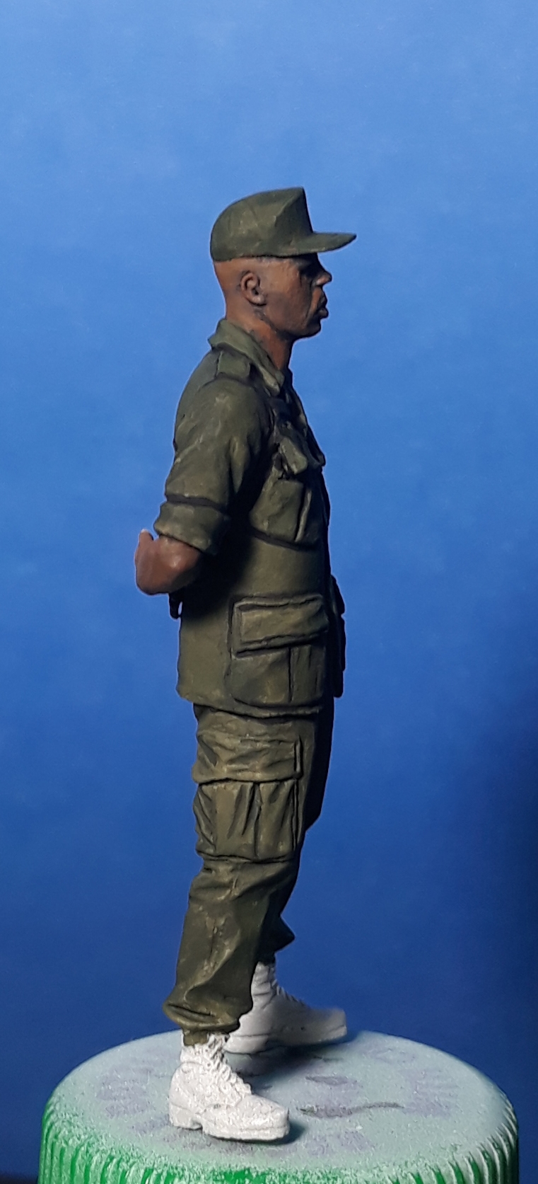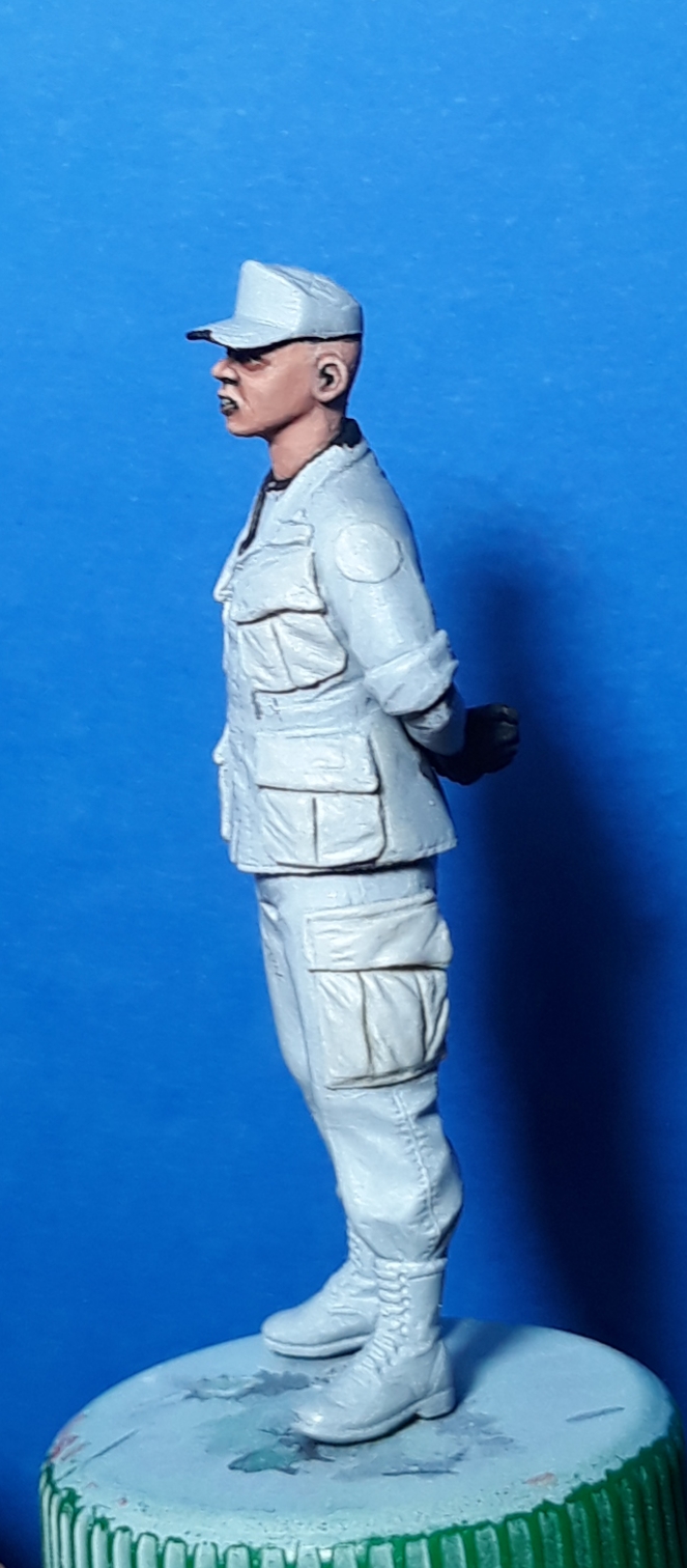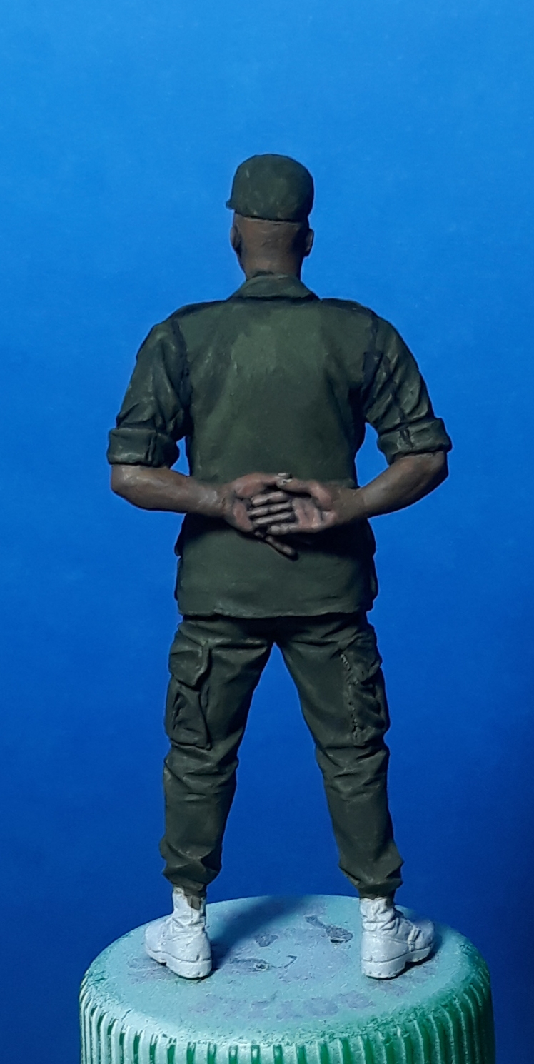 The storyline of this diorama is basically that of two new guys/replacements/FNGs being passed off to their new Squad Leader and Platoon Sergeant by an Admin Clerk. In order to make this a relatively quick project, I decided to use some of my recent conversions altering the one depicting the clerk by changing out the left hand that I originally placed a slingshot into and replacing it with one holding a clipboard. The Platoon Sergeant and Squad Leader figures were originally going to be pulling security for the MEDCAP, so they have weapons slung over their shoulders. I kind of wish I hadn't added the weapons yet as they would have rarely been carried around Camp Bearcat, but it is plausible that they had returned to basecamp for some other reason and were summoned over to S1 to pick up the new guys before they headed back out to the field.