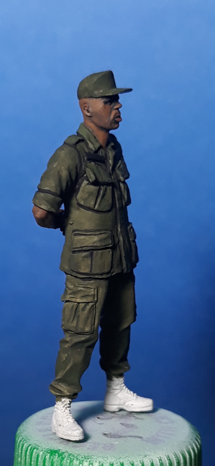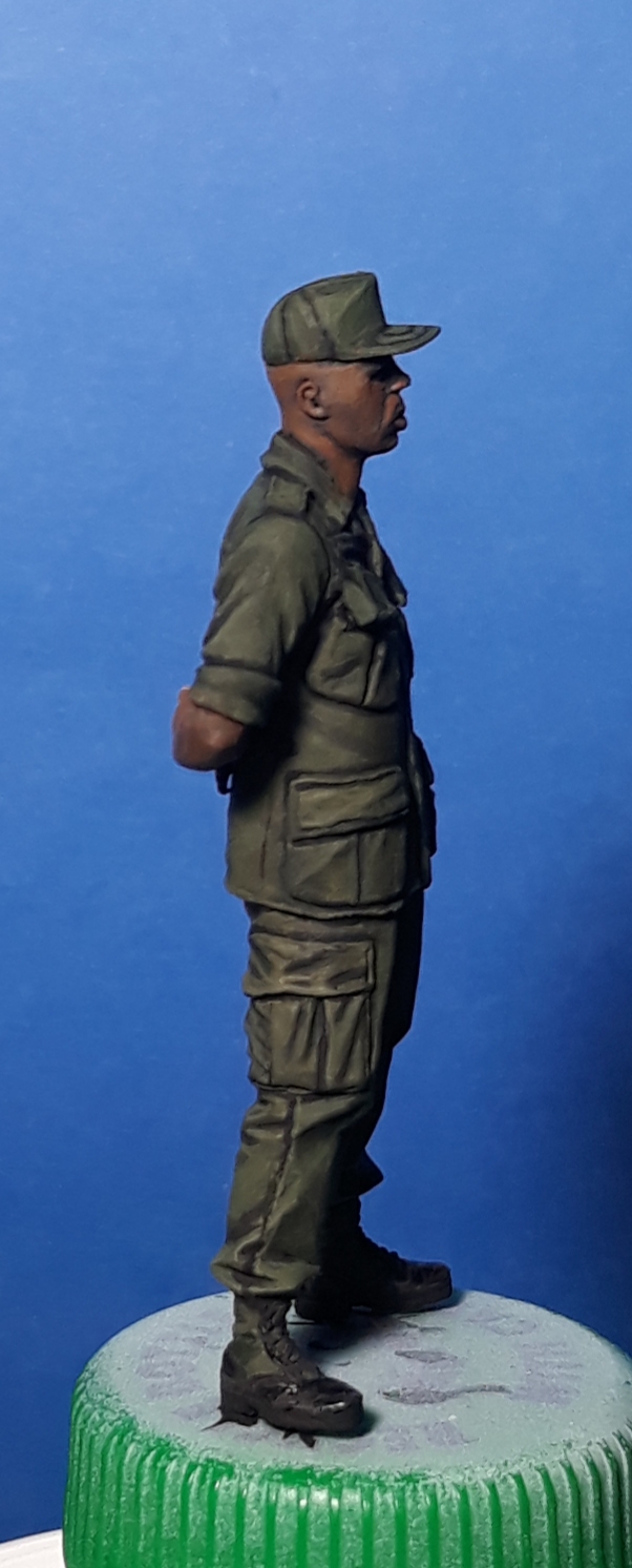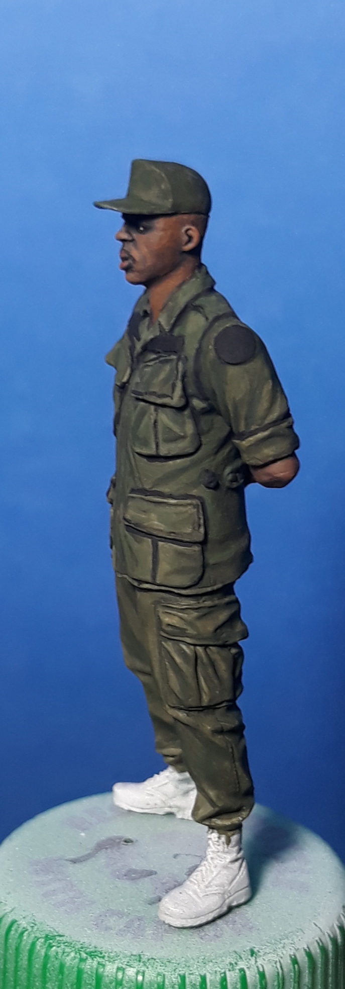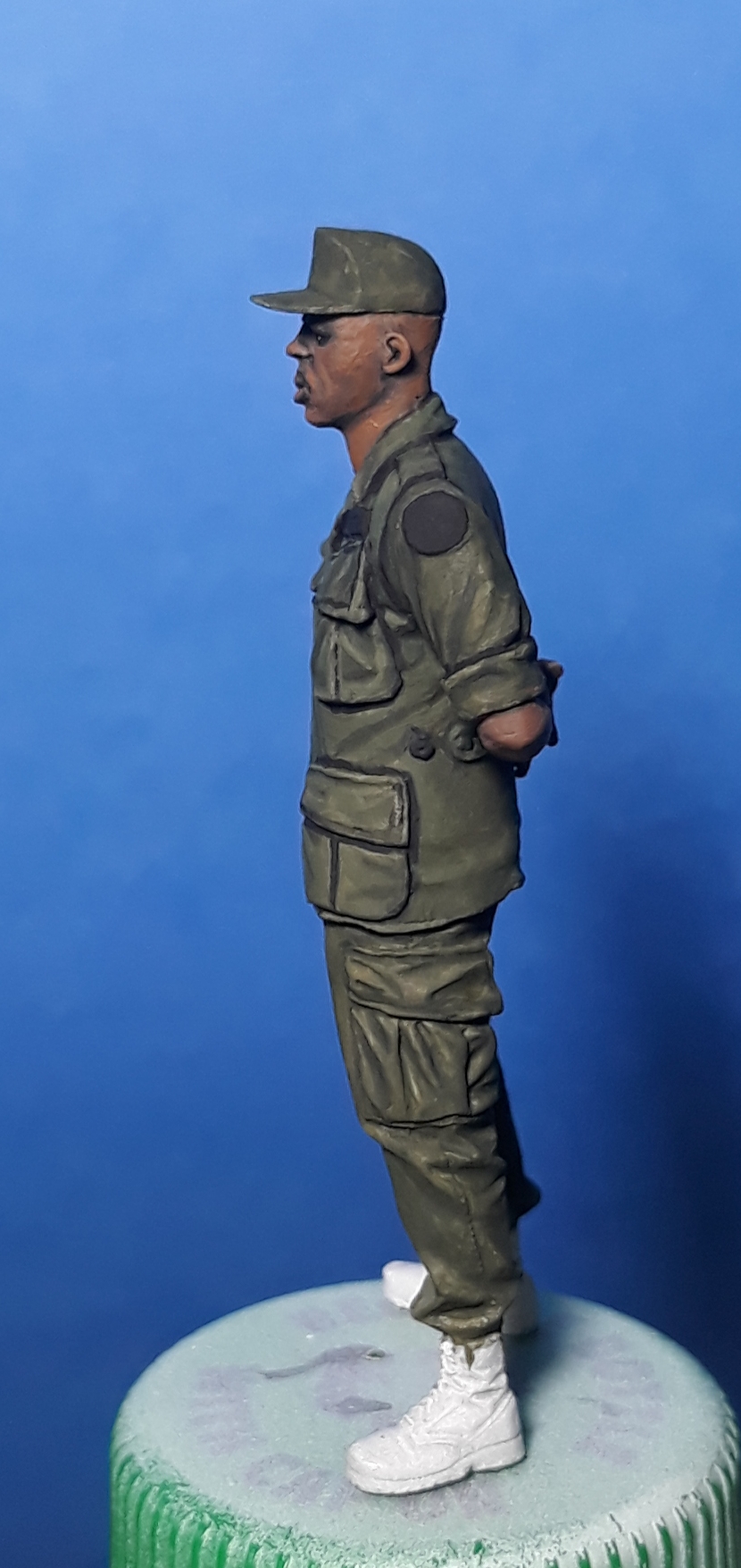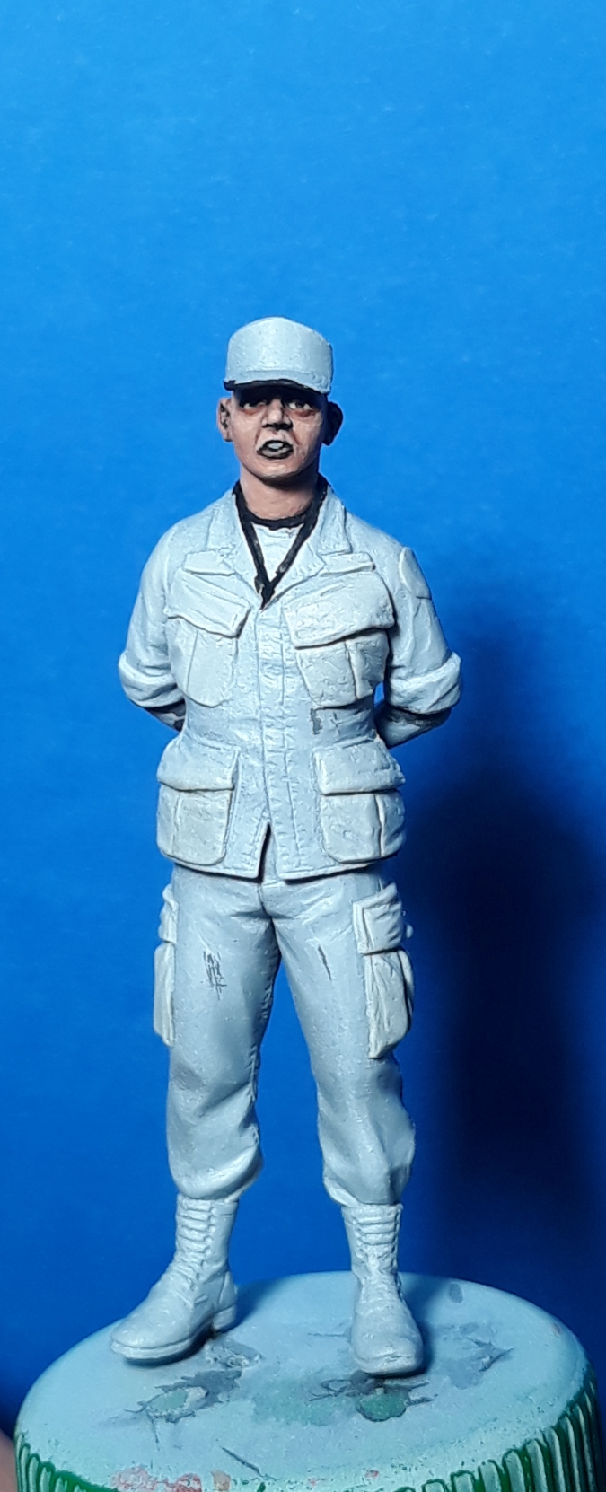 The storyline of this diorama is basically that of two new guys/replacements/FNGs being passed off to their new Squad Leader and Platoon Sergeant by an Admin Clerk. In order to make this a relatively quick project, I decided to use some of my recent conversions altering the one depicting the clerk by changing out the left hand that I originally placed a slingshot into and replacing it with one holding a clipboard. The Platoon Sergeant and Squad Leader figures were originally going to be pulling security for the MEDCAP, so they have weapons slung over their shoulders. I kind of wish I hadn't added the weapons yet as they would have rarely been carried around Camp Bearcat, but it is plausible that they had returned to basecamp for some other reason and were summoned over to S1 to pick up the new guys before they headed back out to the field.