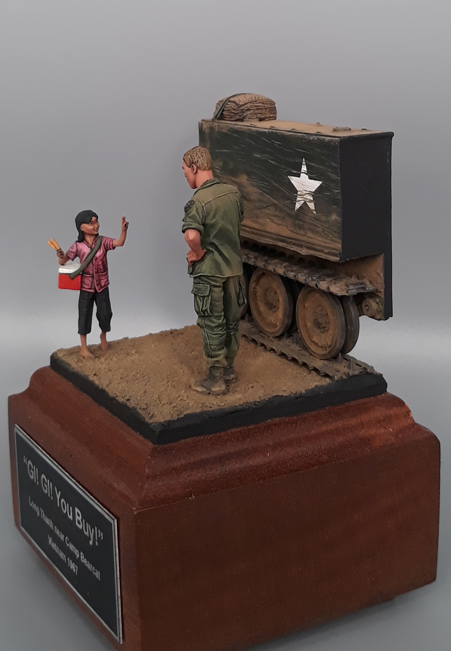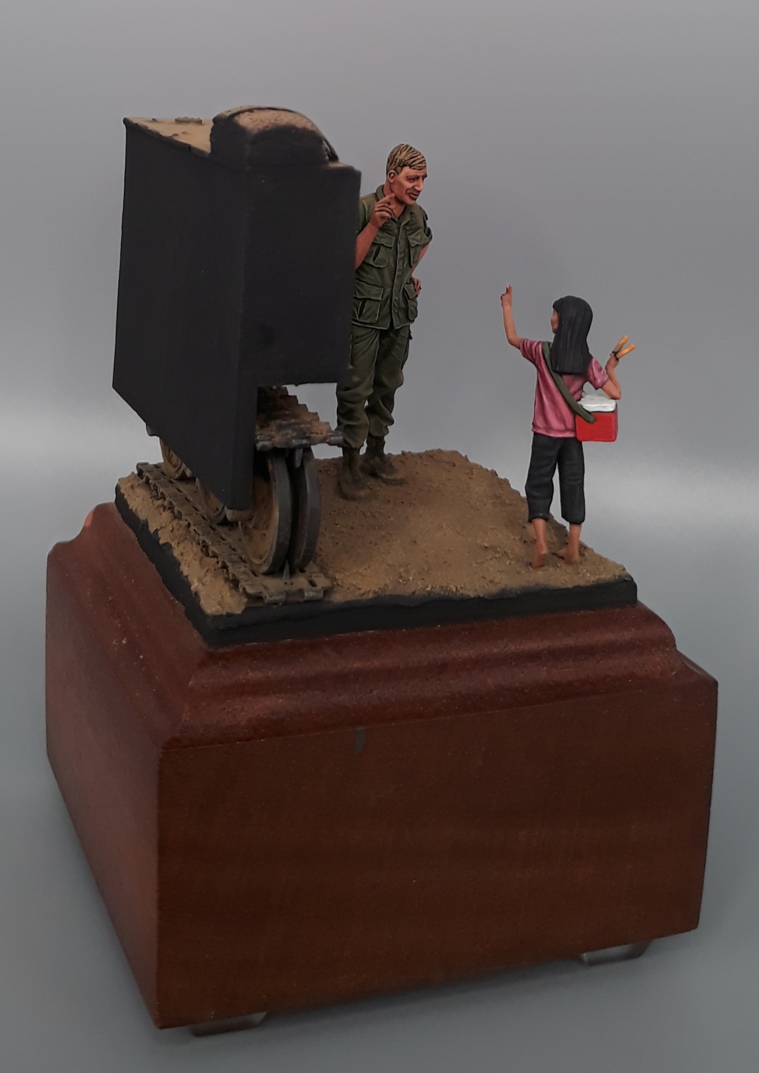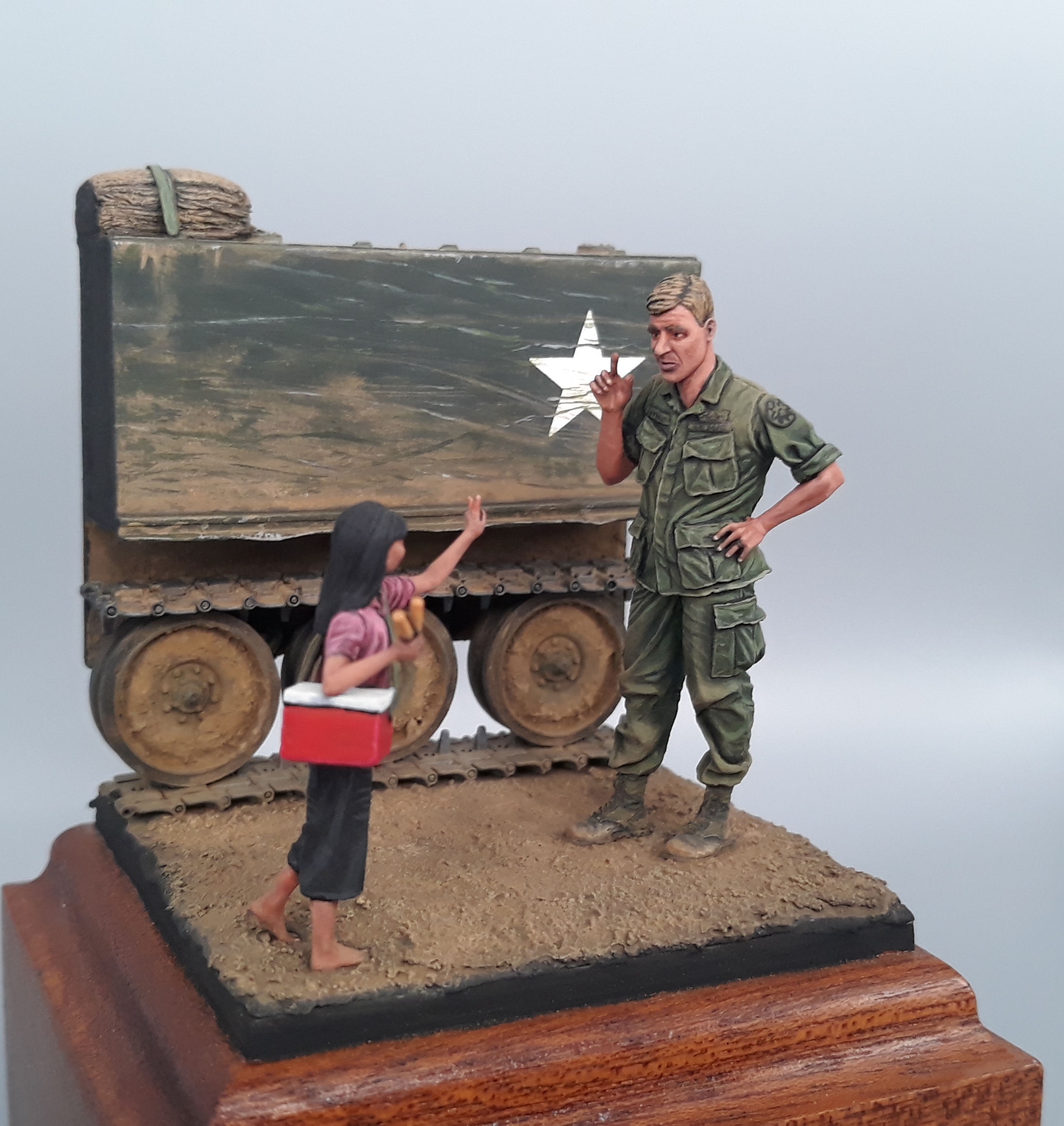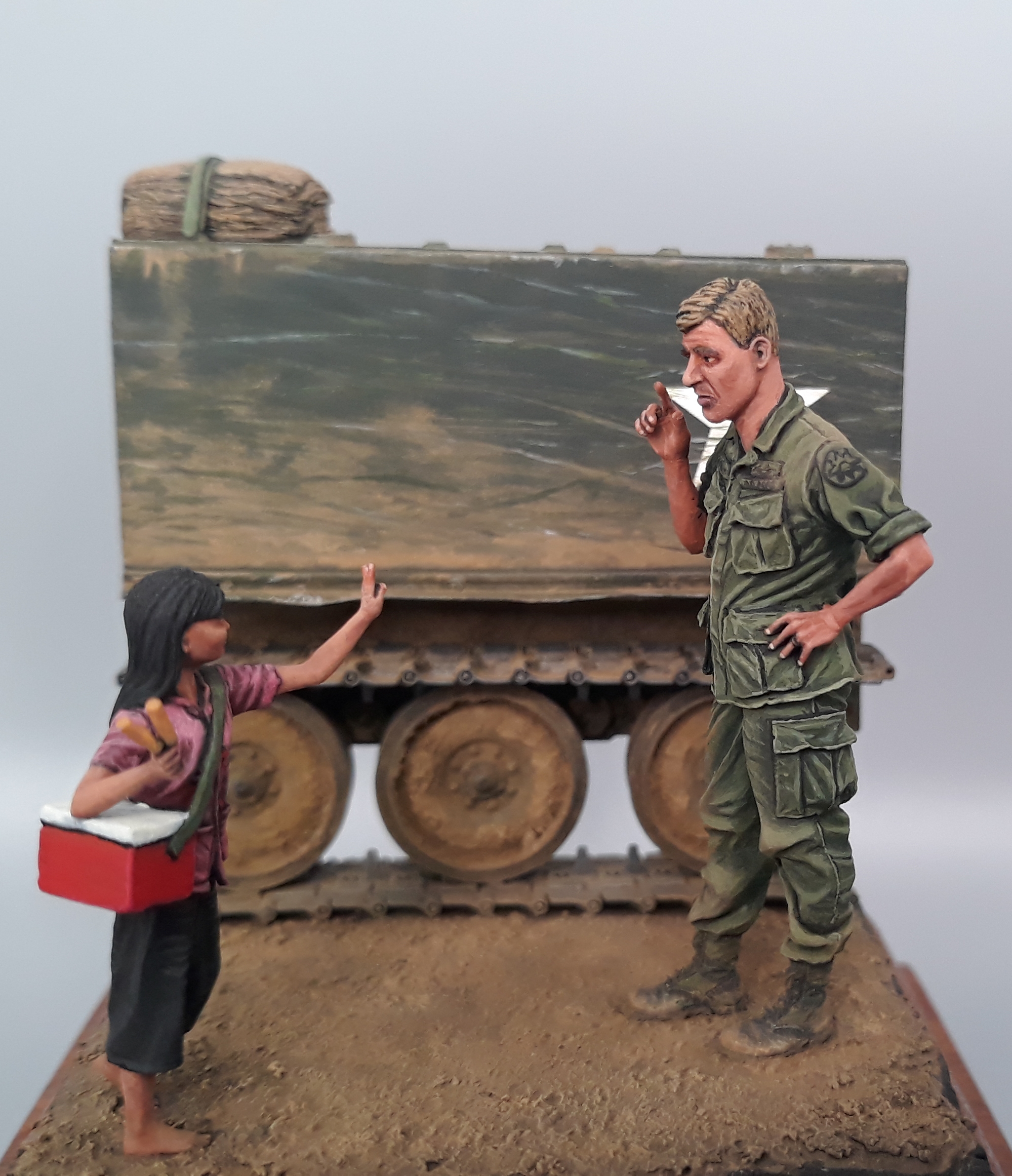 Last night I completed the second vignette/diorama for my "Shopping in Long Thanh" diorama series. It is a fairly simple vignette but I think it turned out well. The American Soldier is a Bravo 6 conversion and the Vietnamese girl is from Paracel Miniatures. The M113 "wedgie" that is being used as a backdrop was made by cutting up an Italeri M113, adding just the rail portion of the side skirts from AFV Club, using track sections from Model Kasten, and topping it off with a bundle of empty sandbags strapped down and used for a softer seat on the upper deck. The groundwork is a layer of Magic Sculpt with AK Interactive ground texture spread on top. Once dry, it was colored with pigments and acrylics. The figures were painted in acrylics as is the M113.