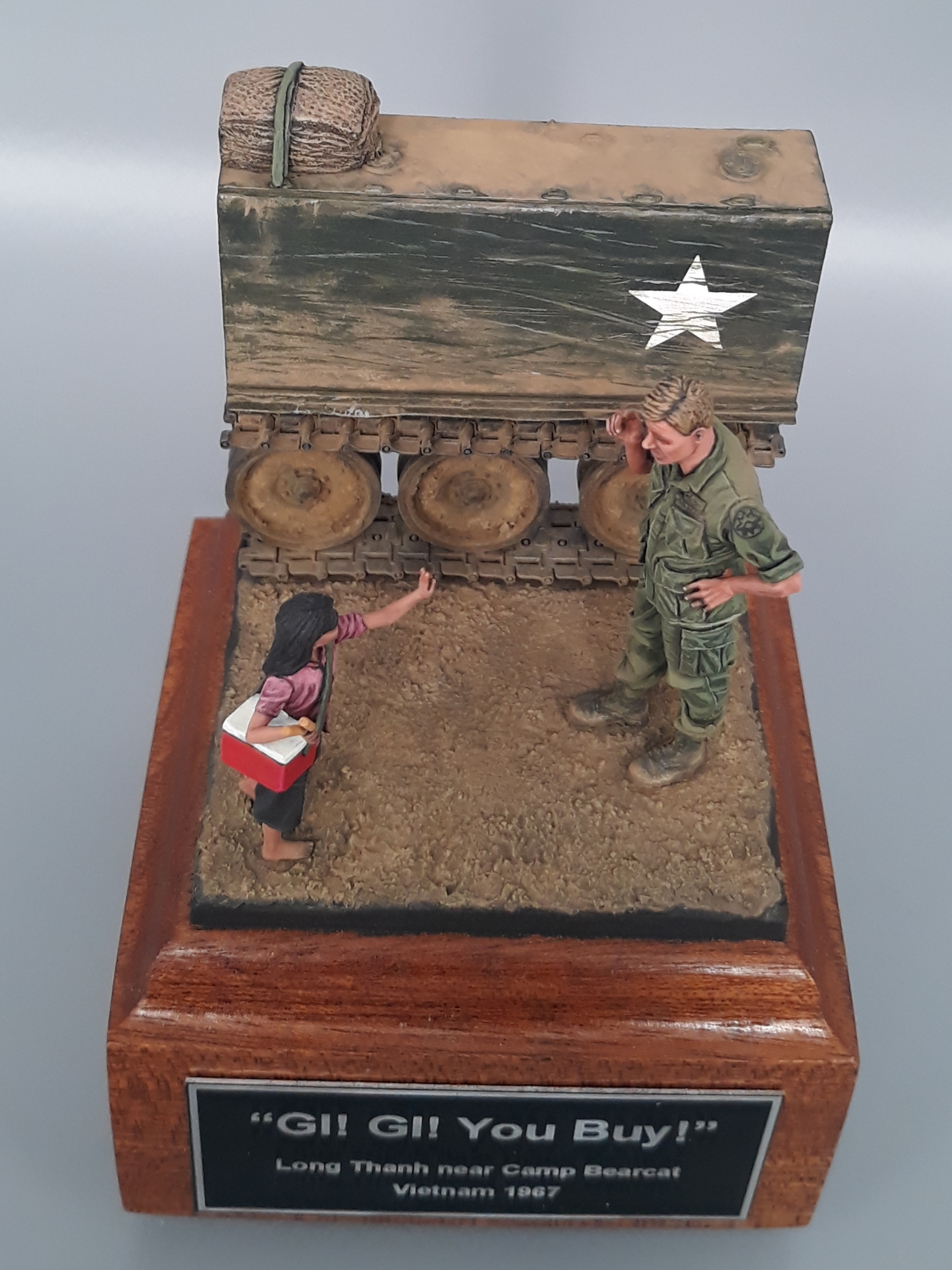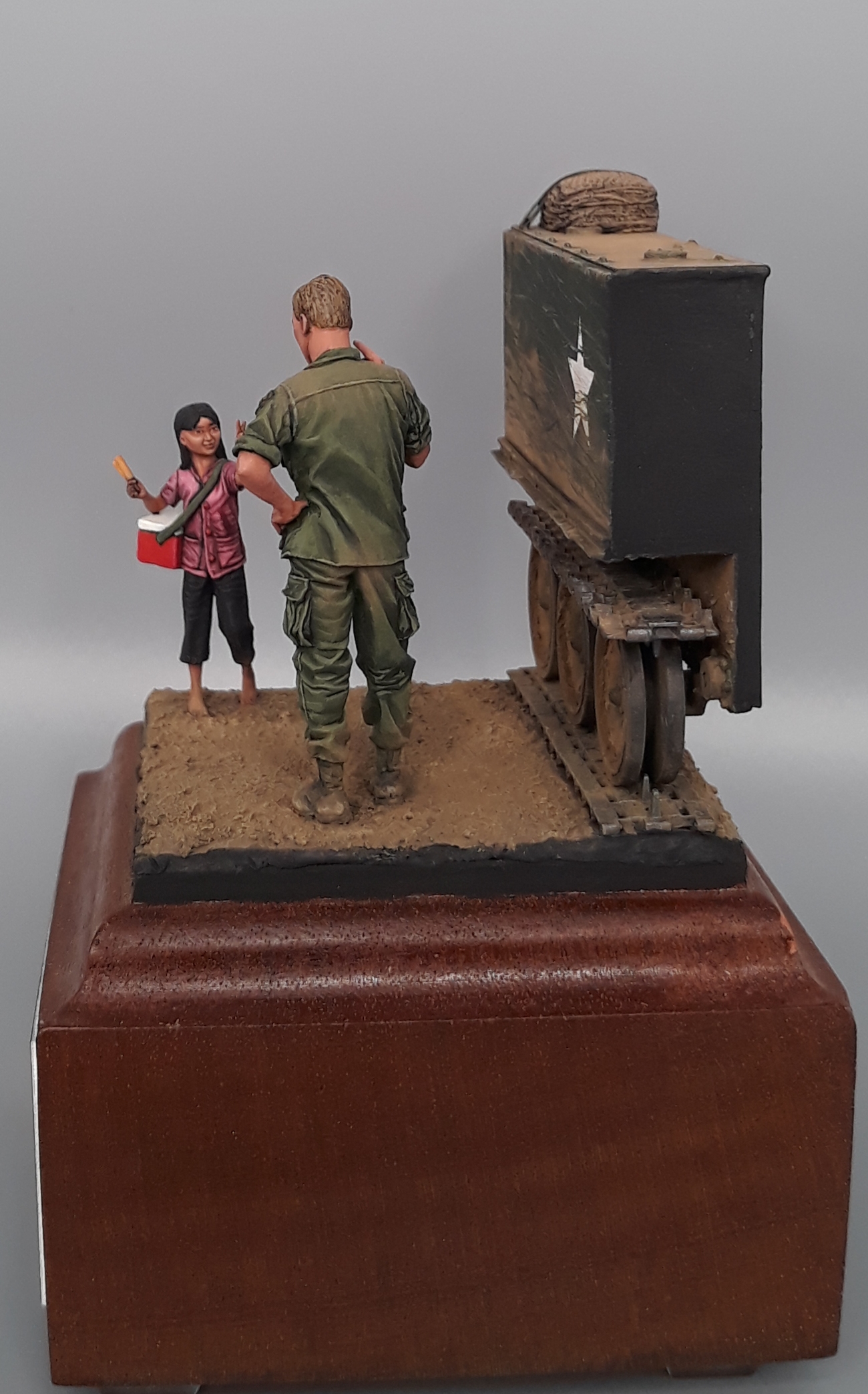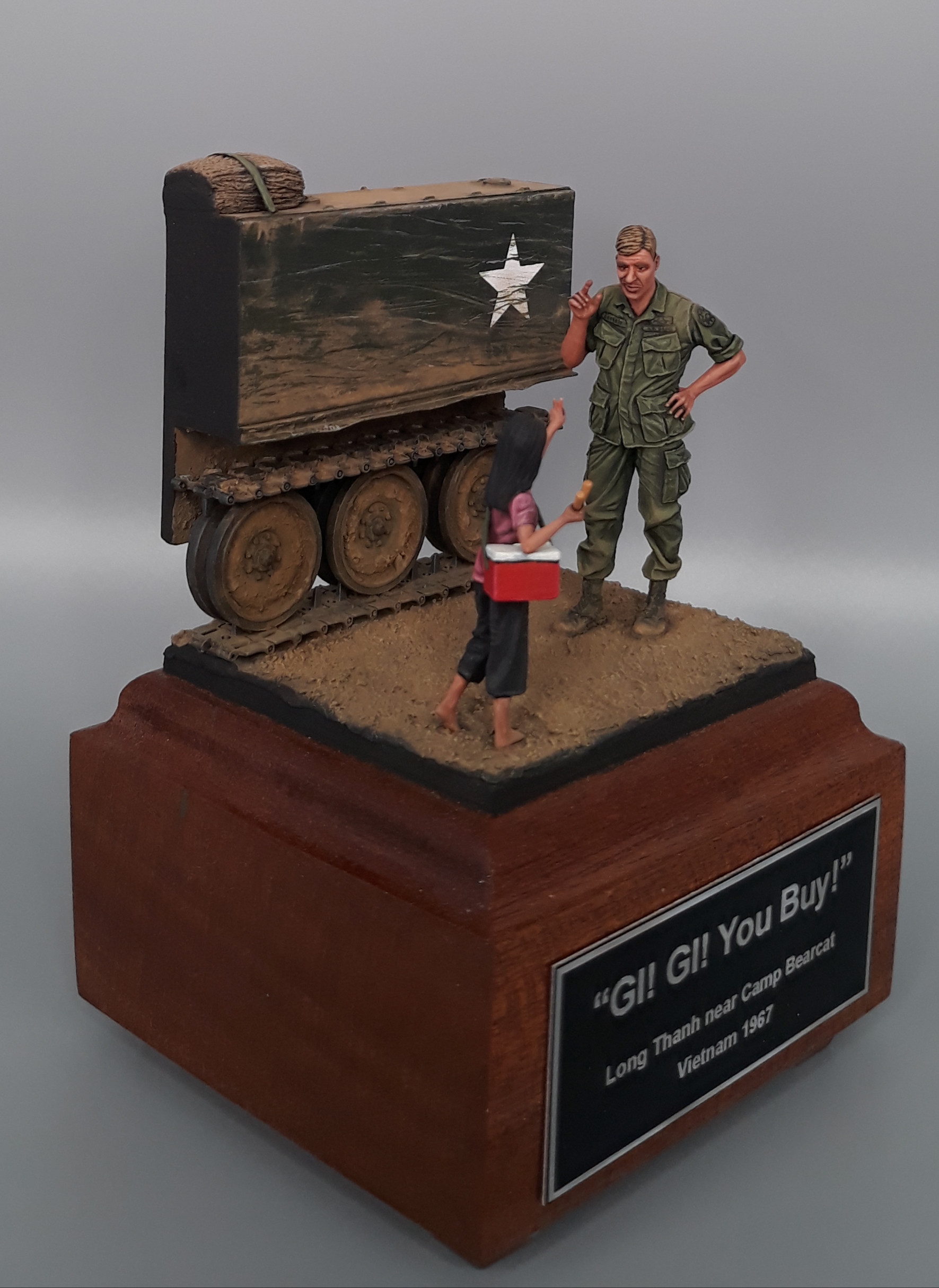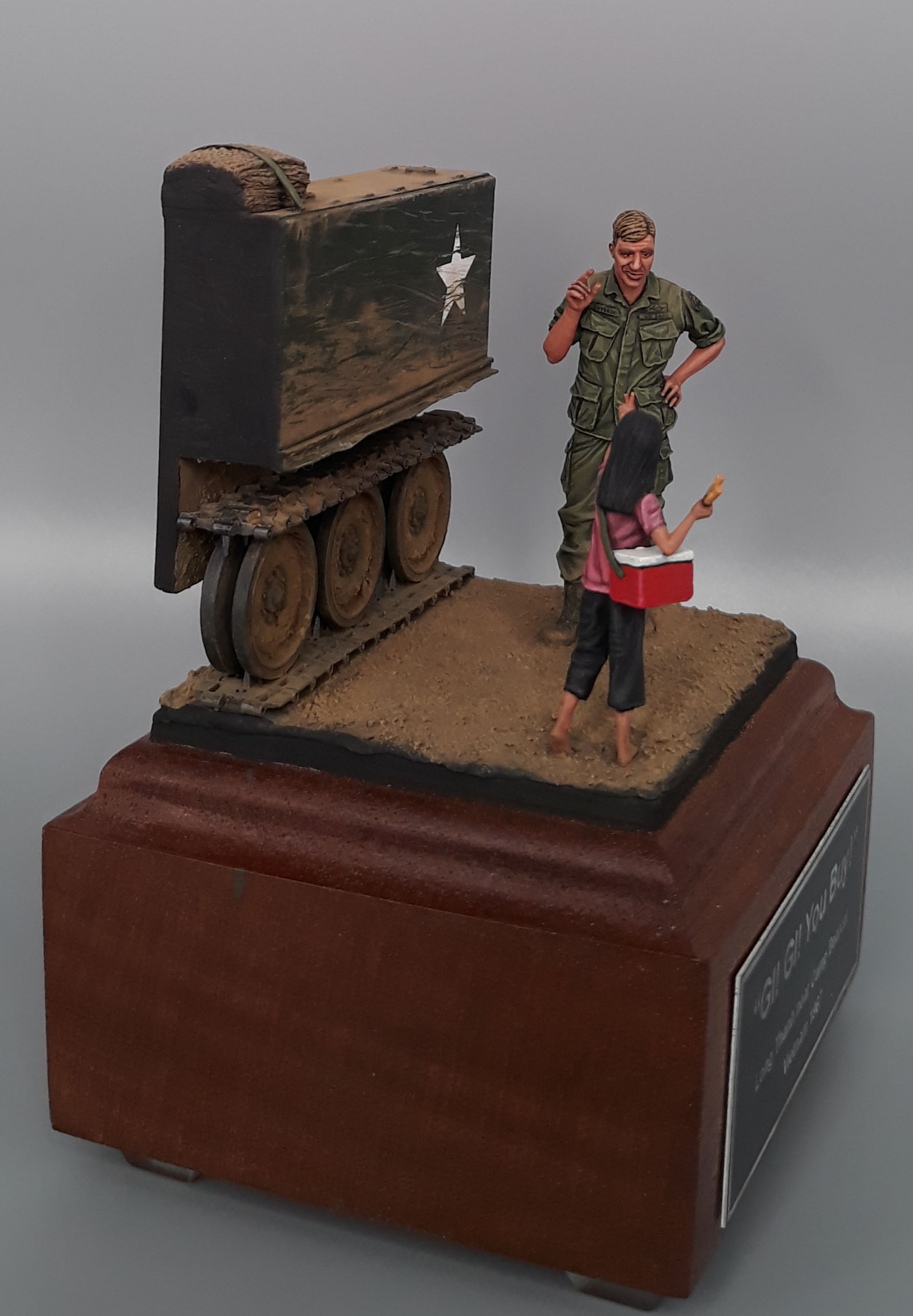 Last night I completed the second vignette/diorama for my "Shopping in Long Thanh" diorama series. It is a fairly simple vignette but I think it turned out well. The American Soldier is a Bravo 6 conversion and the Vietnamese girl is from Paracel Miniatures. The M113 "wedgie" that is being used as a backdrop was made by cutting up an Italeri M113, adding just the rail portion of the side skirts from AFV Club, using track sections from Model Kasten, and topping it off with a bundle of empty sandbags strapped down and used for a softer seat on the upper deck. The groundwork is a layer of Magic Sculpt with AK Interactive ground texture spread on top. Once dry, it was colored with pigments and acrylics. The figures were painted in acrylics as is the M113.