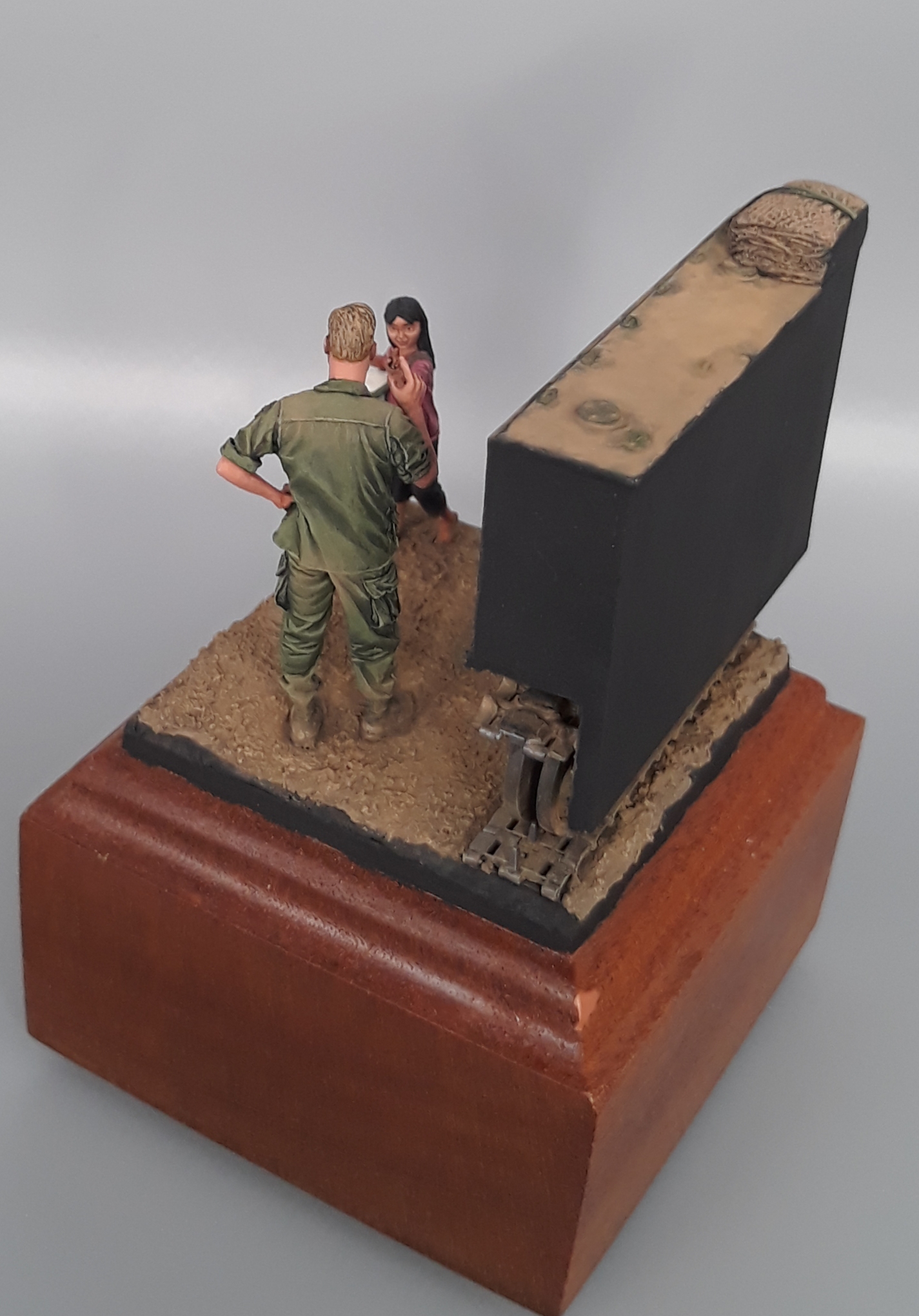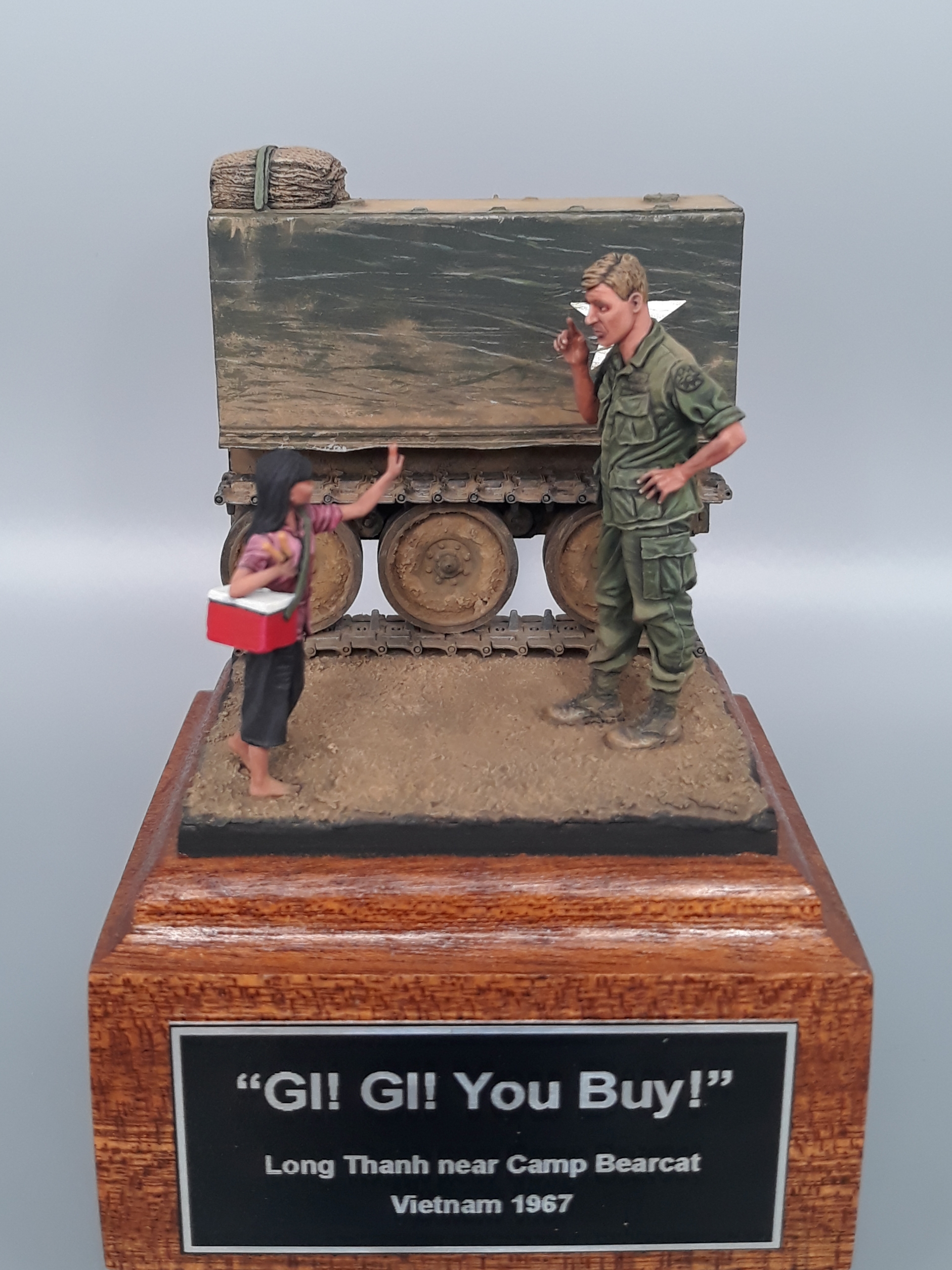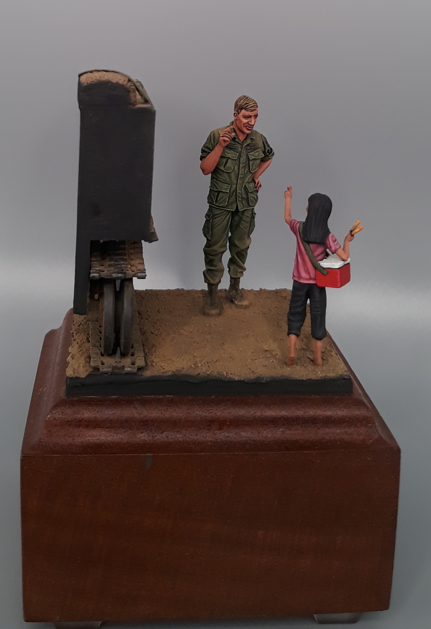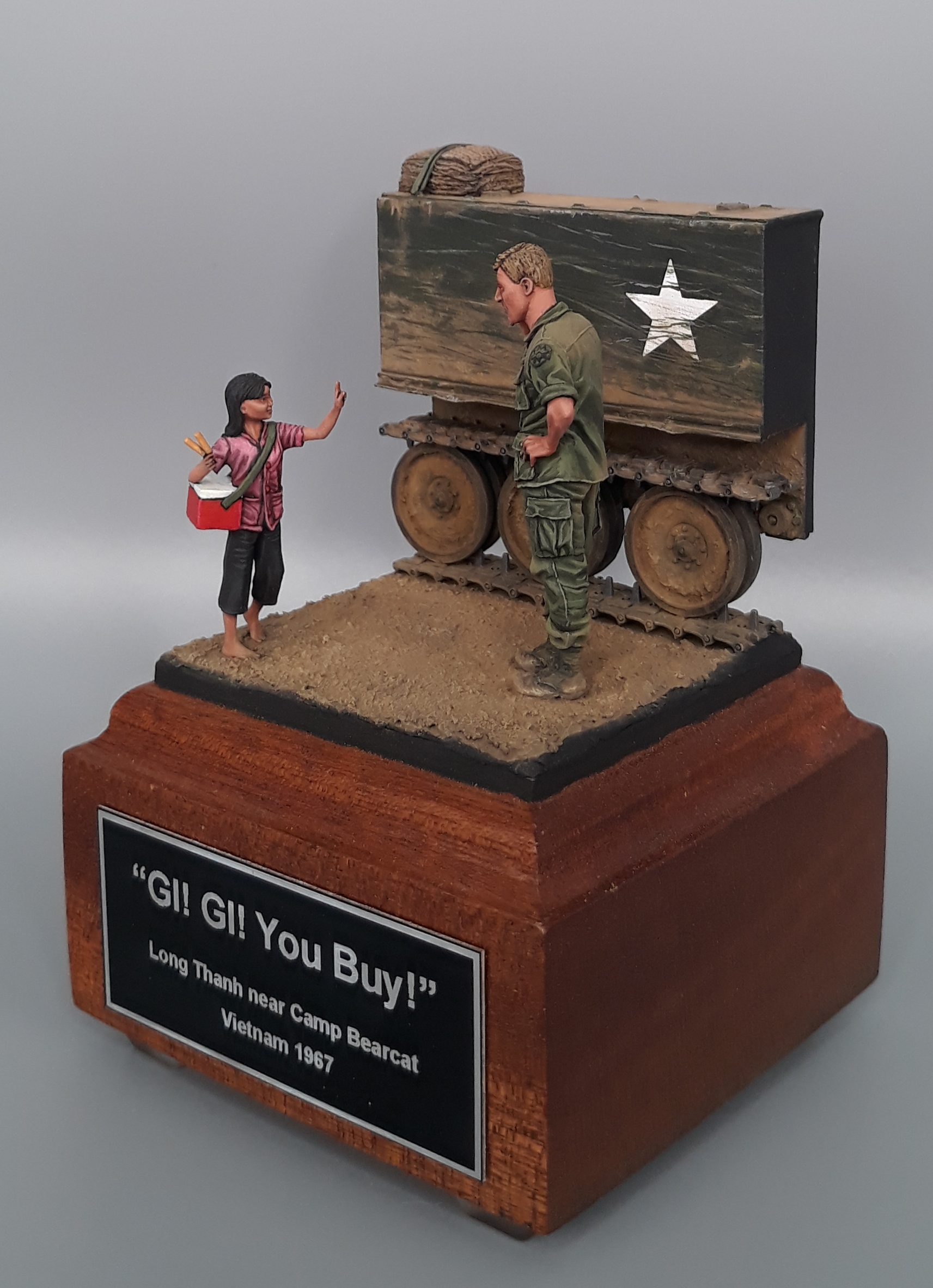 Last night I completed the second vignette/diorama for my "Shopping in Long Thanh" diorama series. It is a fairly simple vignette but I think it turned out well. The American Soldier is a Bravo 6 conversion and the Vietnamese girl is from Paracel Miniatures. The M113 "wedgie" that is being used as a backdrop was made by cutting up an Italeri M113, adding just the rail portion of the side skirts from AFV Club, using track sections from Model Kasten, and topping it off with a bundle of empty sandbags strapped down and used for a softer seat on the upper deck. The groundwork is a layer of Magic Sculpt with AK Interactive ground texture spread on top. Once dry, it was colored with pigments and acrylics. The figures were painted in acrylics as is the M113.