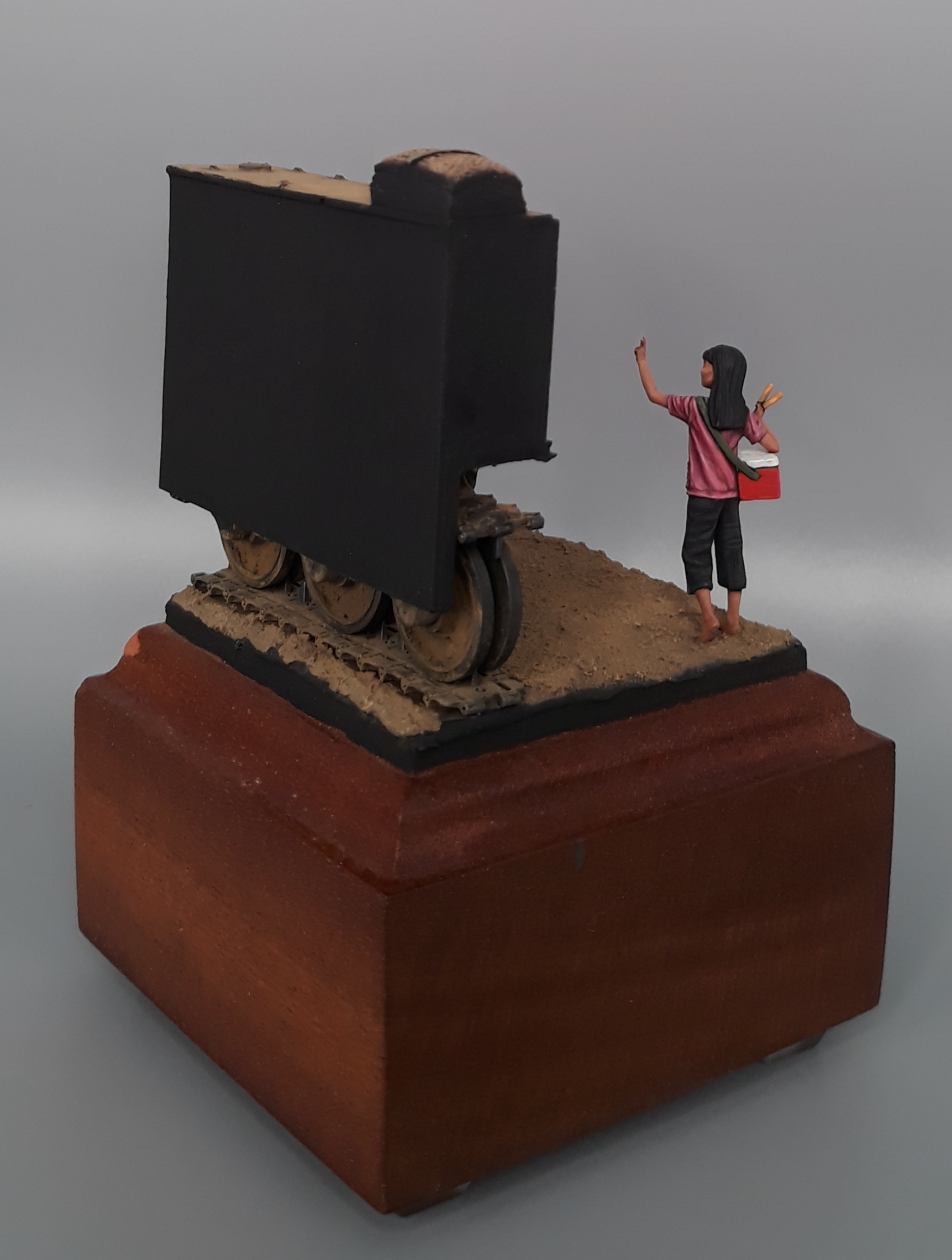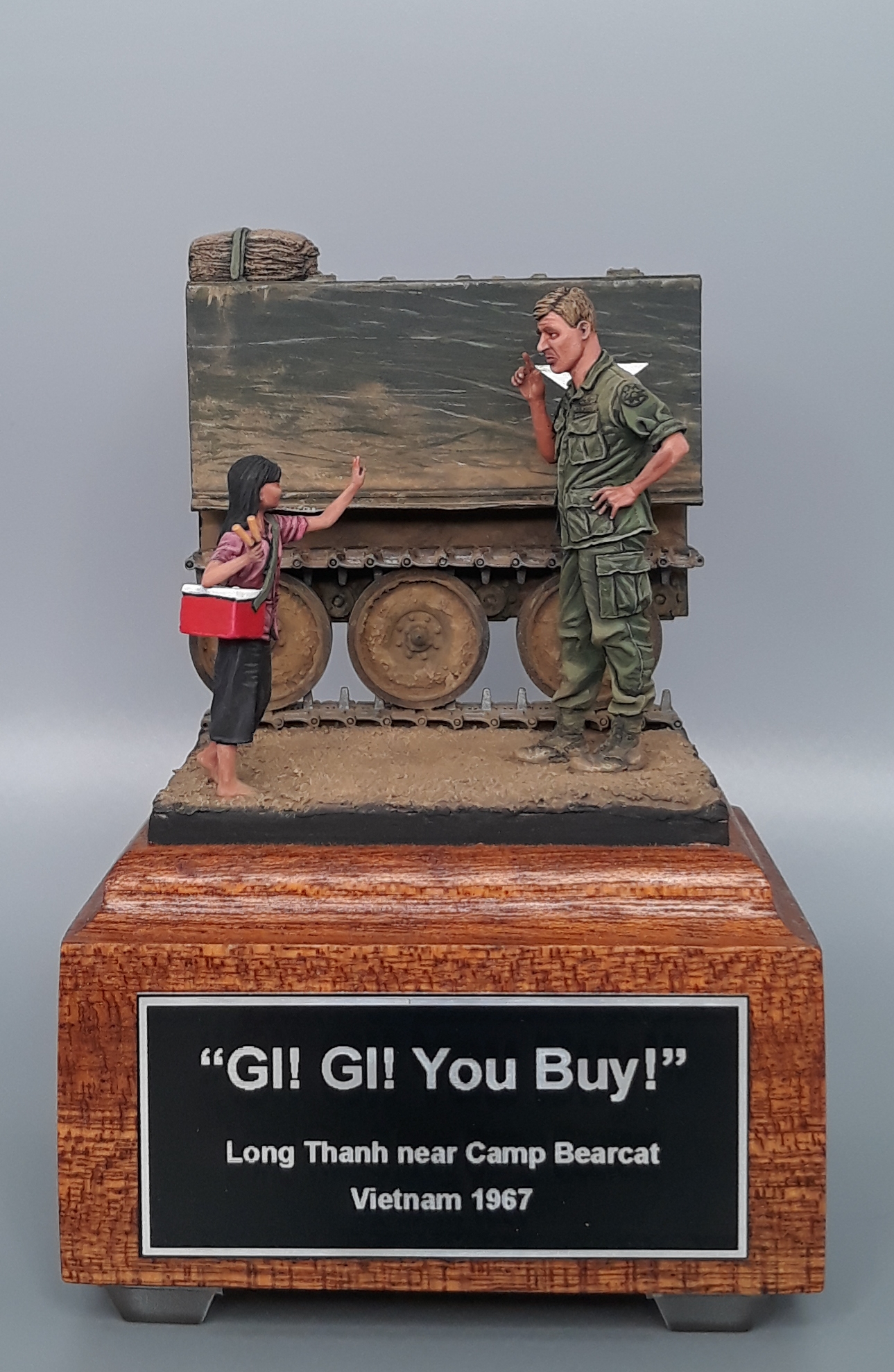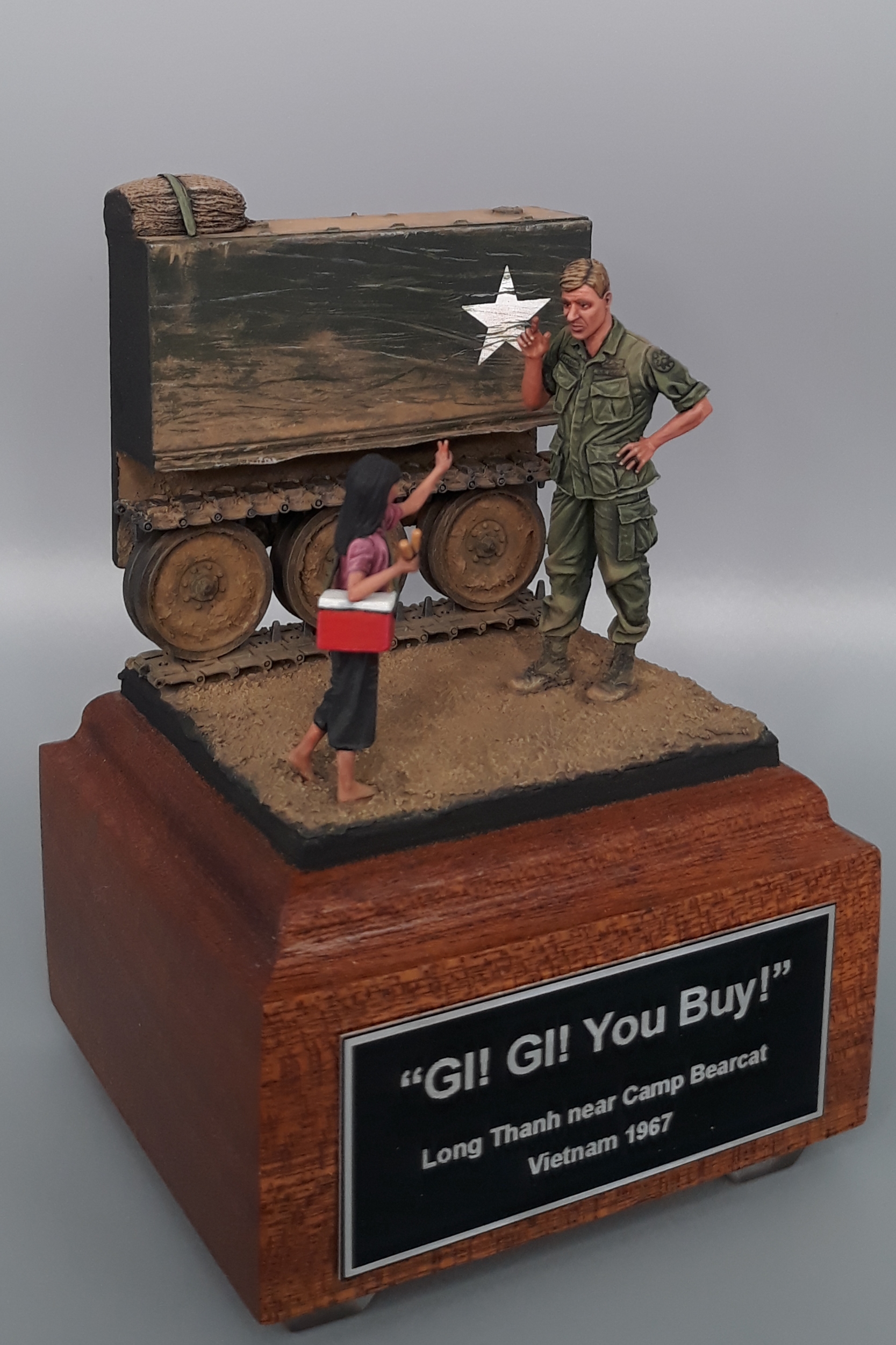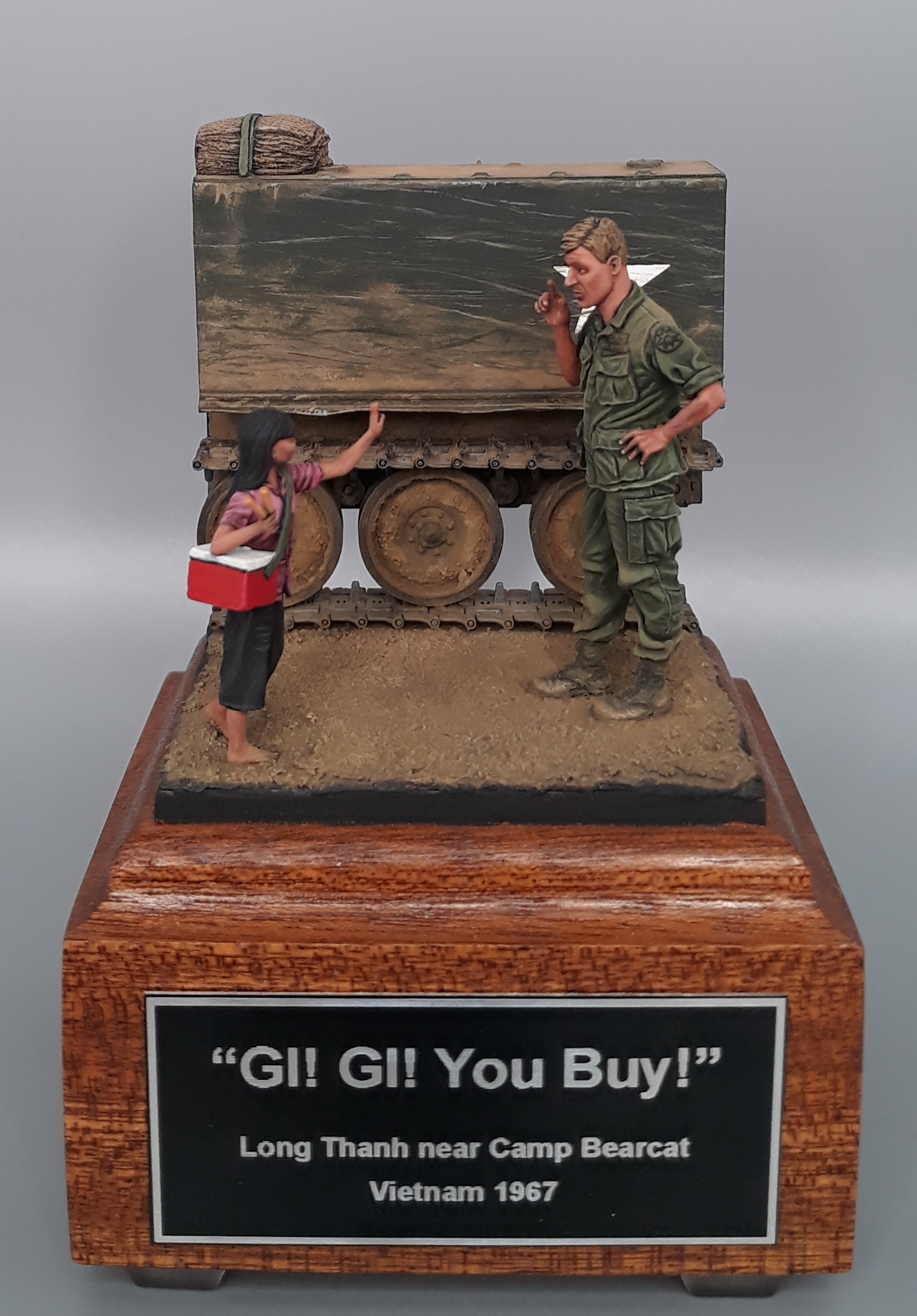 Last night I completed the second vignette/diorama for my "Shopping in Long Thanh" diorama series. It is a fairly simple vignette but I think it turned out well. The American Soldier is a Bravo 6 conversion and the Vietnamese girl is from Paracel Miniatures. The M113 "wedgie" that is being used as a backdrop was made by cutting up an Italeri M113, adding just the rail portion of the side skirts from AFV Club, using track sections from Model Kasten, and topping it off with a bundle of empty sandbags strapped down and used for a softer seat on the upper deck. The groundwork is a layer of Magic Sculpt with AK Interactive ground texture spread on top. Once dry, it was colored with pigments and acrylics. The figures were painted in acrylics as is the M113.