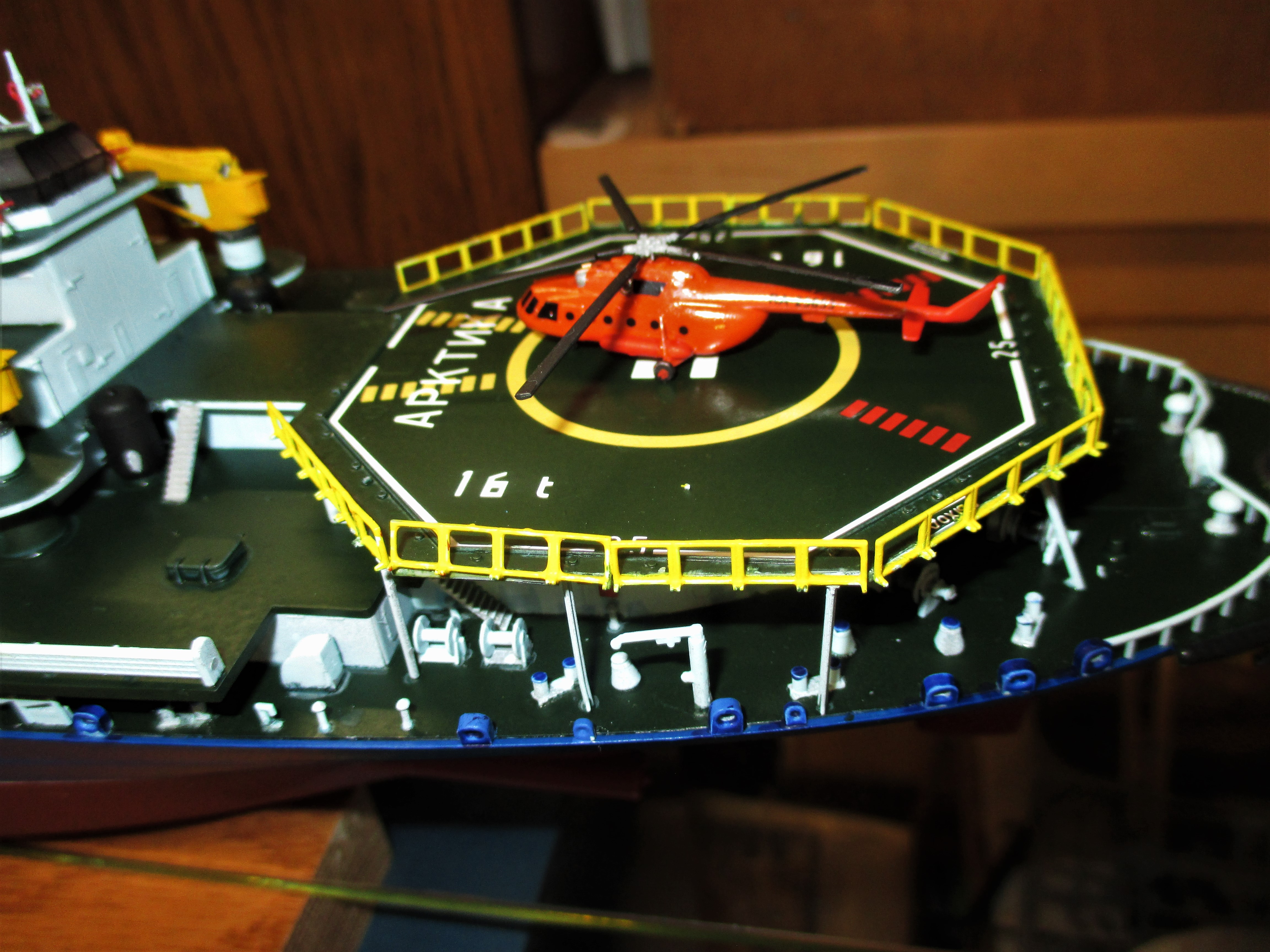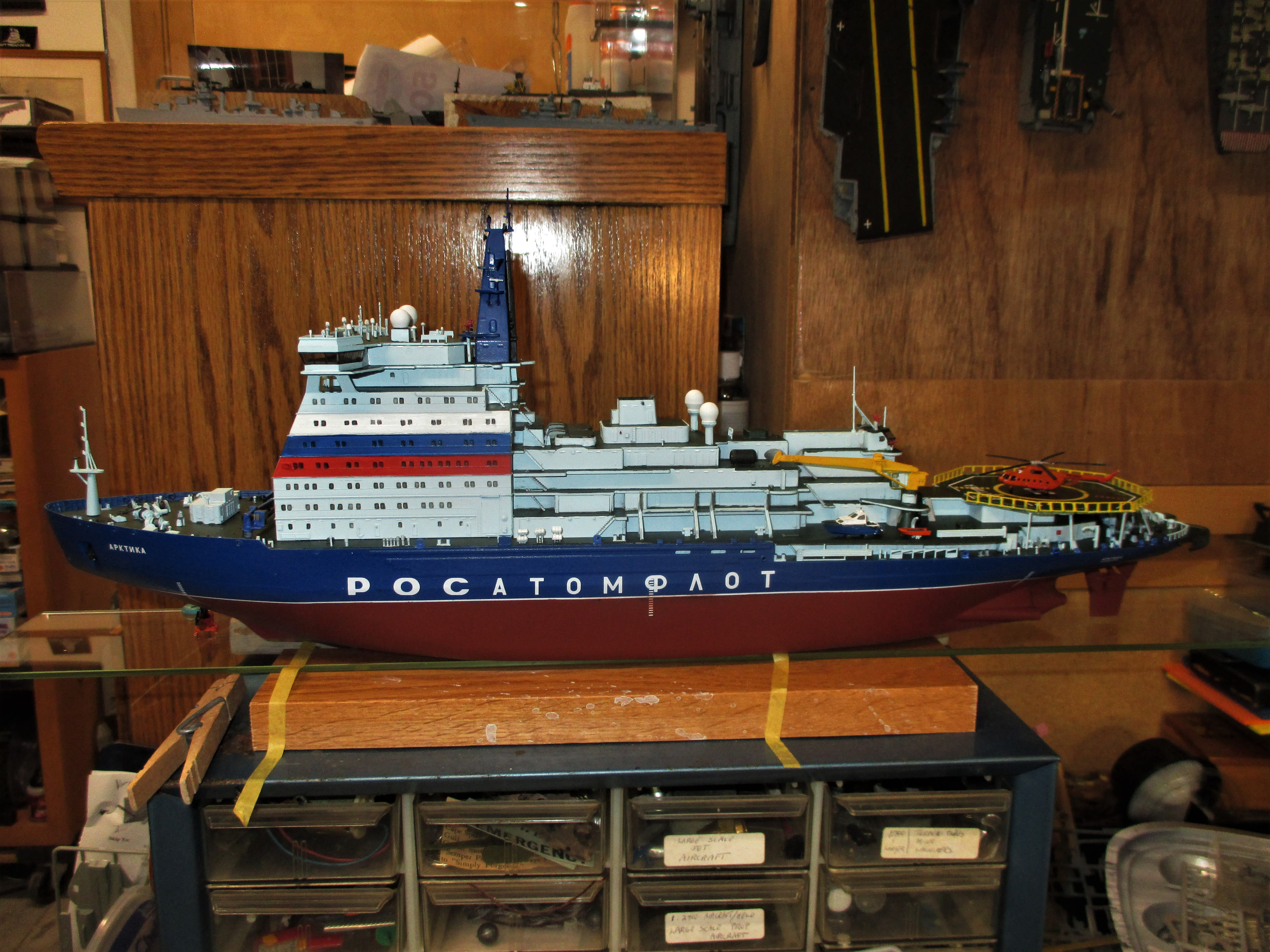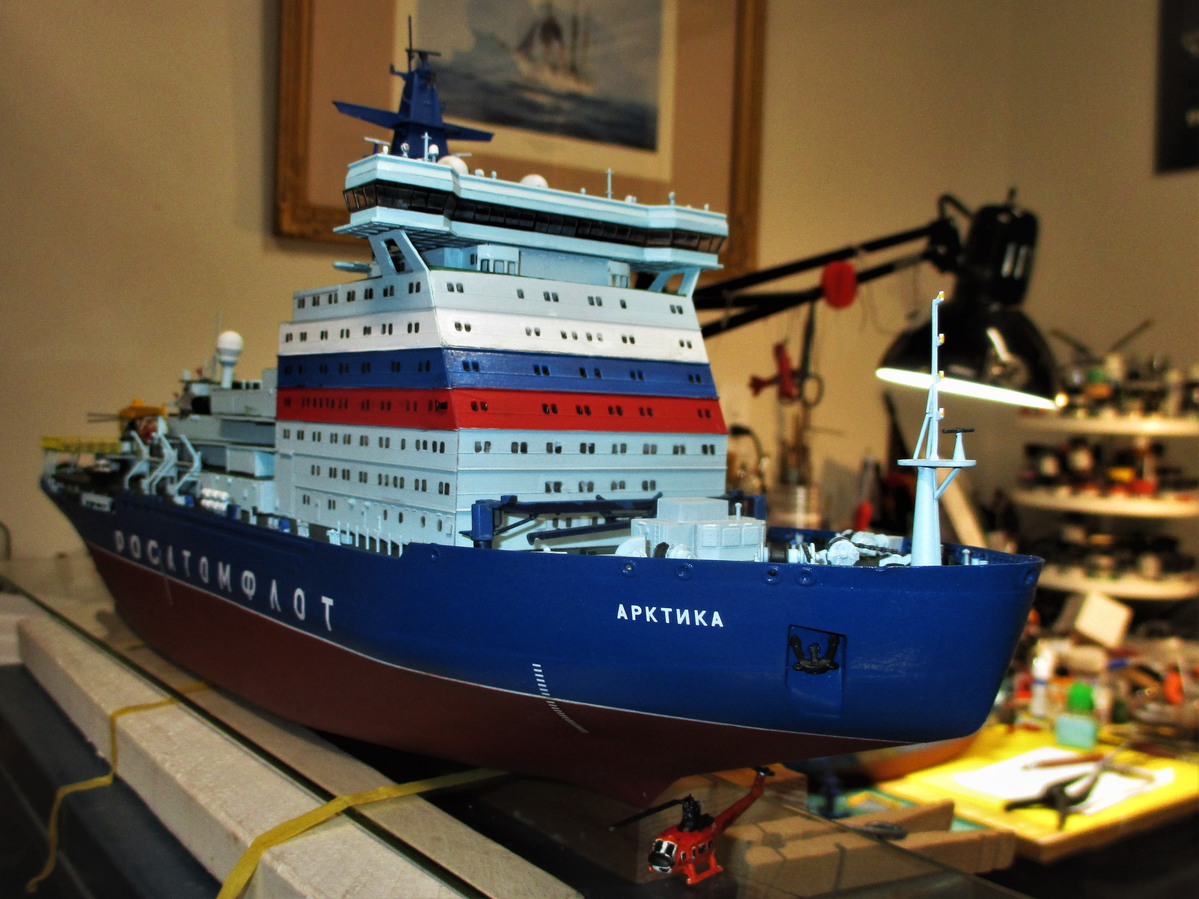 Since Mark Karolus had the split-personality disorder with his camera Sunday, I thought I might post pictures of his Zvezda 1/350 Russian nuclear icebreaker "Arktika". This was another kit for review on finescale modeler. He got Him for free.