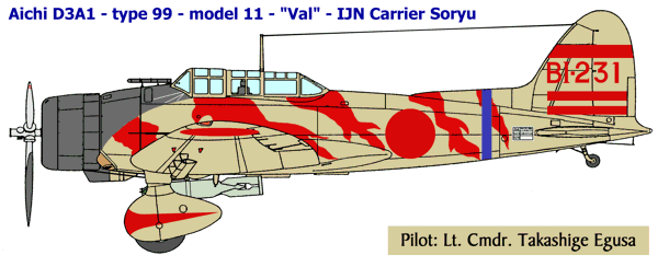 There are however several independent and consistent eye witnesses that state that Lt. Cdr Takashige Egusa aboard Soryu did have a colourful red pattern on his plane nicknamed "jaja-uma".