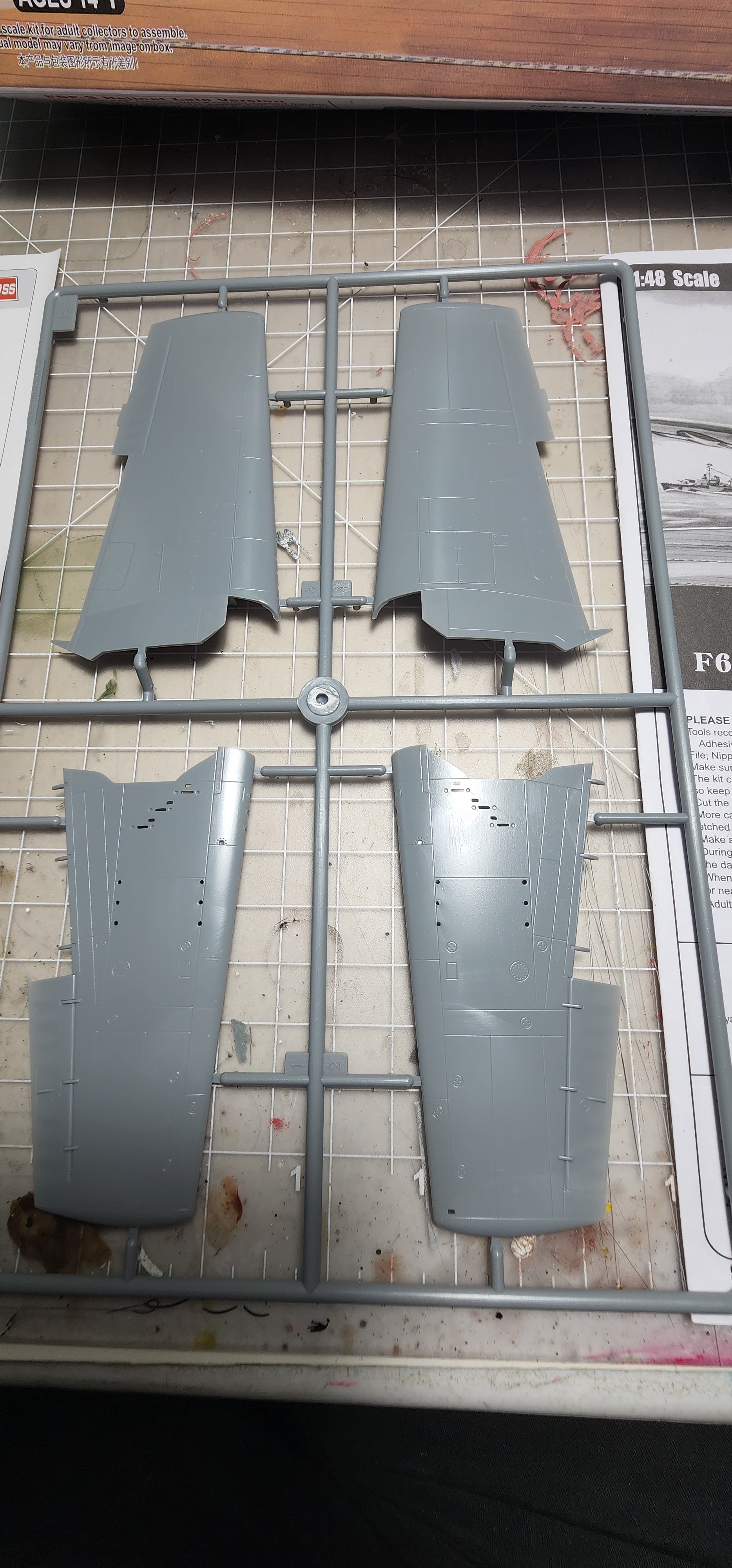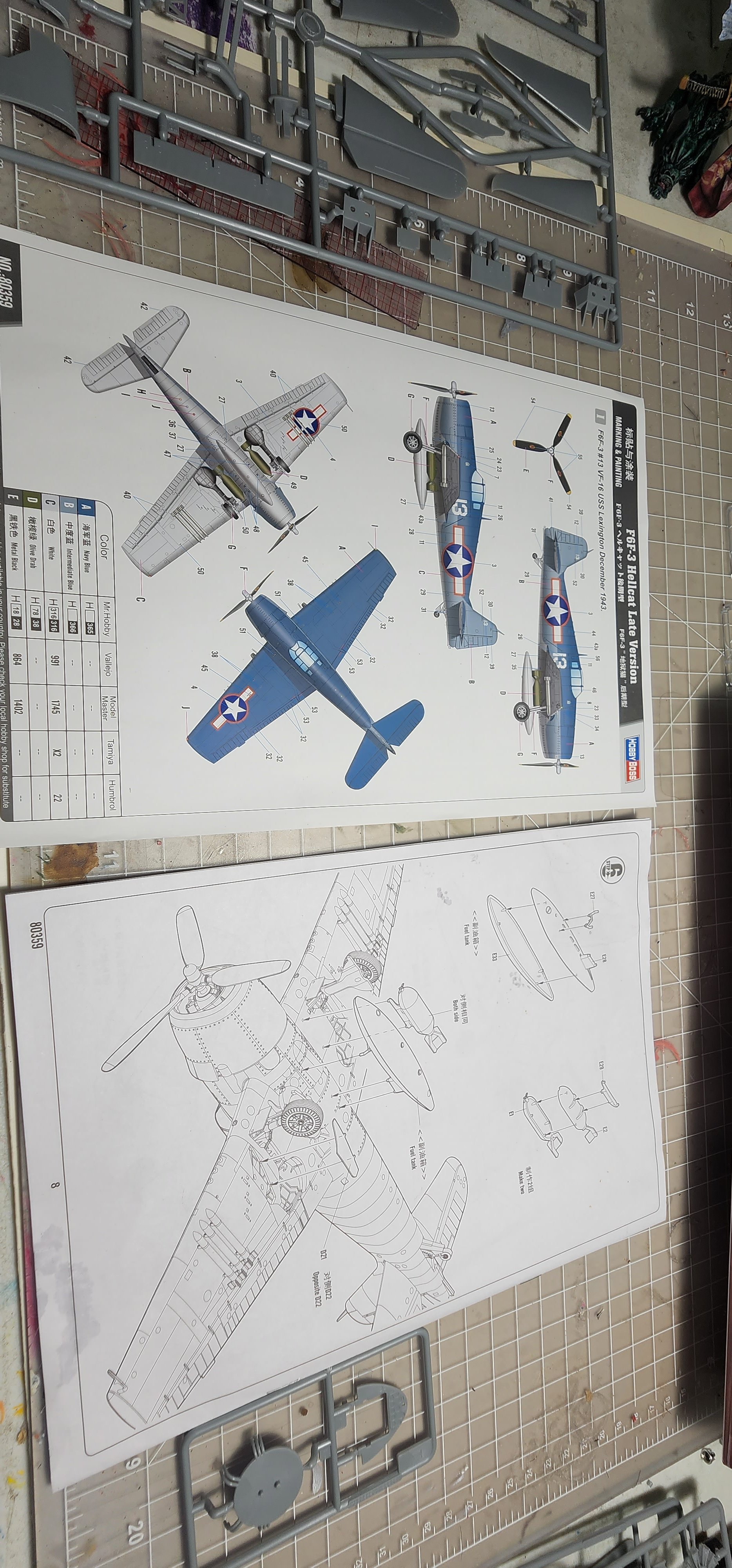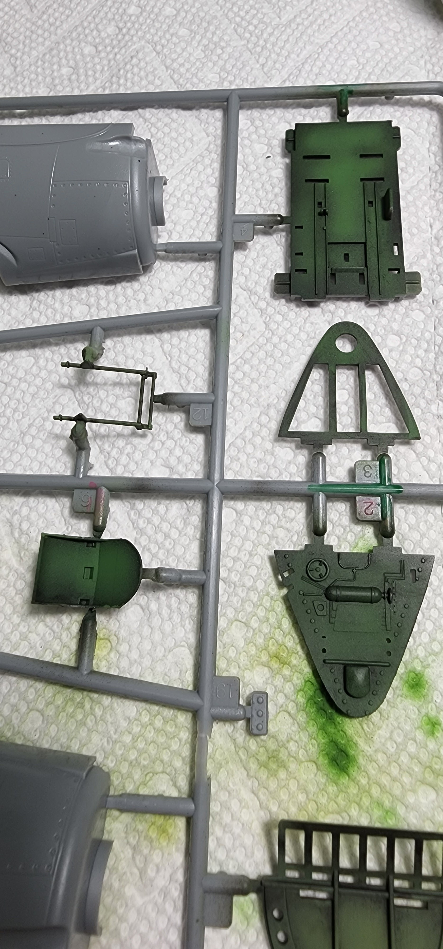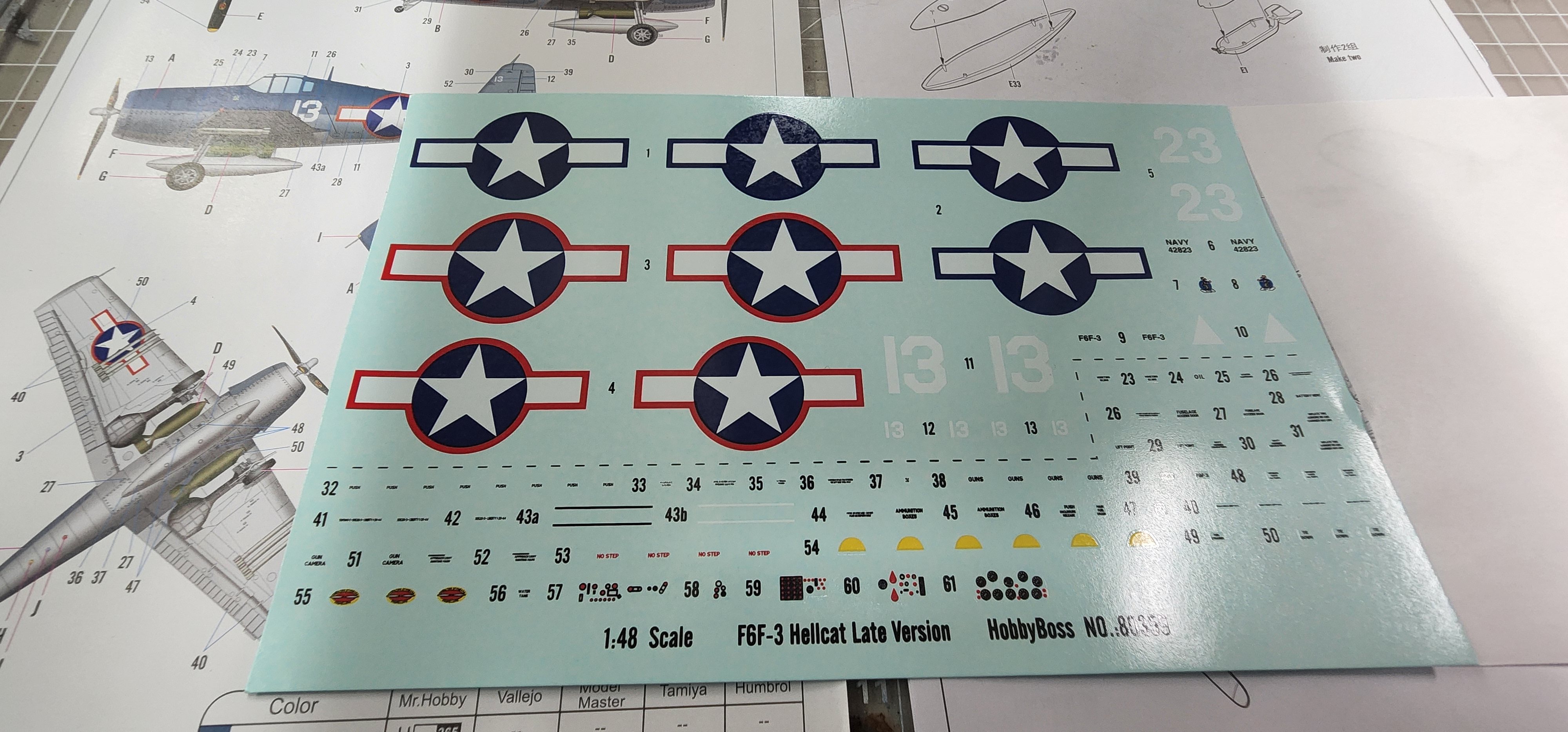 I am abandoning that silly little Heller 1/72 Hellcat I had started. What a horrible little model. I chose the Hobby Boss late version to start instead. I am not sure I have opened a kit this nice before. The detail level is eye popping to me. The clear parts were wrapped in foam cushioning then sealed in a plastic bag. That is a first for me. The cowl was as well along with a part of the motor with delicate parts that could break off. Anyway, that level of care is new to me. With what model kits cost these days I think it is a great idea and they all should do it (and they might as far as I know...it has been years since I opened a newly boxed model kit. The Mustang build was boxed in 1994). I have included shots of the sprues, instructions, and very nice decal sheet in case you are interested in seeing that. I have researched the crap out of this plane as far as my internet skills will go and have some great photo references. I washed all of the pieces and dried them. I have the cockpit pieces based in Tamiya black X-1 thinned 50/50 with alcohol. That thinning suggestion has made ALL the difference in my airbrushing experiences. That tip alone was worth the price of admission!