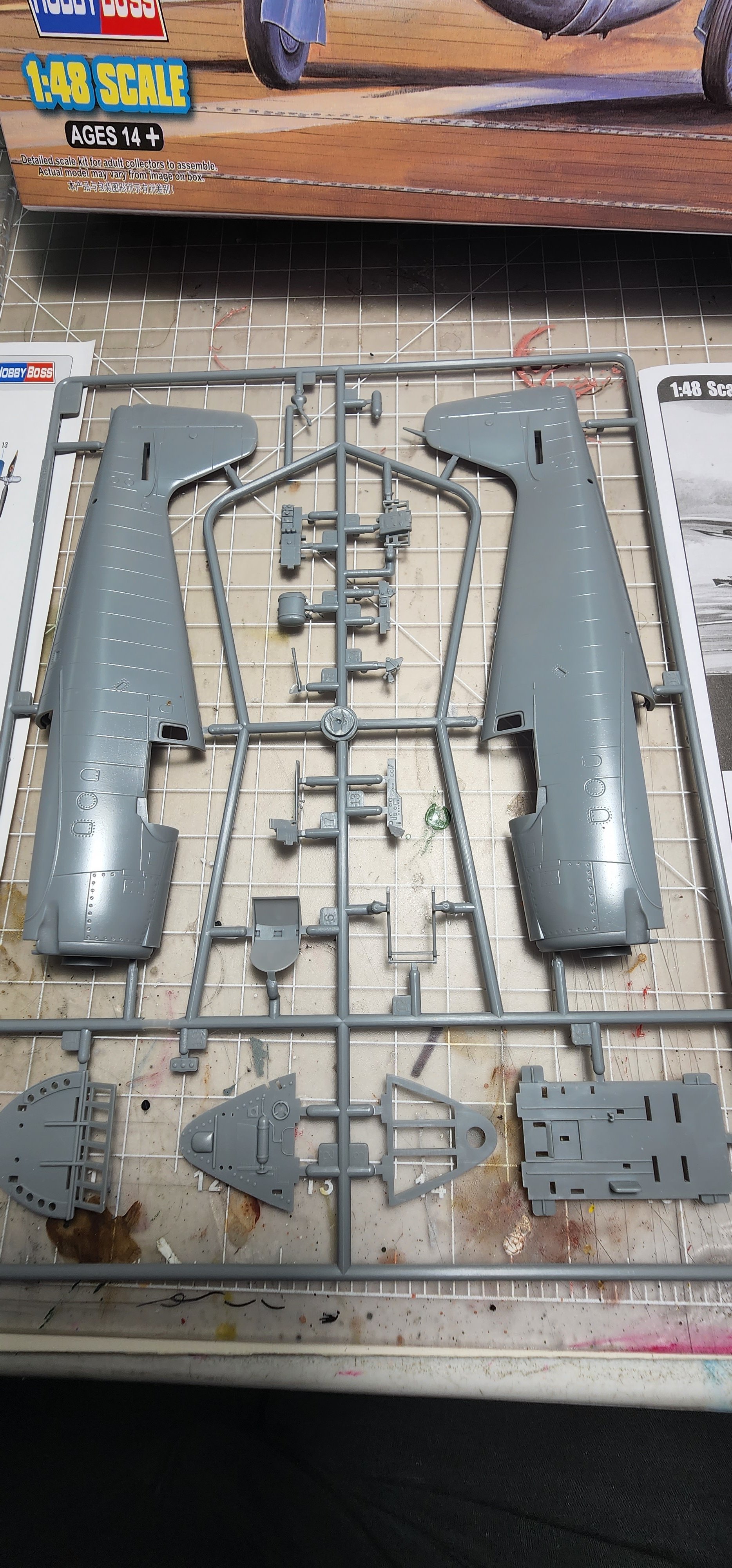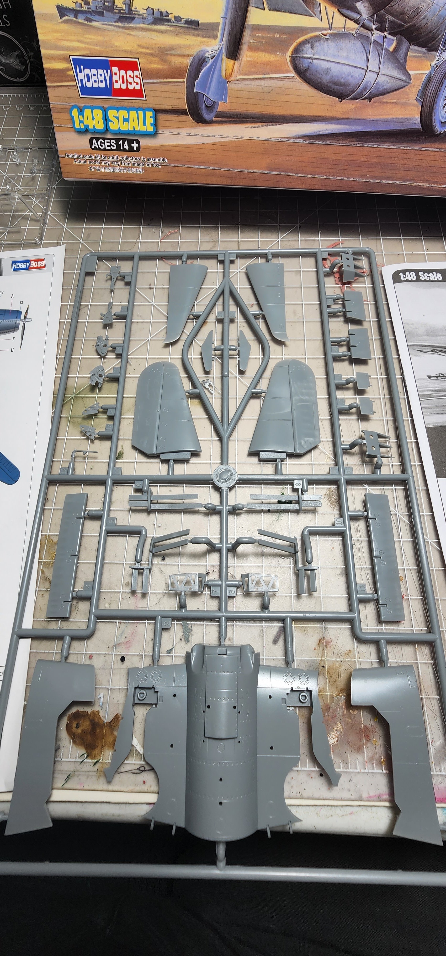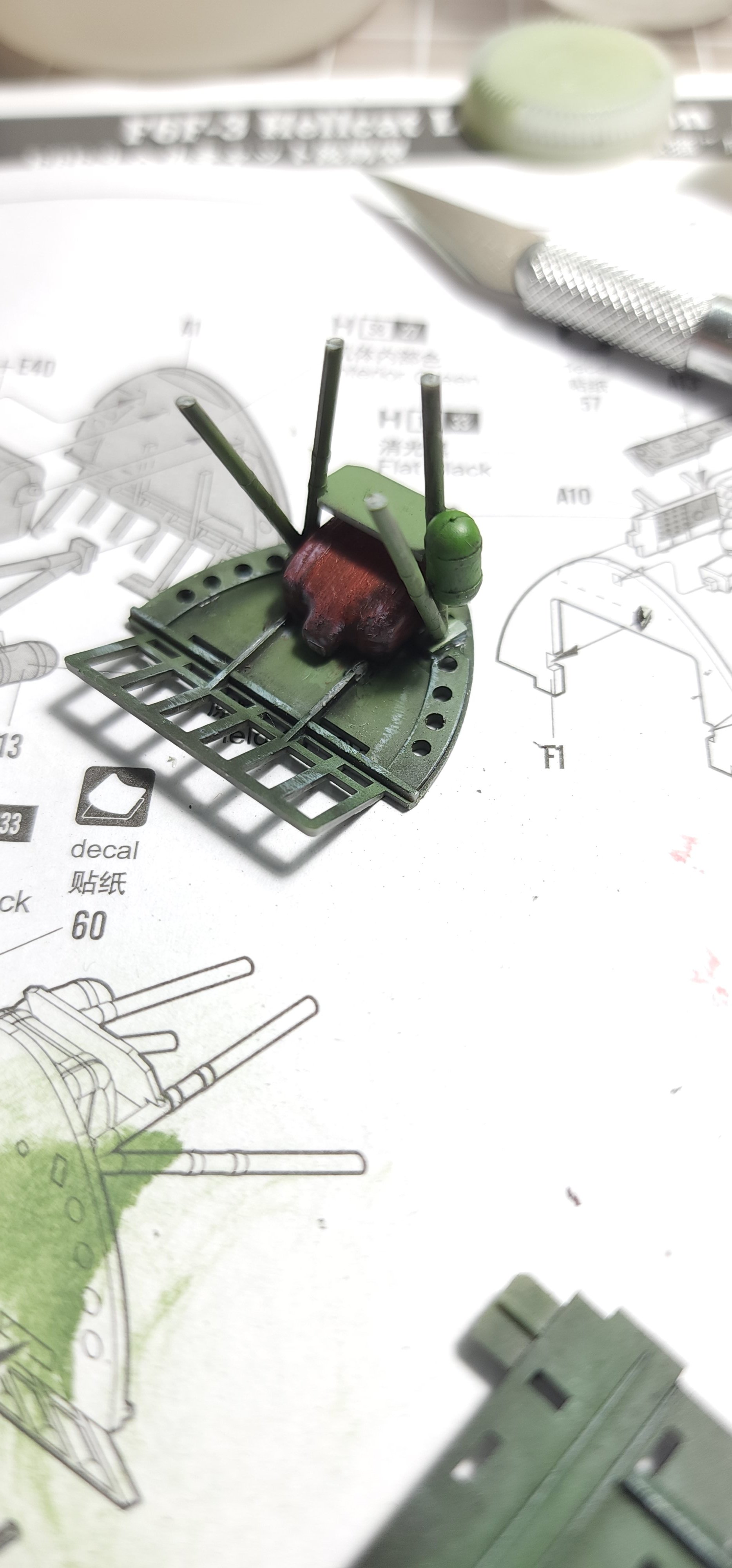 I am abandoning that silly little Heller 1/72 Hellcat I had started. What a horrible little model. I chose the Hobby Boss late version to start instead. I am not sure I have opened a kit this nice before. The detail level is eye popping to me. The clear parts were wrapped in foam cushioning then sealed in a plastic bag. That is a first for me. The cowl was as well along with a part of the motor with delicate parts that could break off. Anyway, that level of care is new to me. With what model kits cost these days I think it is a great idea and they all should do it (and they might as far as I know...it has been years since I opened a newly boxed model kit. The Mustang build was boxed in 1994). I have included shots of the sprues, instructions, and very nice decal sheet in case you are interested in seeing that. I have researched the crap out of this plane as far as my internet skills will go and have some great photo references. I washed all of the pieces and dried them. I have the cockpit pieces based in Tamiya black X-1 thinned 50/50 with alcohol. That thinning suggestion has made ALL the difference in my airbrushing experiences. That tip alone was worth the price of admission!