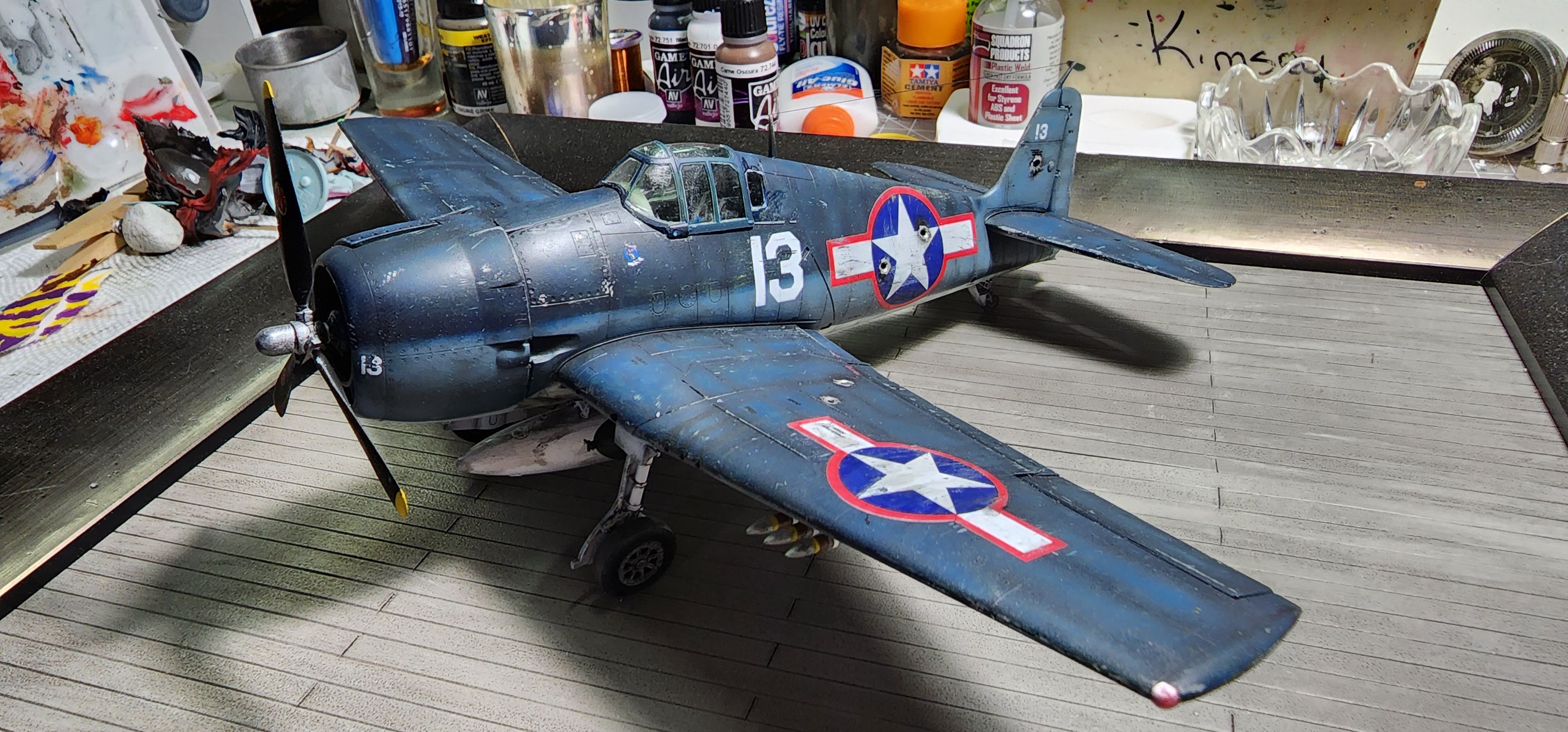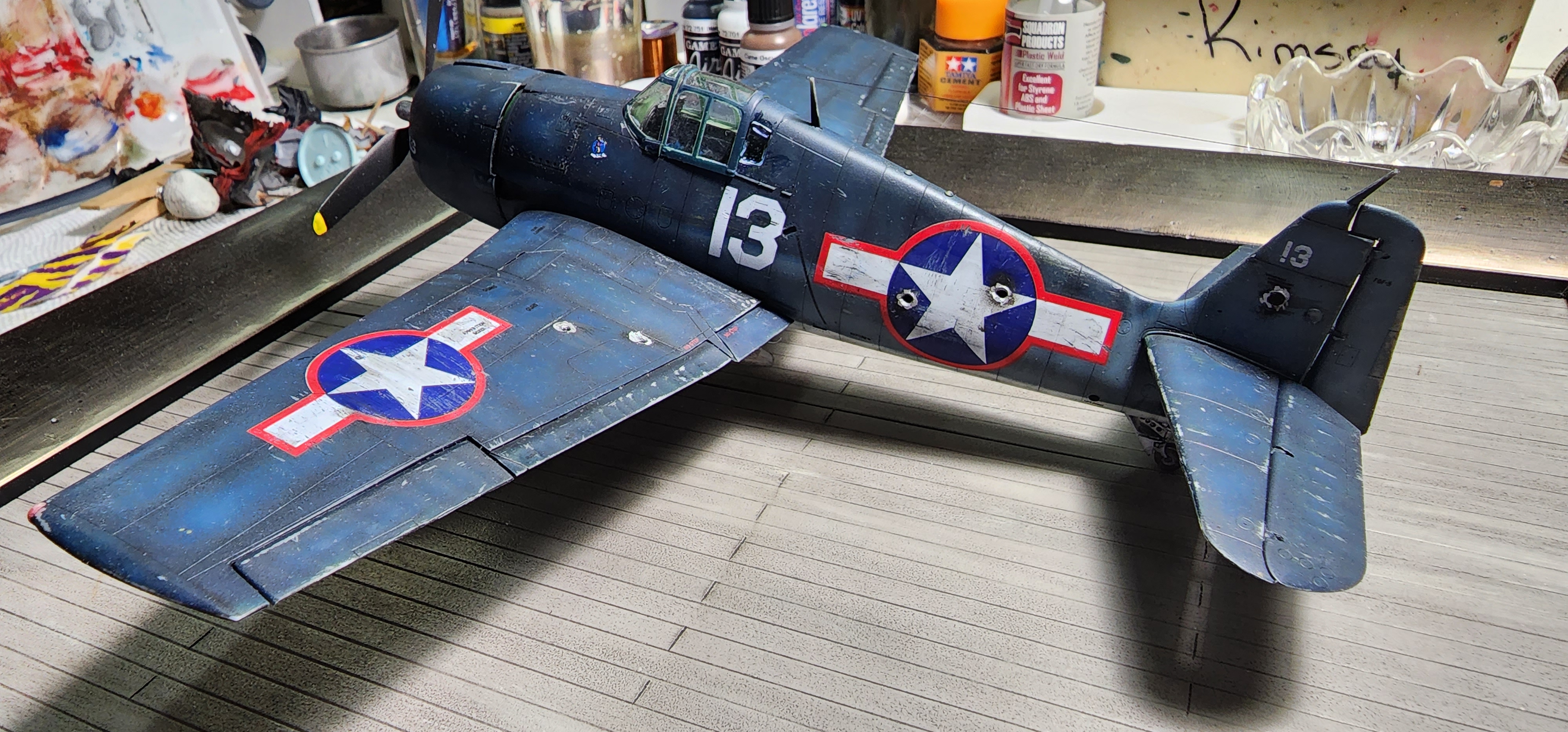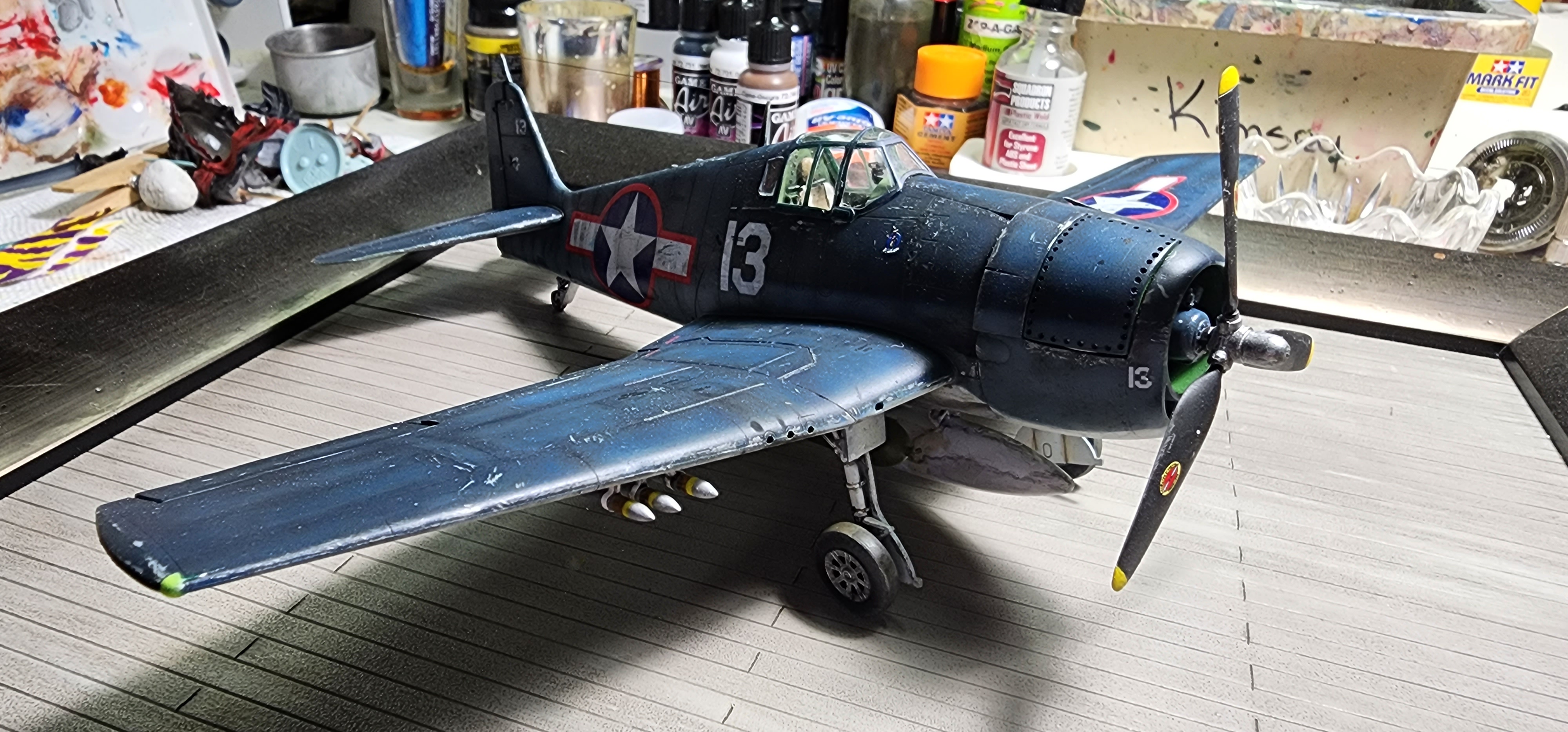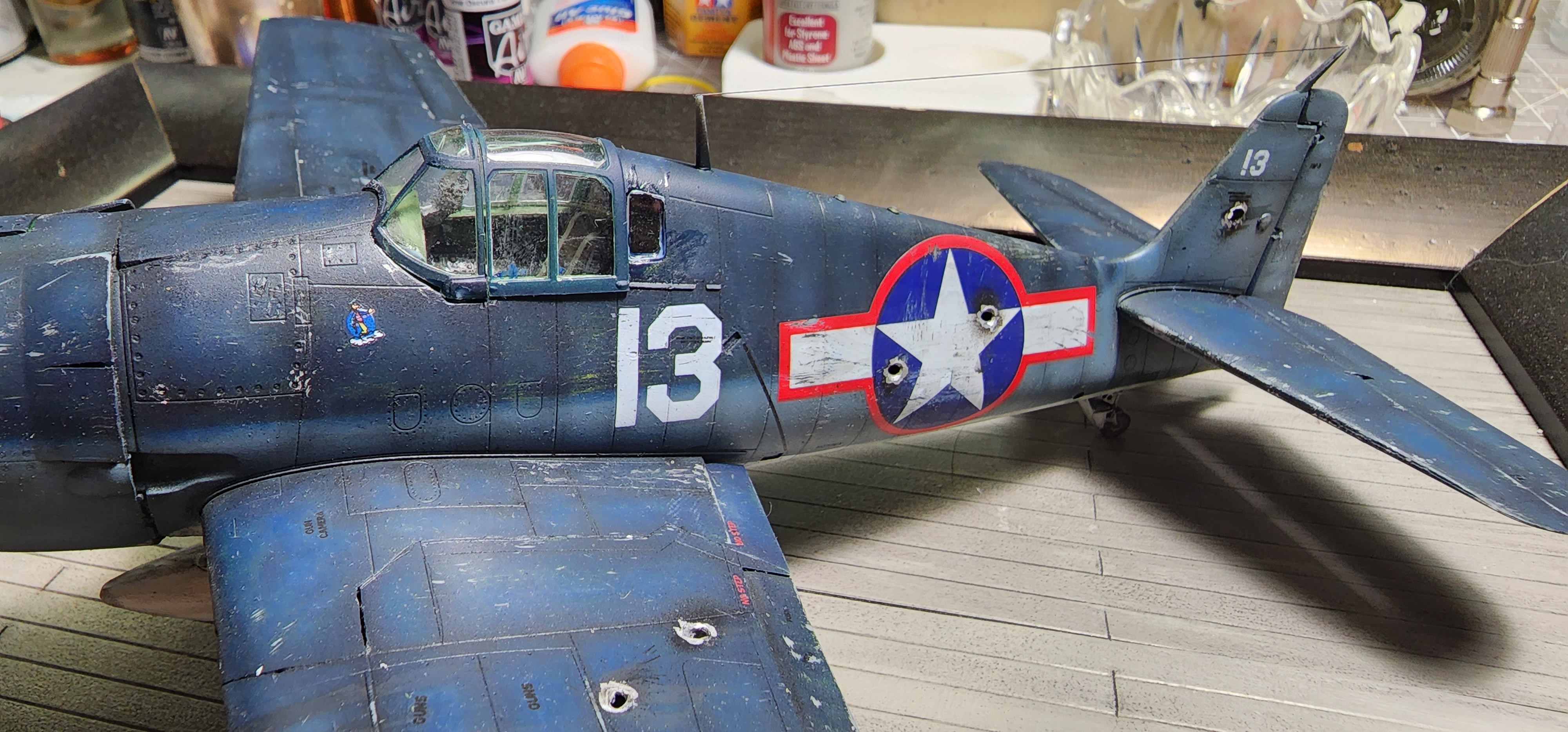 IF memory serves, this is one of Butch O'Hare's airplanes. This is a F6F-3, circa 1943. The black and white picture doesn't make the red surround on the national insignia look very red, do it? This Hellcat was flown to the Grumman factory in Bethpage, NY to show the factory employees how much damage their product could absorb and still bring it's pilot back to the ship. We are led to believe the WAVE posed in the cockpit was the pilot that flew Butch's well ventilated mount to the Grumman plant. Not only tough, but forgiving and easy enough for a girl to fly.Well, it's critique time. There are certainly some issues! Other than adding a mechanic I think it is finished. It got a little shot uo in the process. I practiced making bullet holes on the little Mustang carcass. I now know that I should make them before assembly to grind down the thickness of the plastic from the inside with a dremel. That would have taken fore-thought! Anyway, see what you think...