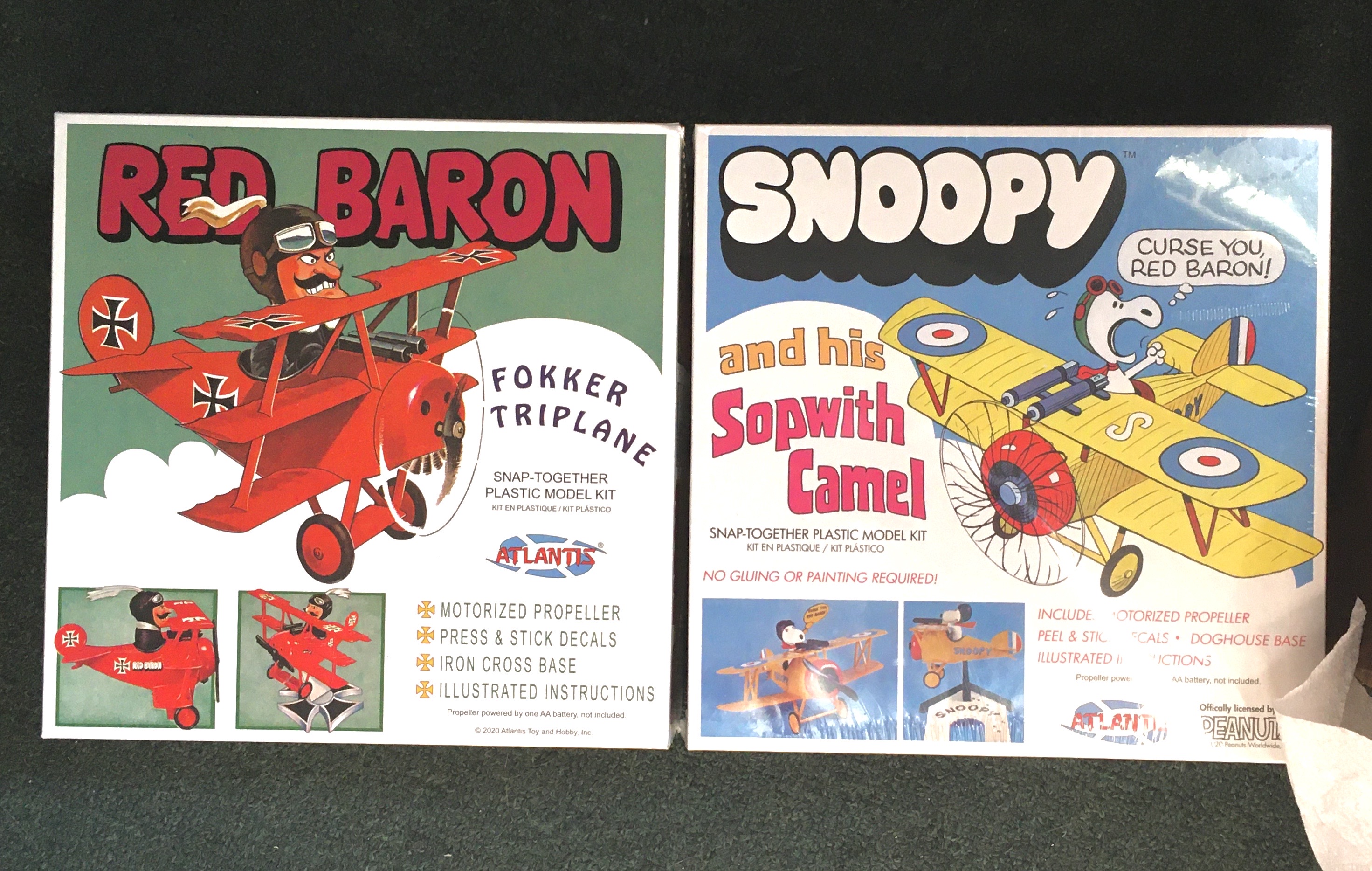 Atlantis reissued the old 1970 Monogram kits this year! Snoopy and I flew endless hours over the trenches together. I bugged my Mom daily for another AA battery! The Red Baron Kit contents were undamaged and the box matters not, because I really am going to play with these UM!! Rather build them!!! I have my own AA batteries now! No cordless mouse in our humble rural home is safe!