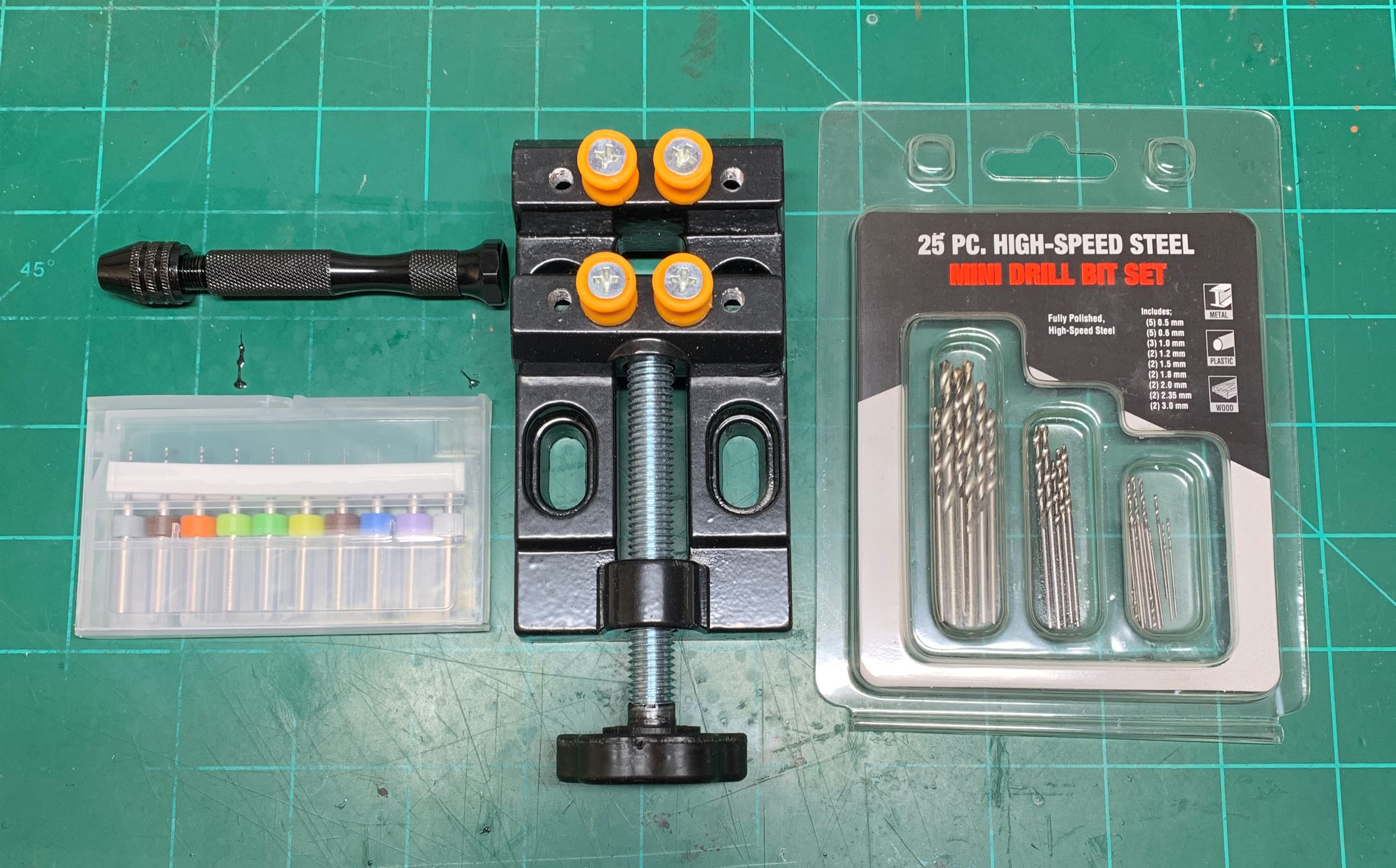 As I said, I have been using them since the mid 90's, but it is a different skill set than many folks have. I can and have just used a Dremel with the separate speed control to lower the speed down A LOT, and then drilled holes by hand. The trick is don't spin too fast and melt the plastic, and being able to hold it fairly still while drilling.Drill Bit City bits are a waste of money, if you don't have a drill press, they are useless. The reason for this purchase was the mini vise, but the high speed steel bits are really great for the money and the rest are just gravy. Not my first rodeo.