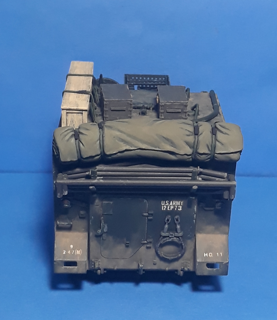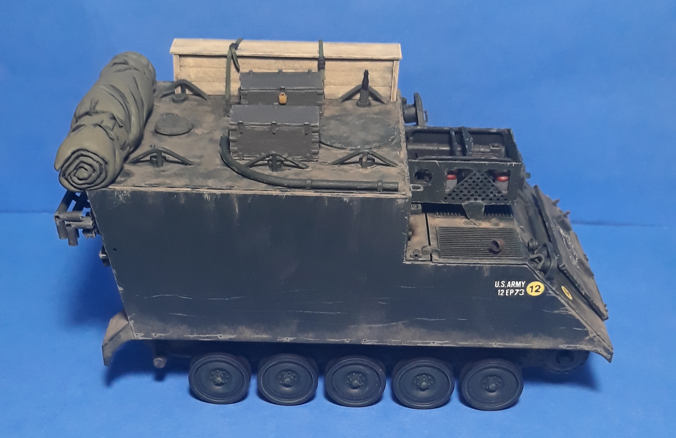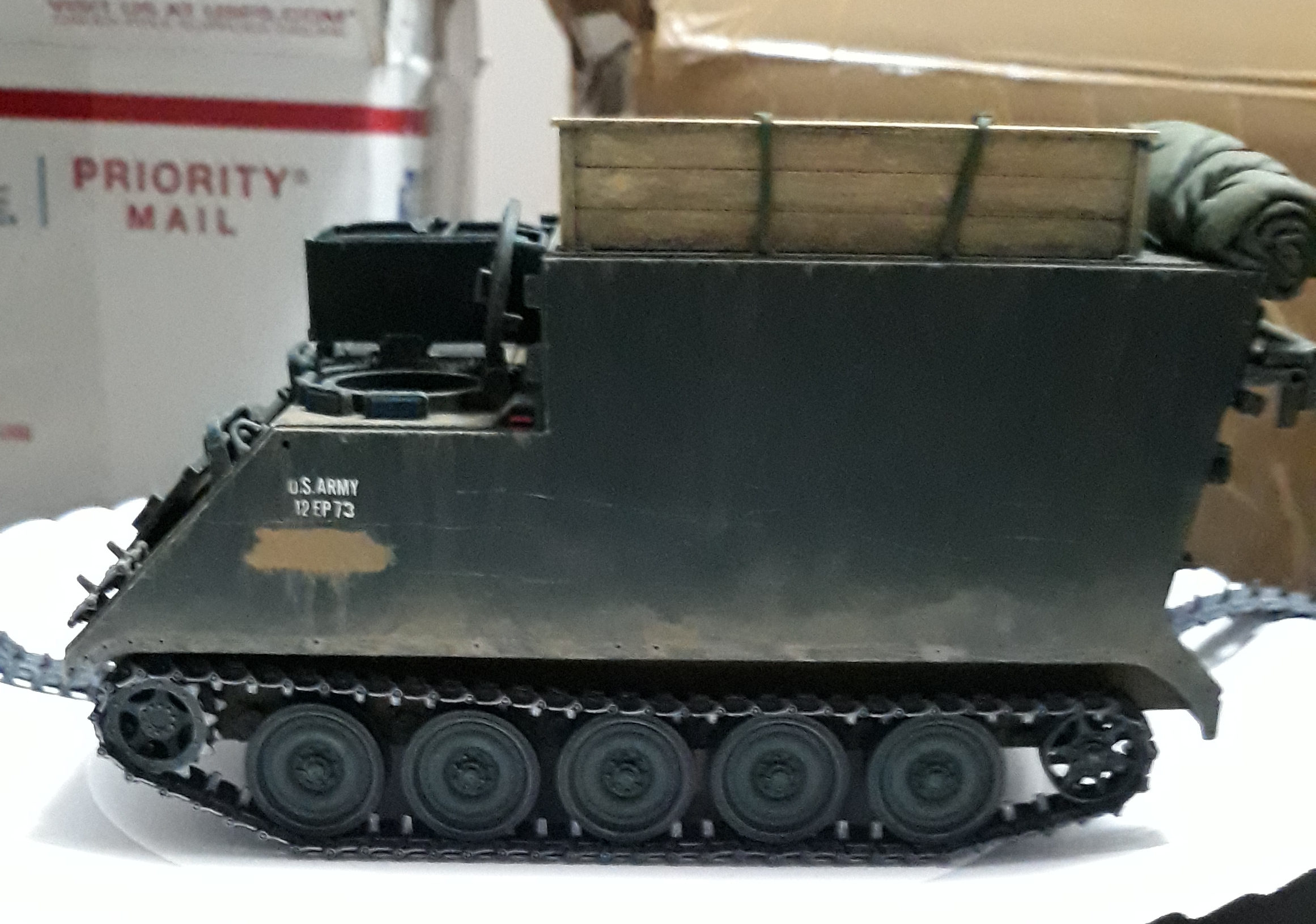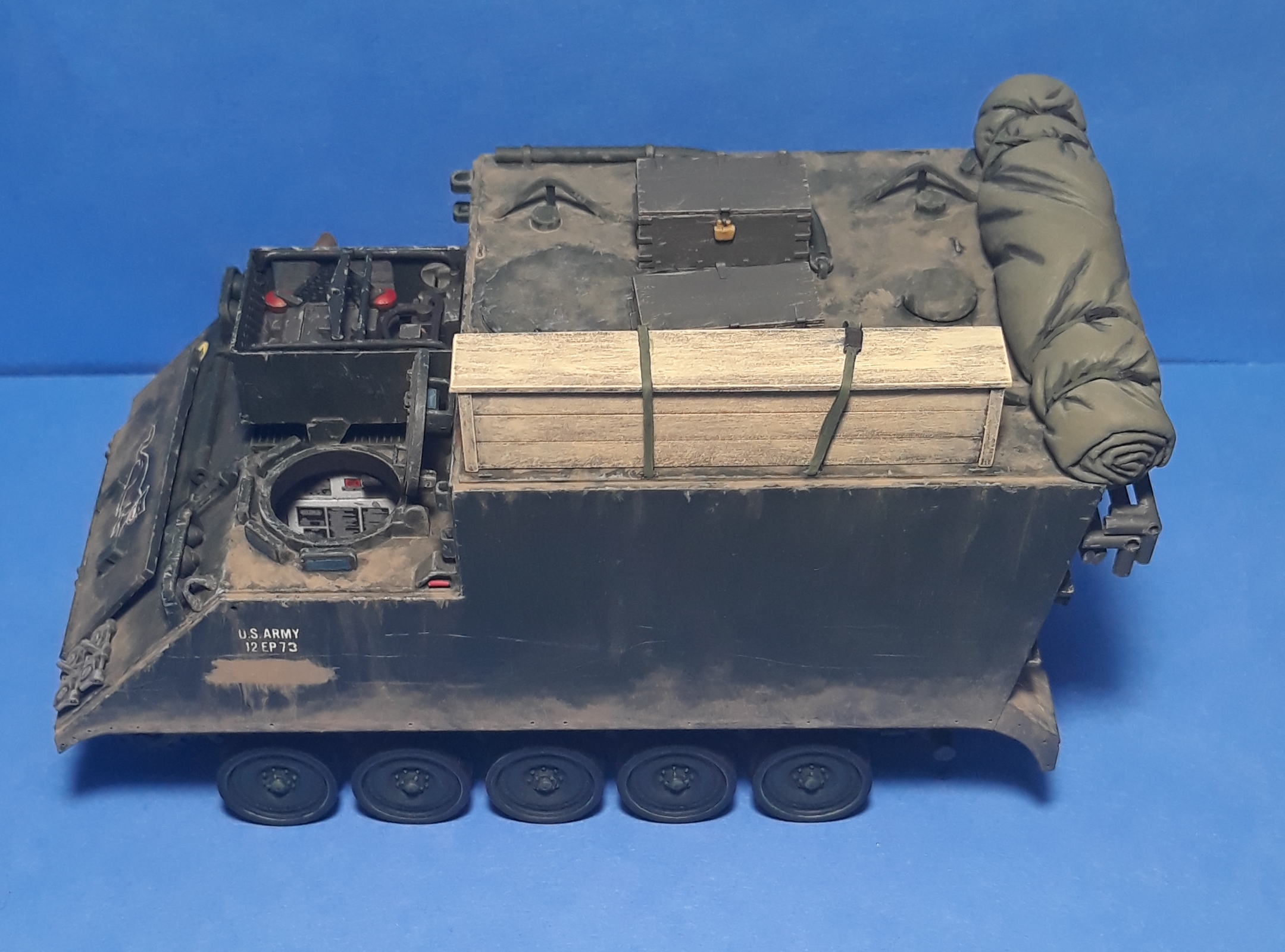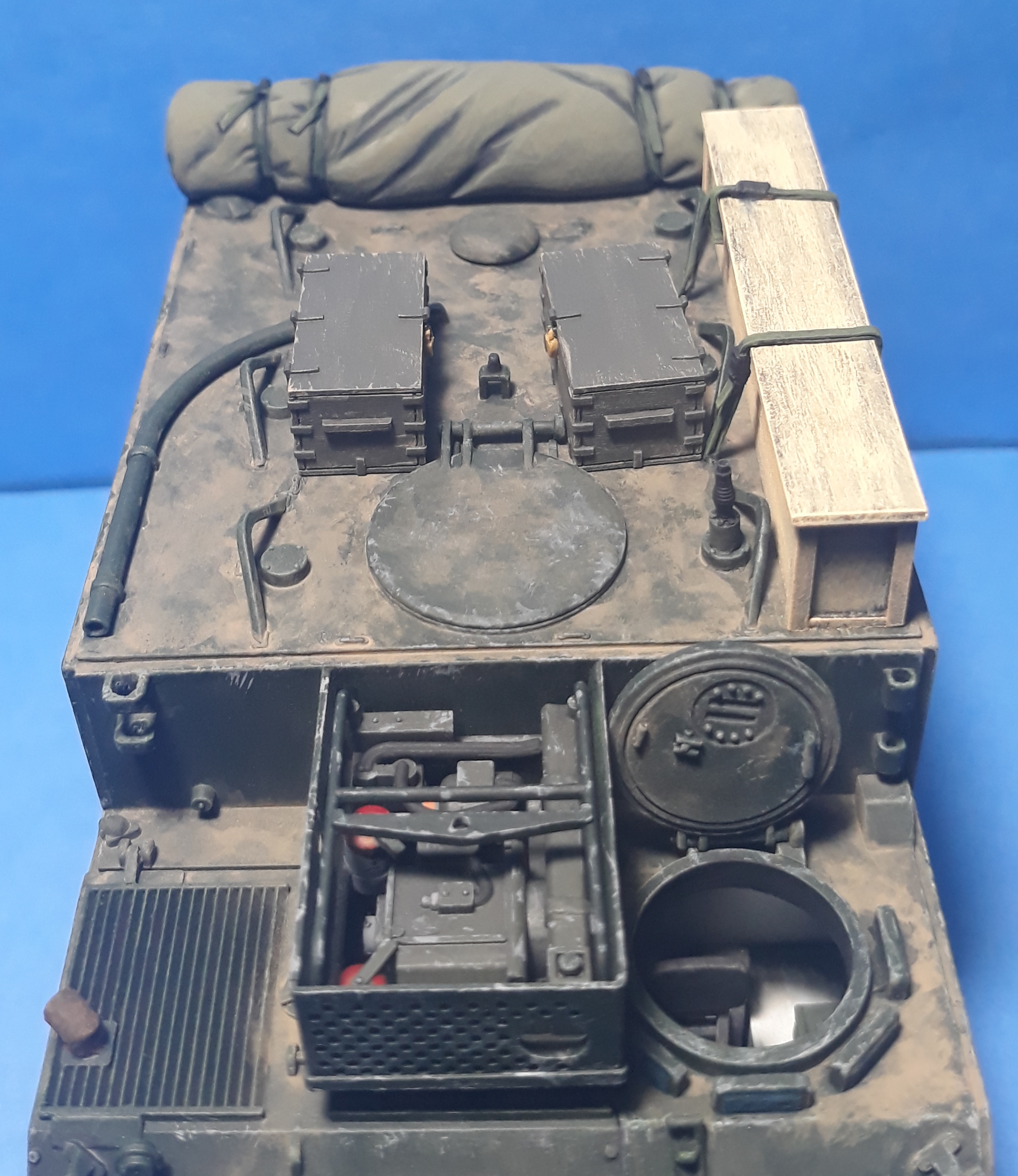 After these photos were taken, I glued the two footlockers to the roof. I still need to weather the tracks and road wheels, add the antenna, and place the shovel onto the front. I started working on figures last night and today.