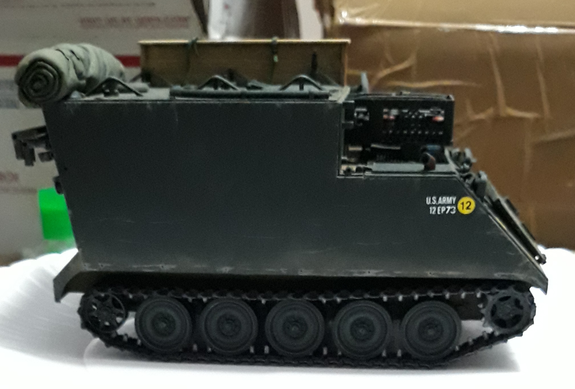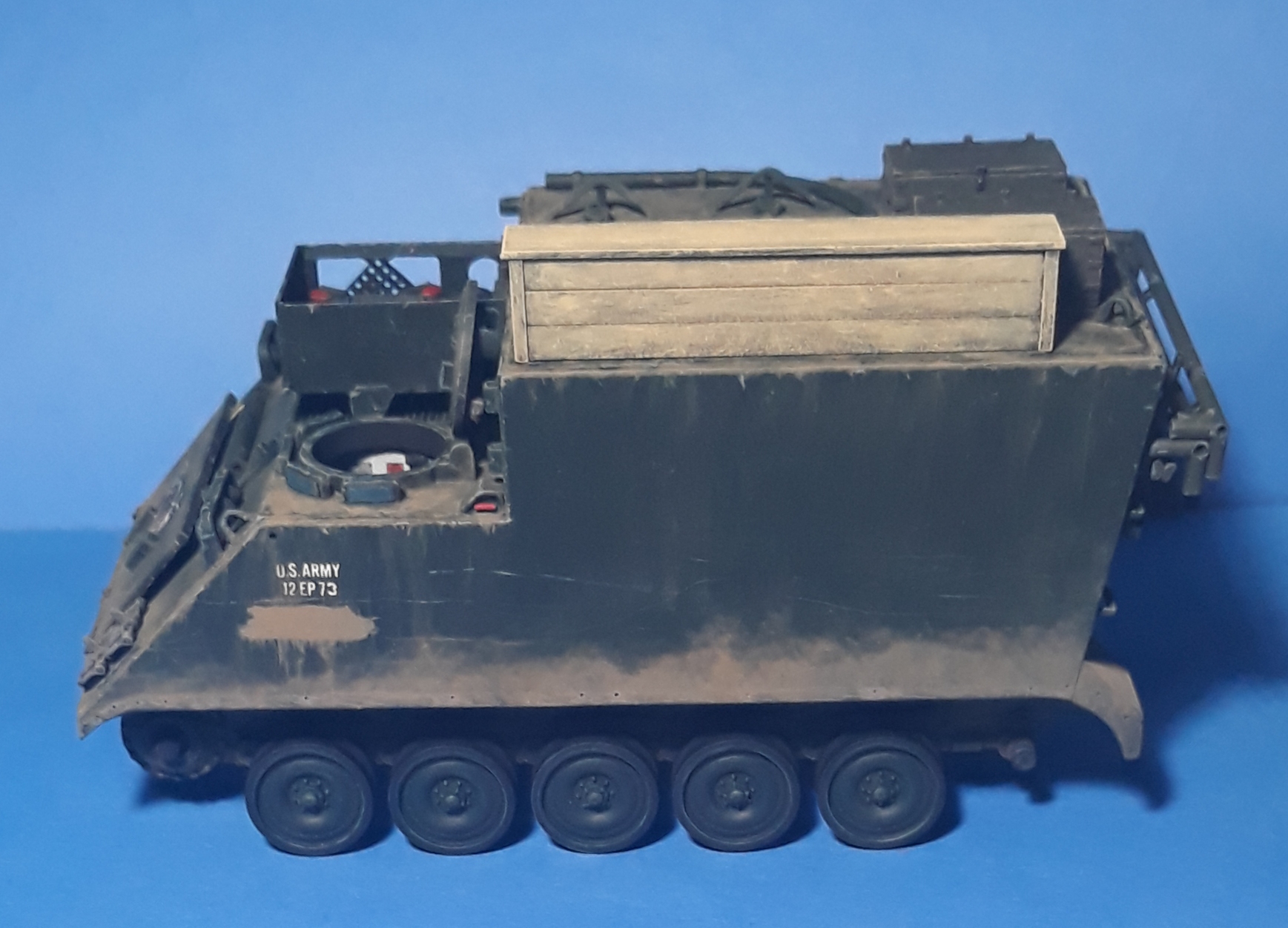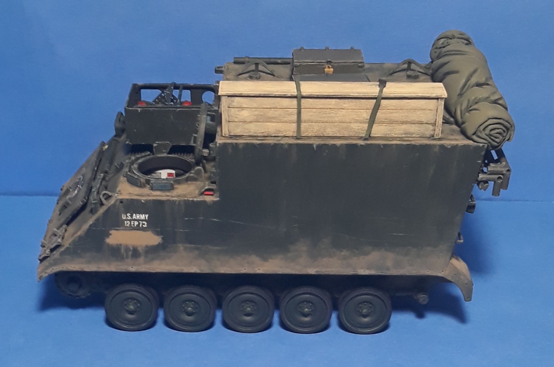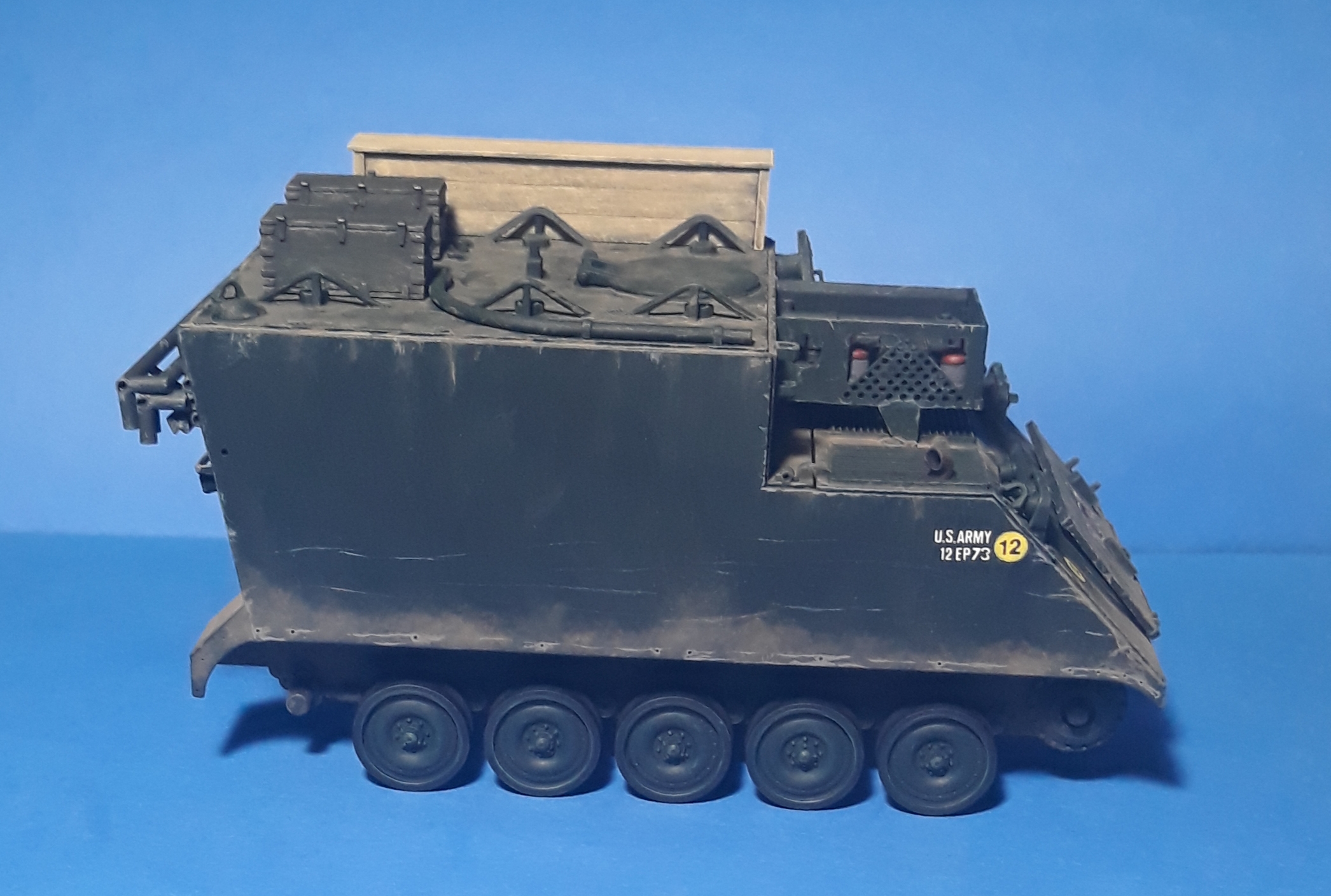 After these photos were taken, I glued the two footlockers to the roof. I still need to weather the tracks and road wheels, add the antenna, and place the shovel onto the front. I started working on figures last night and today.