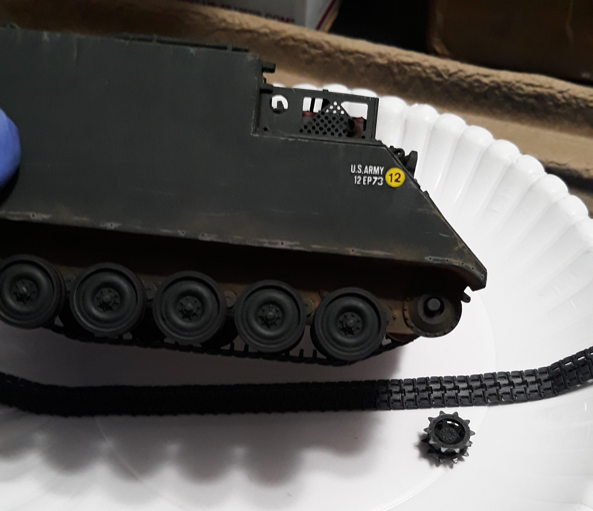The photos are not that great because of the lighting, but gives you an idea of what I have been working on now that the "Hootch Maid" vignette is complete. I used the 3D printed workable tracks from DEF Models. They were easy to remove from their supports and clean up. They also were connected quickly. I painted them and was ready to install them. I decided to go with the DEF Models idler wheel and the drive sprocket from ModelKasten's track kit since I had already installed the transmission and the DEF drive sprockets require the use of their own transmission.