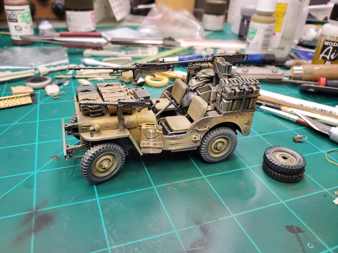 I really like that one of the wheels is a different style tire. Saw that in some photos of SAS jeeps but i'm not sure where that wheel came out of, I've dug into a lot of different resin sets for this.