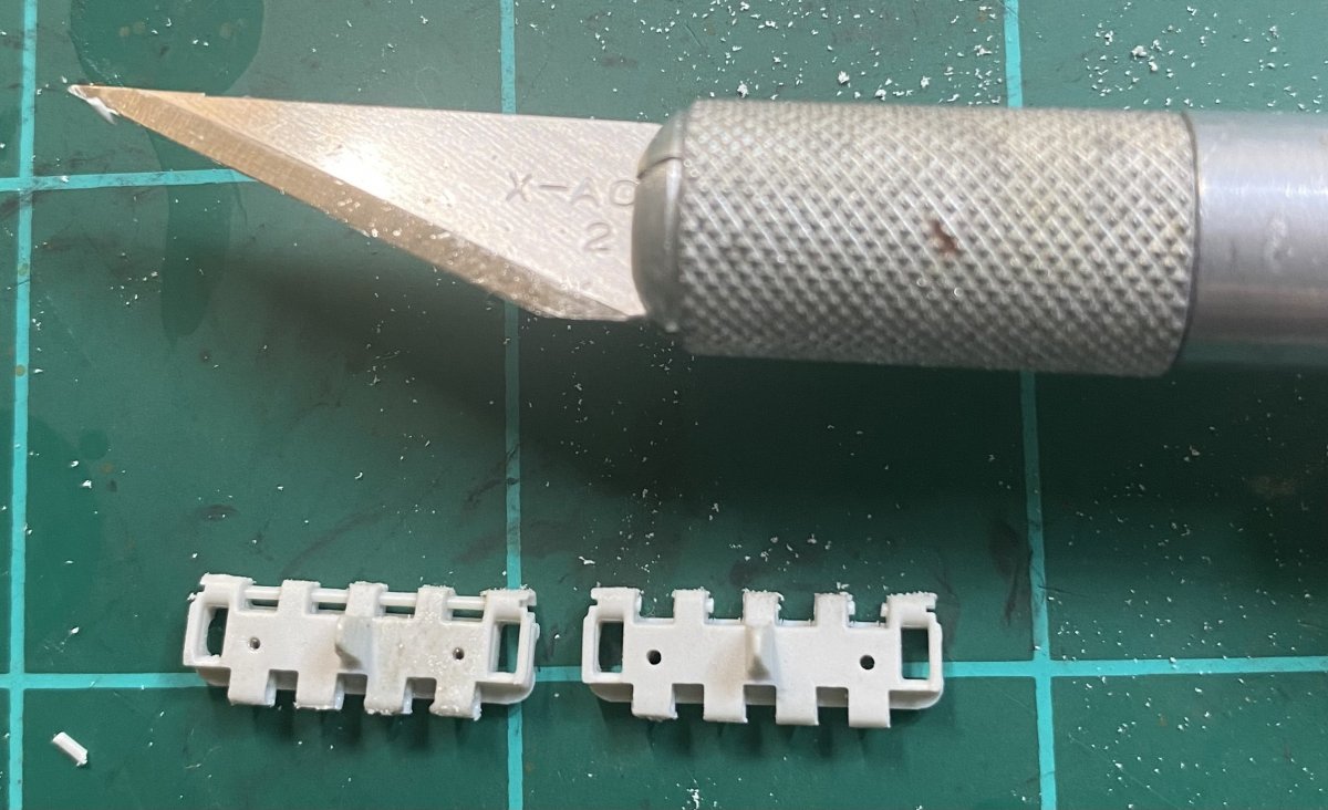 I struggled heavily with this. As this models tracks are different from other Merkava modes, basically my only option are metal links. Current lack of EBay access (long story) means Fruils which are nearly the cost of the kit when delivered. My way to deal with this is going to be to build the links, then cut out the ‘track pins’ (as shown) and press together. It’s going to be laborious but I think this will work. At least, it’s worth a shot