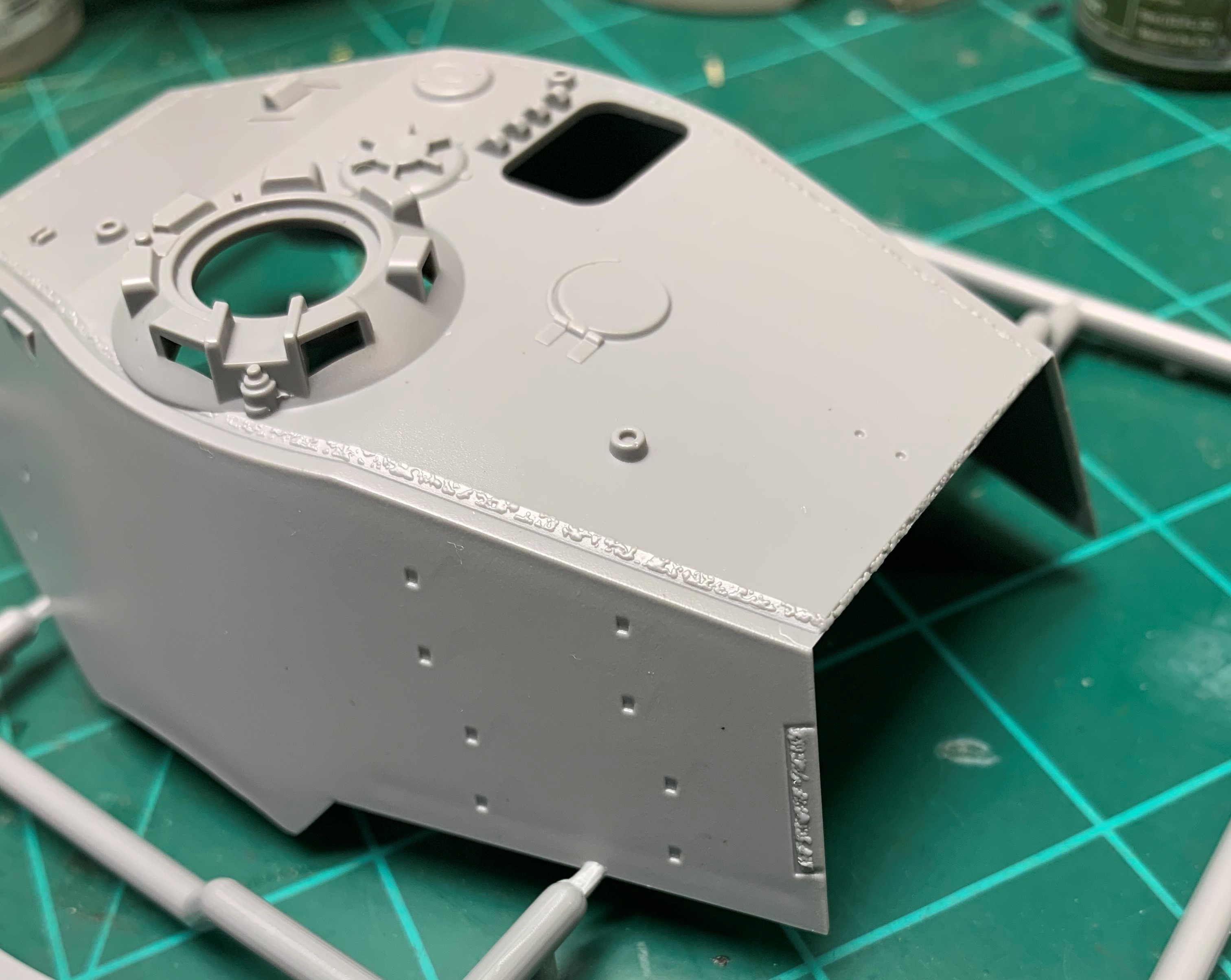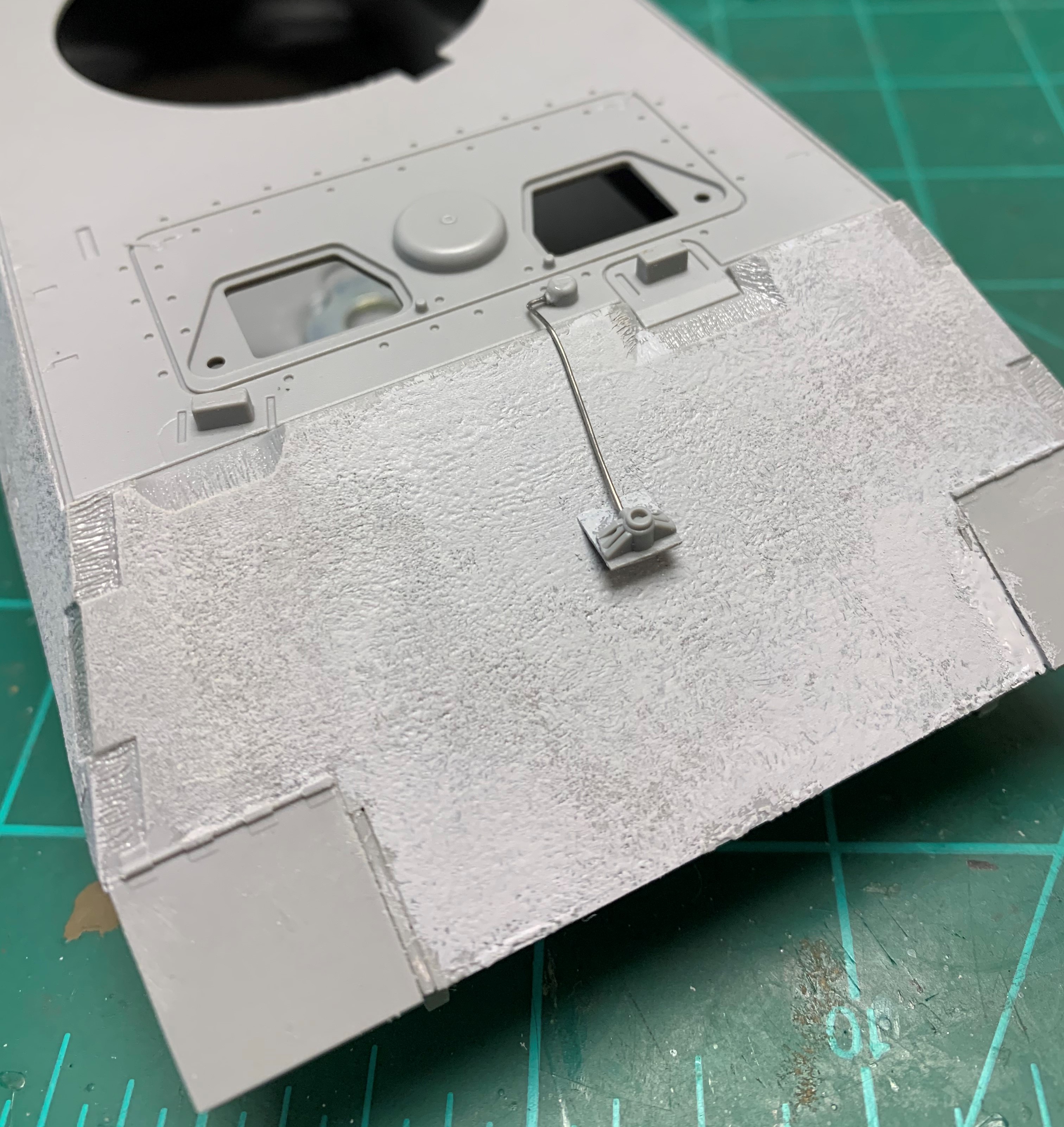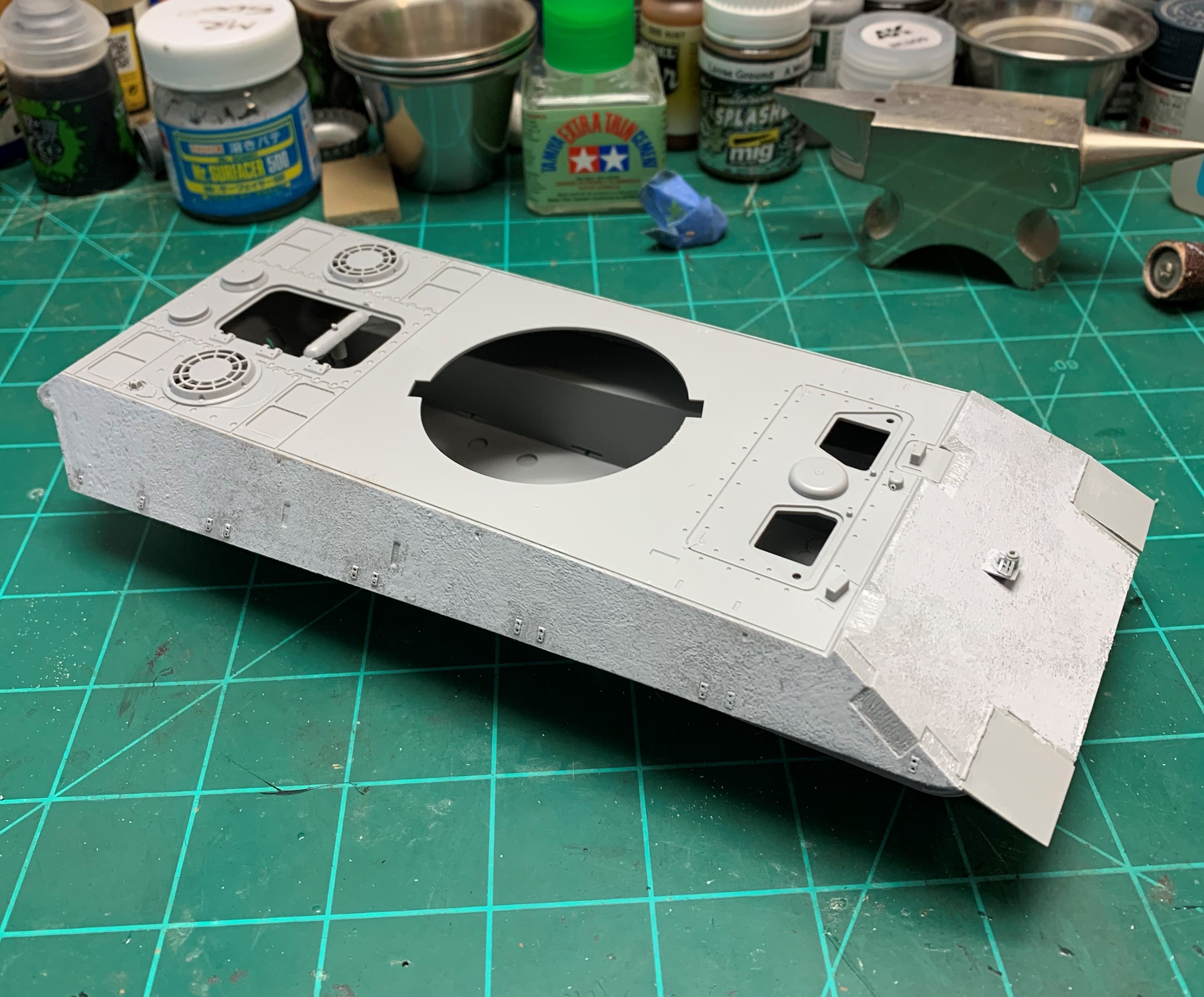 No flame cuts on the frontal armor, so I'll add some. Having been corrupted by Cousin Eric and Uncle Nightshift, I decided to add texture to the armor plate, using Tamiya Extra Thin Cement and a stiff brush, followed by a quick stipple of Mr Surfacer.
