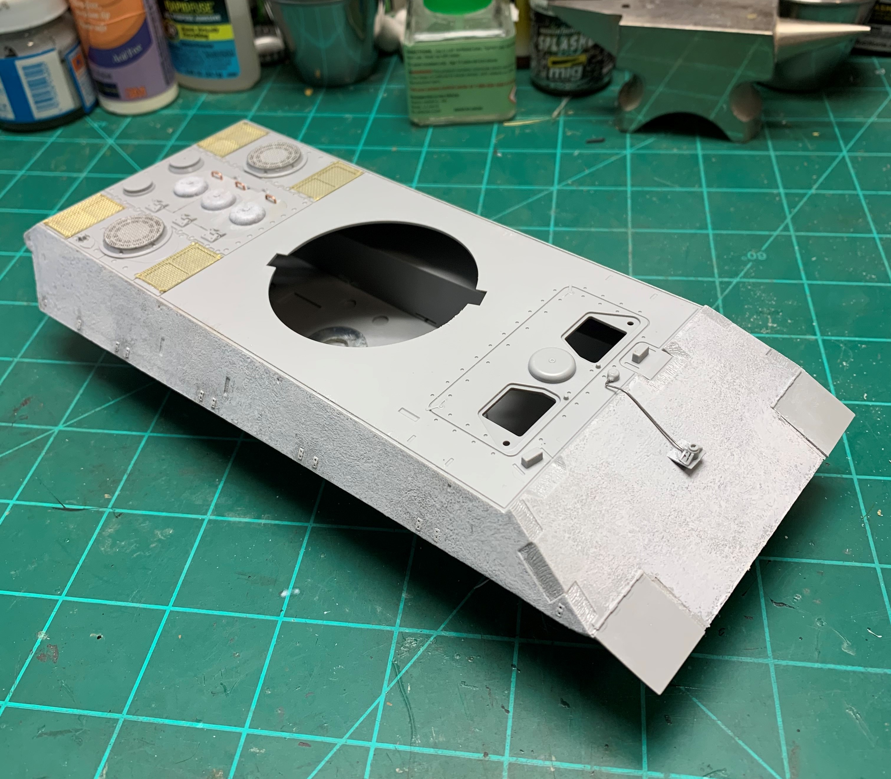 Wrapping up the upper hull with copper grab handles and leftover PE mesh screens. I did find an old Voyager Model PE set for a Jagdtiger that I will pirate parts from.