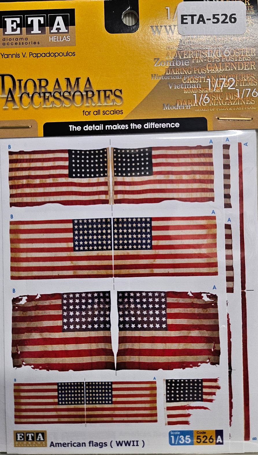 Next Up I will be weathering the tracks and wheels, mounting them and some STAR Decals before continuing the painting process. The top tank on the decal sheet is the one that I will be doing and it refers to this tank having a US flag hanging off the back, so I thought, 'that would look interesting and bring some color at the same time' - bring out the ETA US flags set which is really, very nice with the images being printed worn and torn for dioramas.