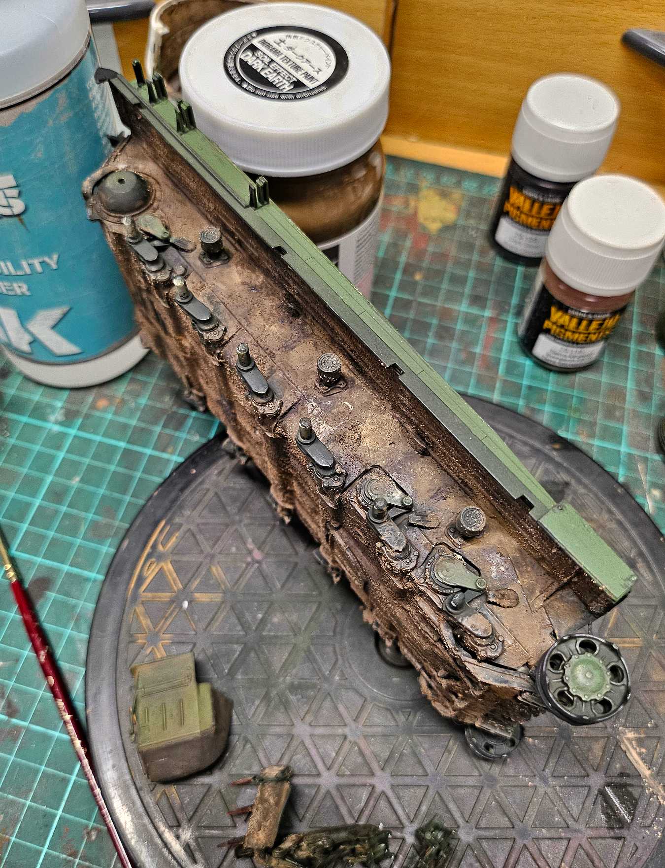 I sealed this with AK Ultra Flat coat, then gave it a layer of chipping fluid before spraying and additional layer of Russian green over the top. This was then chipped away with water and a tooth pick.