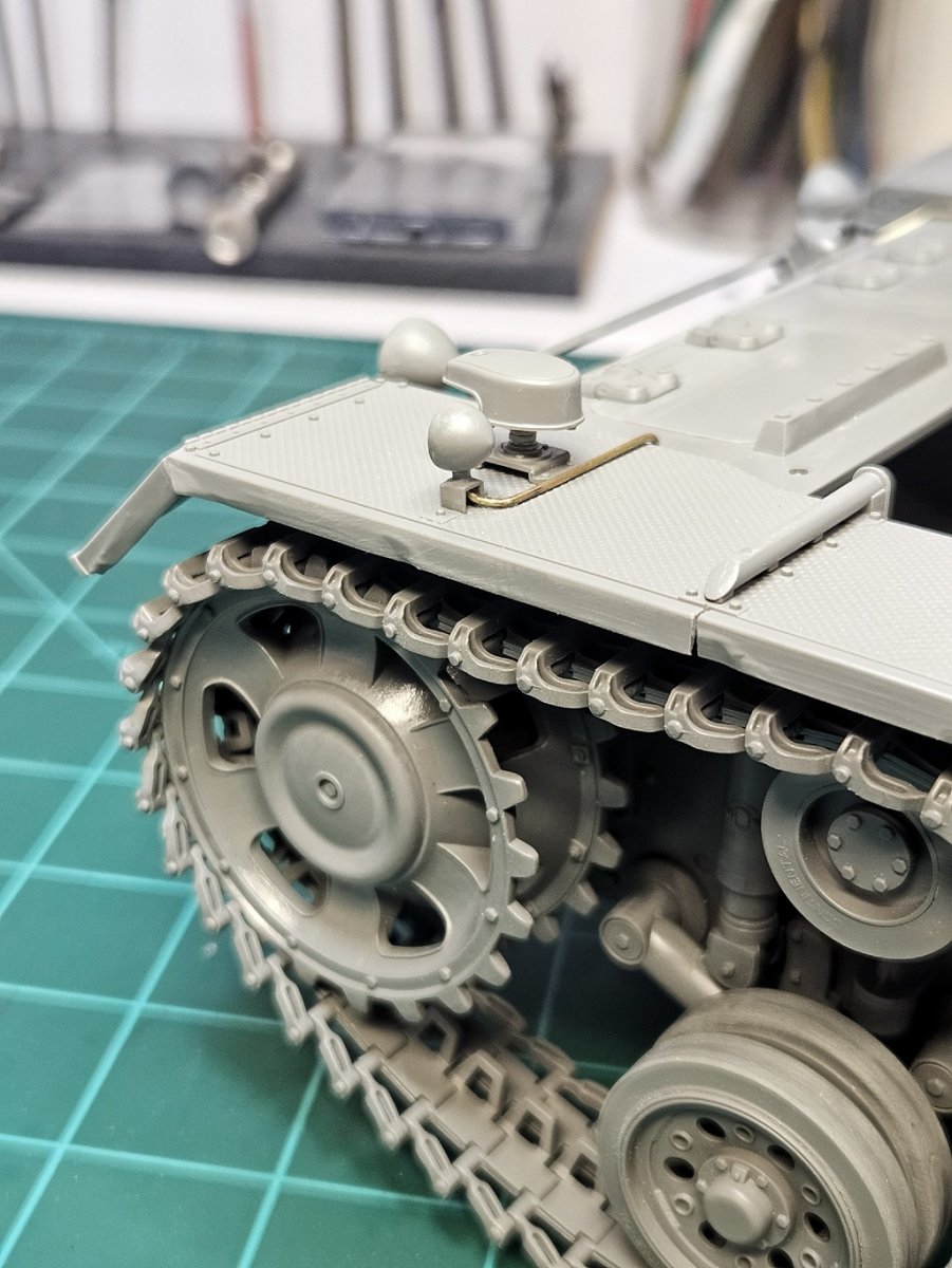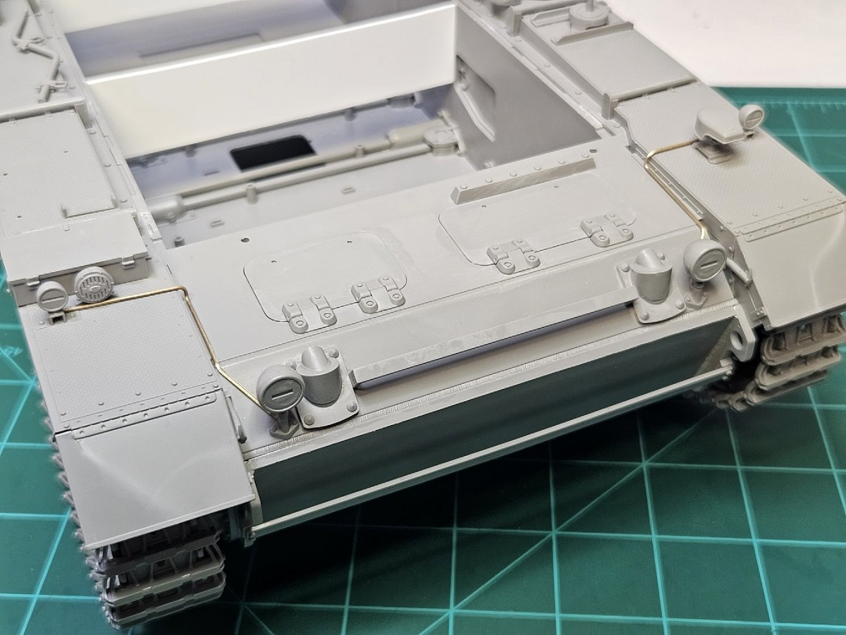 Moving to the upper hull. The extra armor plate is on. I didn't add it as the instructions show how to as that looked like a good way to get into trouble. There's 13 pieces that make up this plate. Which means a number of ways to screw up and get it crooked. This kit is not a walk in the park. Almost every part needs tweaked to fit. Anyway it's on and straight. I decided to add some battle damage to the this plate. I've also put some texture on the whole structure with Mr. Cement S.(I'll add it to every part thats not sheet metal) It's not cast steel, but at this scale I feel like it needs something.